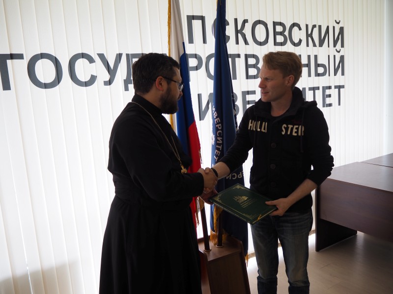 29 мая 2019 года, во второй день поездки в город Псков, участники проекта «Жемчужное ожерелье Святой Руси» презентовали его в Псковском государственном университете. Во встрече приняли участие специалист отдела по работе со студенческими организациями Управления по молодёжной политике ФГБОУ ВО «Псковский государственный университет» Олег Владимирович Никифоров и представители студенческих организаций университета.