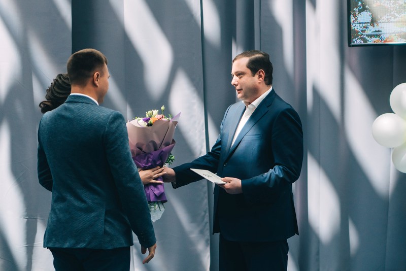 Губернатор Алексей Островский поздравил присутствующих и вручил свидетельство о заключении брака «новоиспеченной» семье.