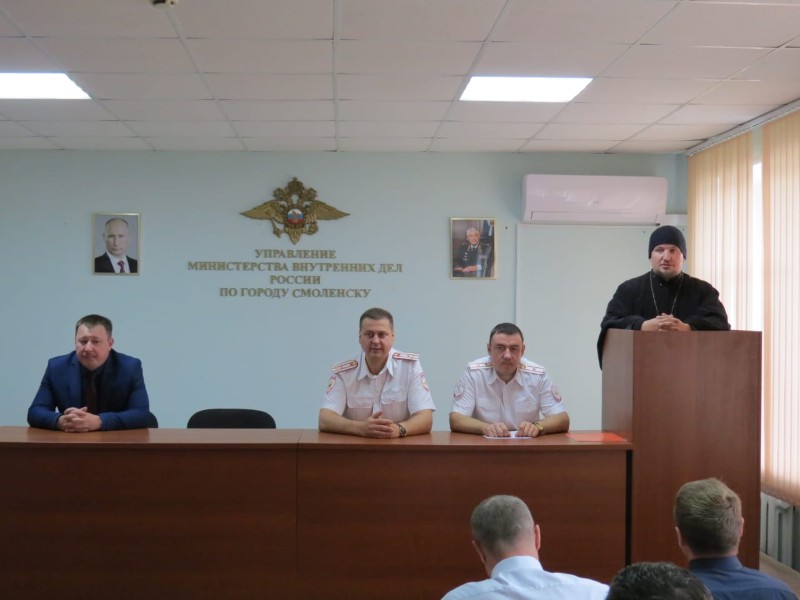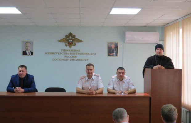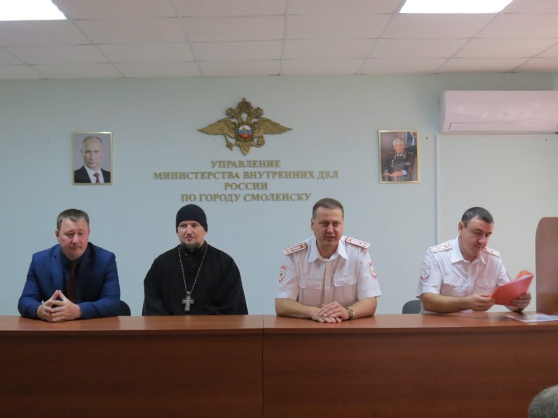 В нем приняли участие: временно исполняющий обязанности начальника УМВД России по г. Смоленску полковник полиции А.Ю. Черноусов, начальник следственного управления УМВД России по г.Смоленску полковник юстиции Ю.Ф. Устинко, член Общественного совета при УМВД России по г. Смоленску, руководитель миссионерского отдела Смоленской епархии протоиерей Георгий Свитцов, а также помощник начальника УМВД России по г. Смоленску – начальник ОРЛС майор внутренней службы Р.В. Корешков, руководители и личный состав УМВД России по г. Смоленску.