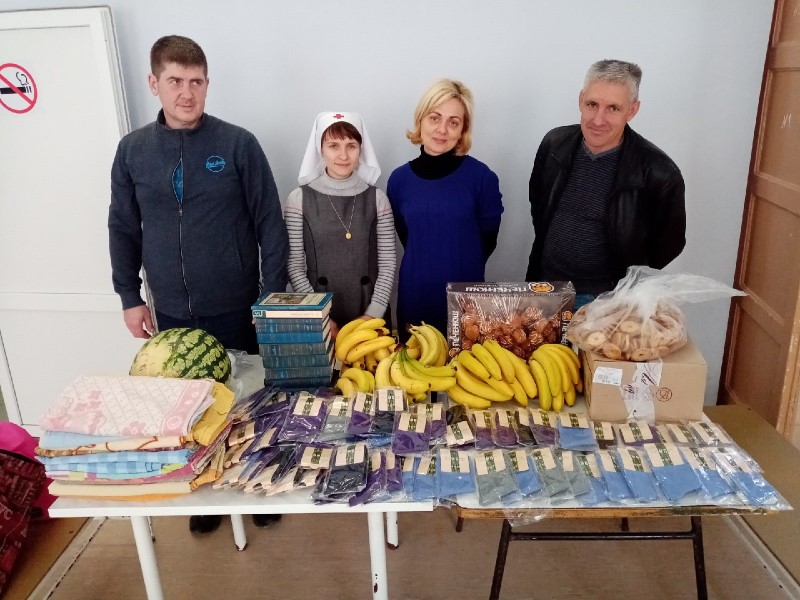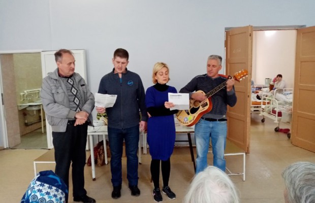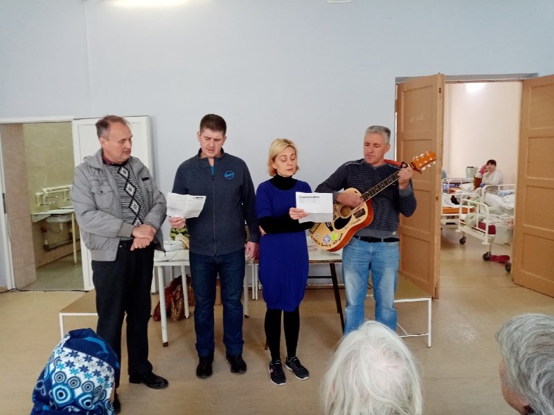 На сей раз они приехали в Гедеоновку с подарками и гостинцами для пожилых женщин: привезли им носочки, книги, постельное белье, бананы и печенье. Не забыли и о концертной программе, которая традиционно началась с общей молитвы. А потом пели самые разные песни: от детской «От улыбки станет всем светлей!» до «Все пройдет» из репертуара Михаила Боярского под гитару. Бабушки в долгу не остались – спели в ответ «Ой, мороз, мороз», также добровольцы и подопечные вместе исполнили «Катюшу» и «Десятый наш десантный батальон». В дополнение к музыкальной программе читали стихи протоиерея Андрея Логвинова. А еще раскрашивали раскраски восковыми карандашами. Праздник удался. Все остались очень довольны.