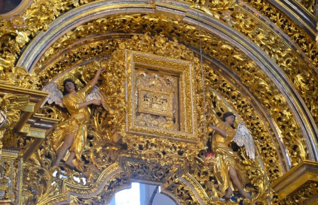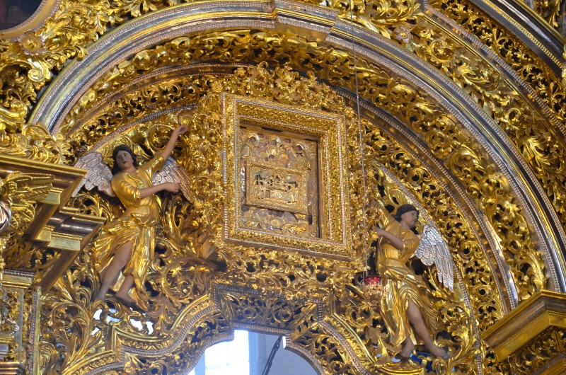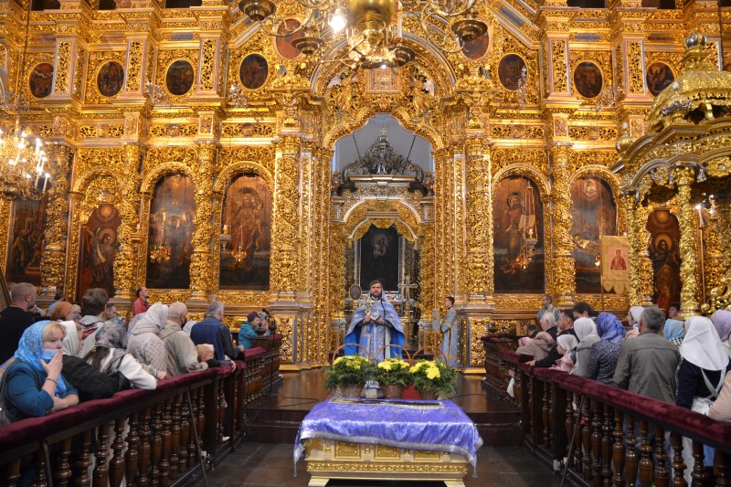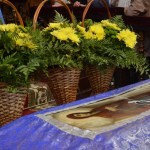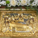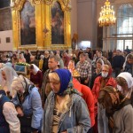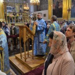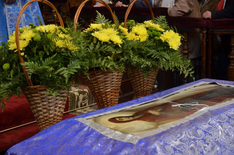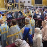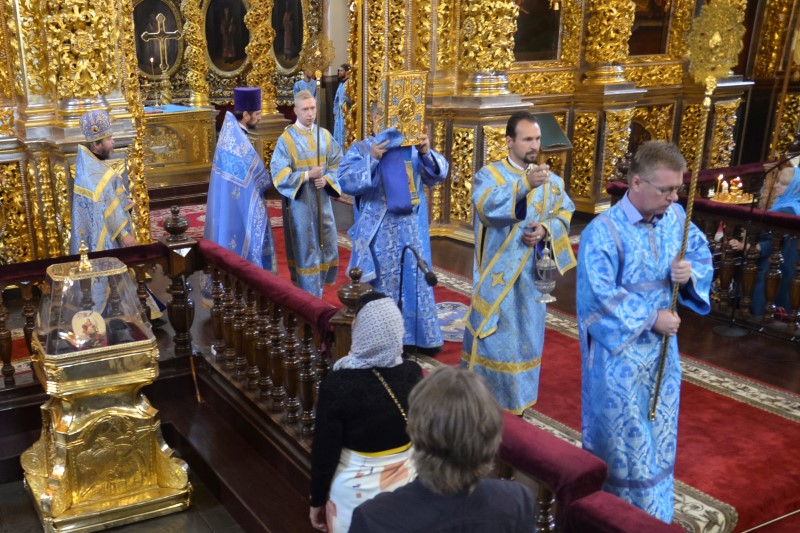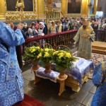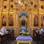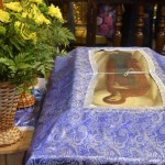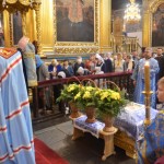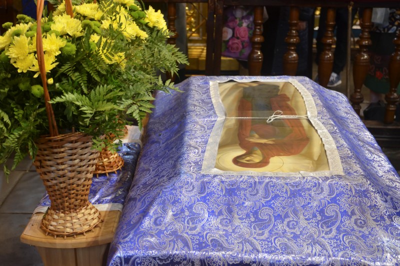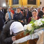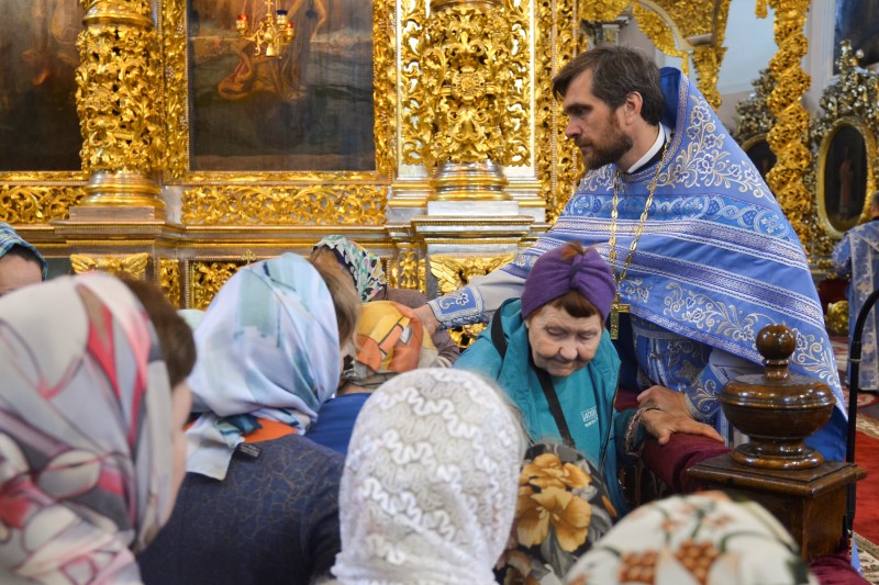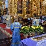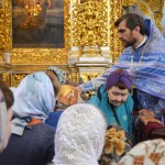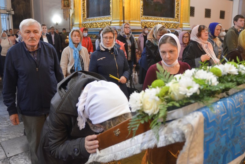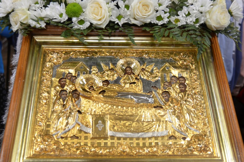 За всенощным бдением на полиелее была спущена для поклонения верующих особая святыня смоленского собора – надвратная икона Успения Пресвятой Богородицы. В образе положена частица Ризы Пресвятой Богородицы, и только один раз в год – в навечерие престольного торжества – икону, находящуюся над Царскими Вратами, опускают вниз, и люди могут благоговейно приложиться к этой святыне.