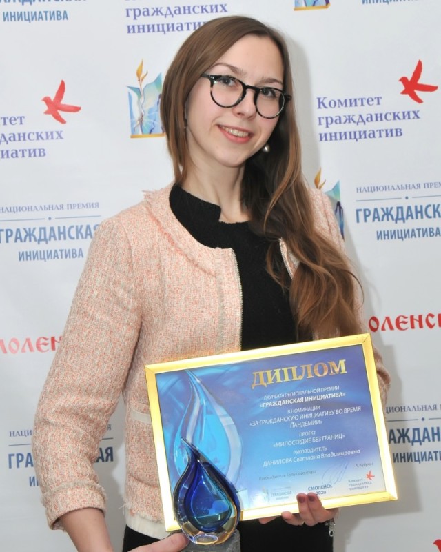 В возрастной группе «старше 35 лет» в числе авторов-победителей лучшей реализованной волонтерской практики — Светлана Владимировна Данилова: практика «Милосердие без границ — помощь в период пандемии» в направлении «Волонтерство (добровольчество) в социальной сфере».