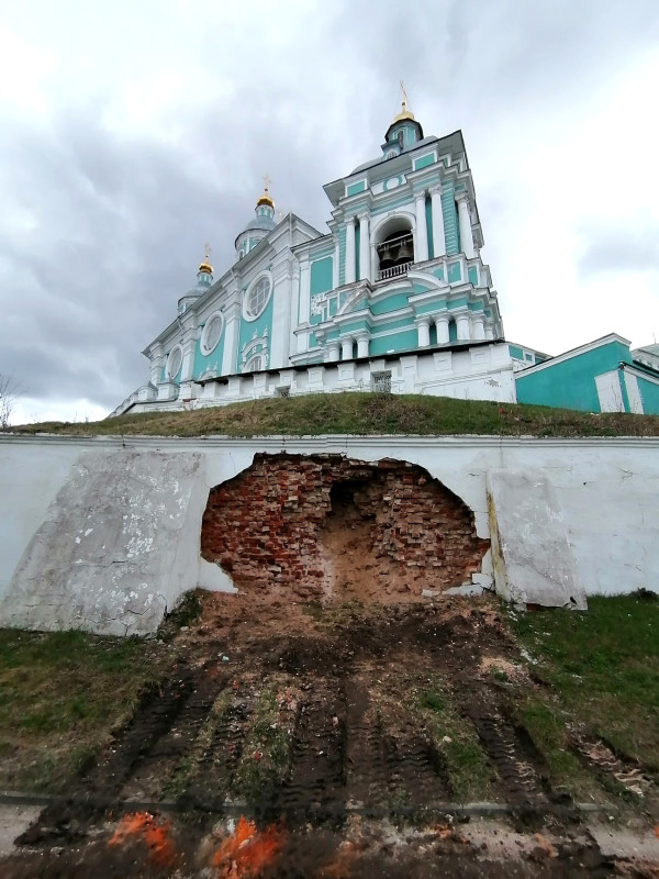 Официальный комментарий Смоленской епархии по вопросу обрушения штукатурки пролета нижнего яруса подпорной стены Свято-Успенского кафедрального собора города Смоленска.