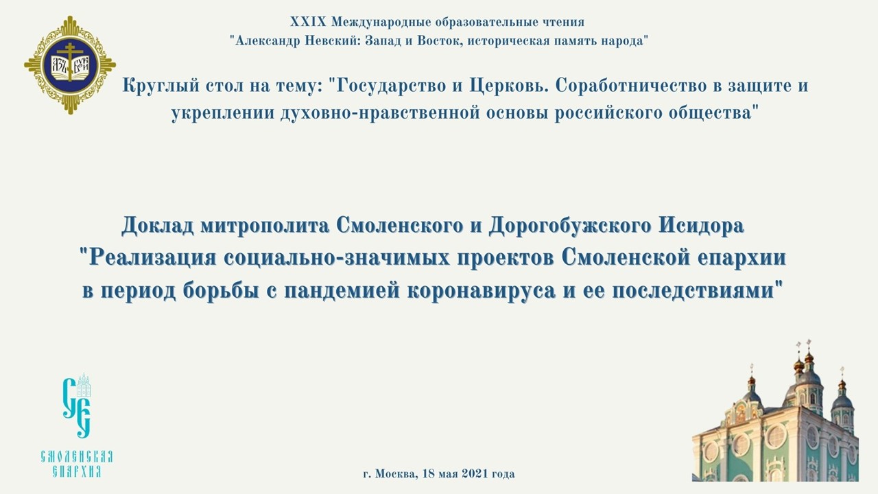 18 мая 2021 года митрополит Смоленский и Дорогобужский Исидор выступил с докладом «Реализация социально-значимых проектов Смоленской епархии в период борьбы с пандемией и ее последствиями» на заседании круглого стола «Государство и Церковь. Соработничество в защите и укреплении духовно-нравственной основы российского общества», который проходит в Государственной Думе Федерального Собрания Российской Федерации в рамках IX Парламентских встреч.