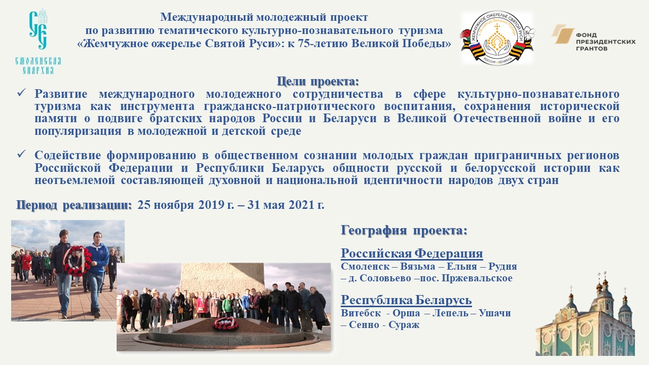 Митрополит Исидор рассказал, о том, что проект «Жемчужное ожерелье Святой Руси»: к 75-летию Великой Победы», ставший победителем конкурса Президентских грантов по направлению «Общественная дипломатия» реализуется на территории Смоленской и Витебской областей в течение полутора лет: с ноября 2019г. по май 2021 г.