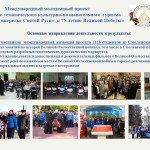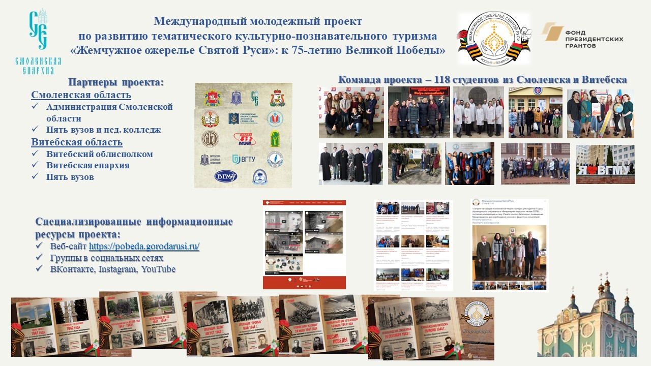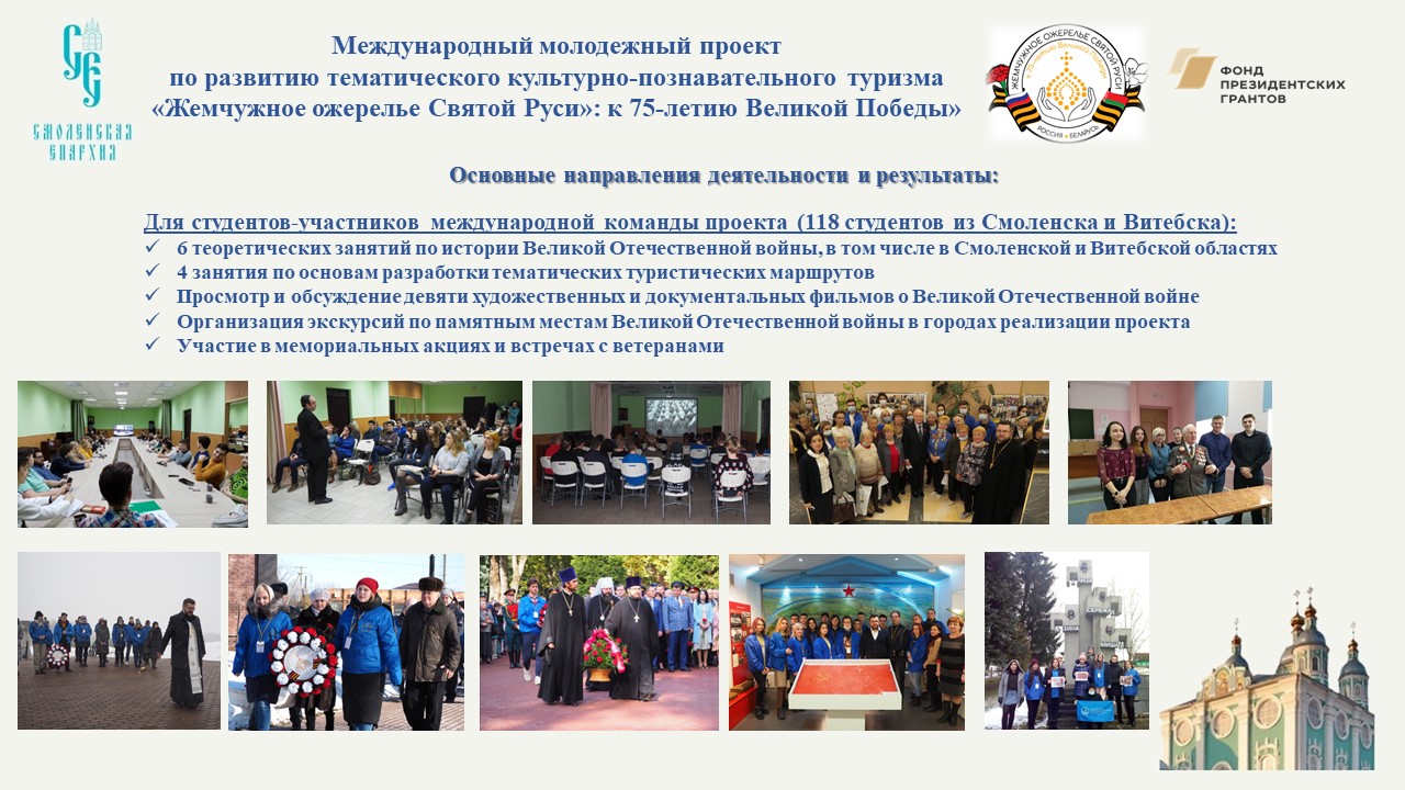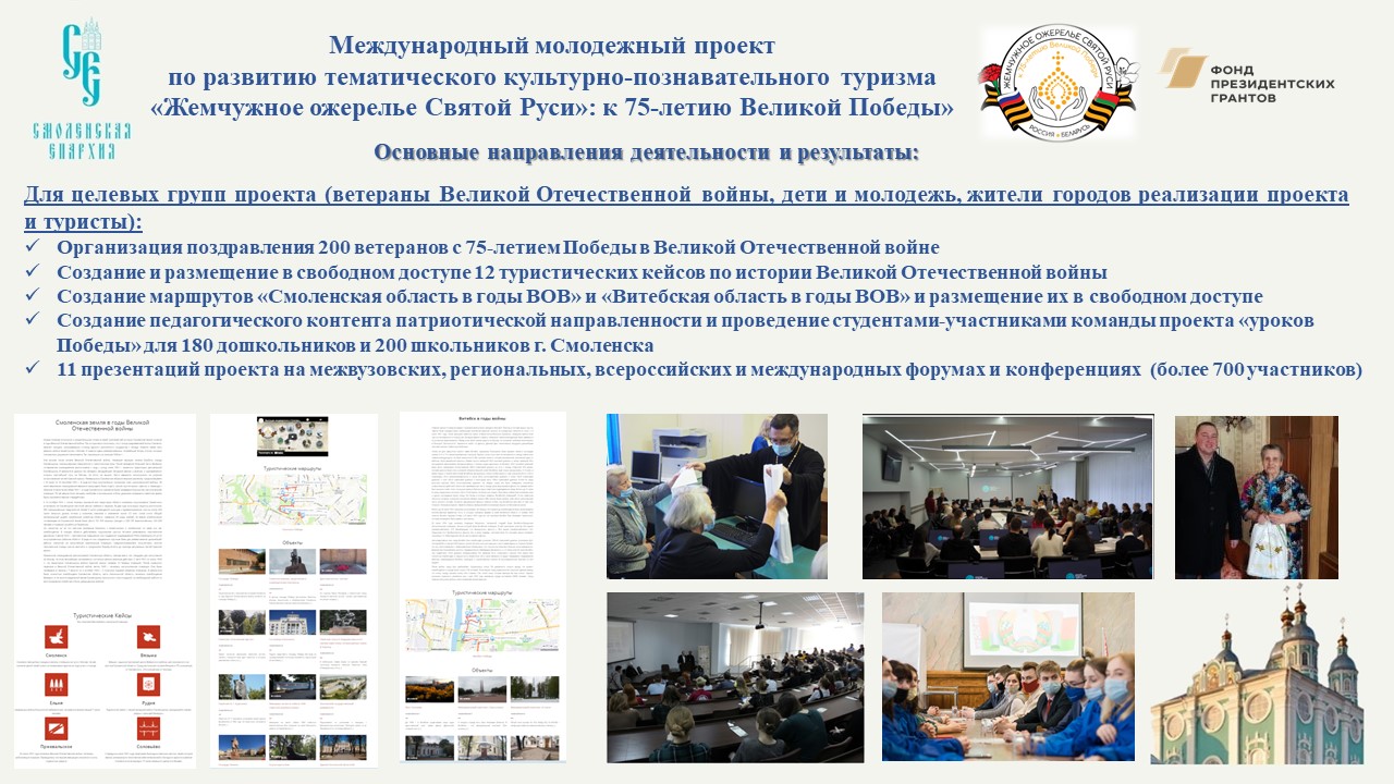 В завершение своего выступления Глава Смоленской митрополии отметил, что в числе наиболее значимых результатов данного проекта — создание туристических кейсов городов по истории Великой Отечественной войны. Кейсы созданы по 12-ти городам, входящим в географию проекта. Из них – шесть городов Смоленской области и шесть городов и населенных пунктов Республики Беларусь. Кроме того, ребята-участники команды проекта «Жемчужное ожерелье Святой Руси»: к 75-летию Великой Победы» создали два молодёжных туристических маршрута: «Смоленская область в годы Великой Отечественной войны» и «Витебская область в годы Великой Отечественной войны». Важным компонентом стало участие ребят в гражданско-патриотических акциях и встречи с ветеранами, в ходе которых были организованы поздравления участников войны с юбилеем Великой Победы, а также посещение музеев и мемориалов, посвященных Великой Отечественной войне и ее героям.