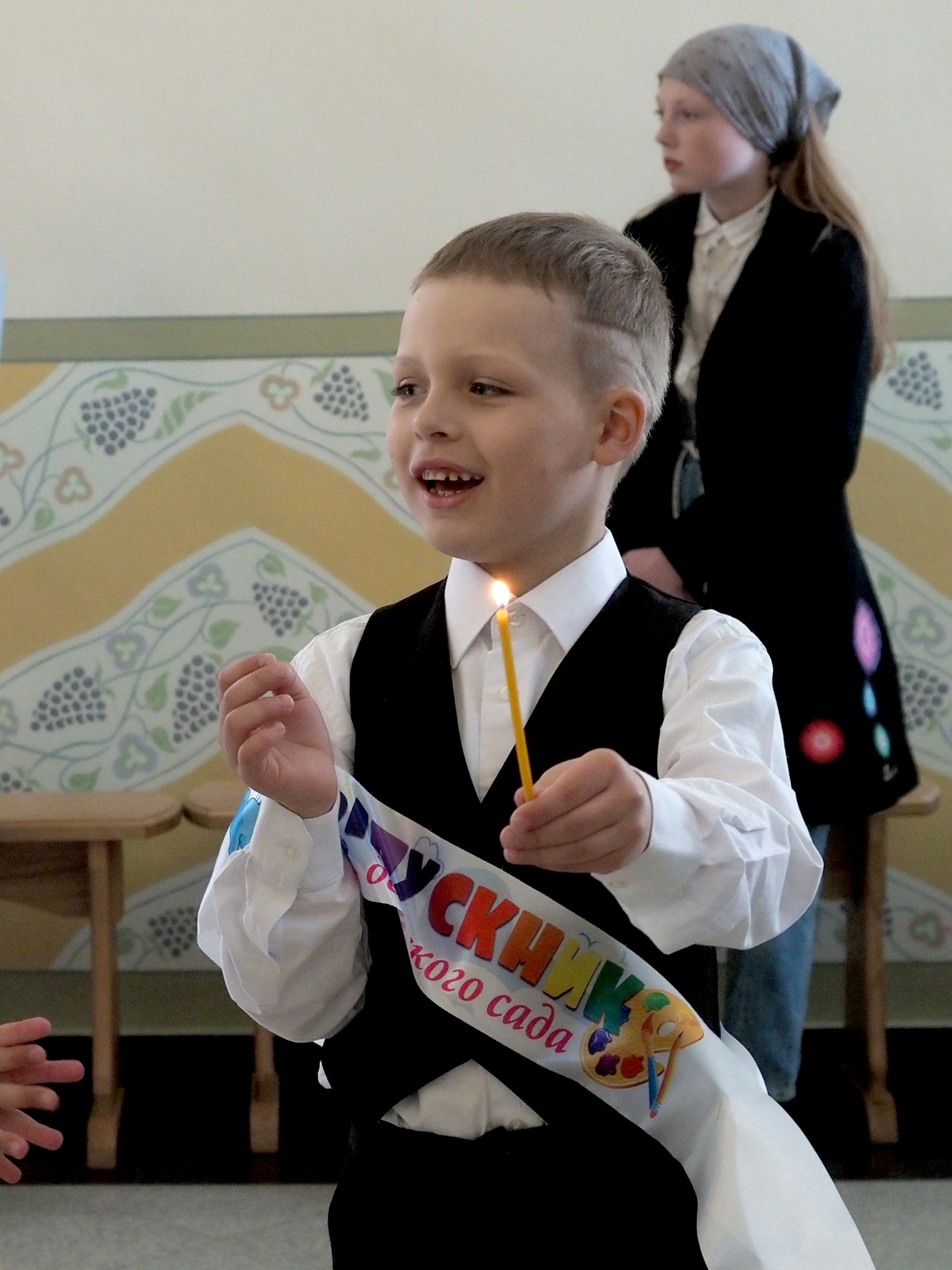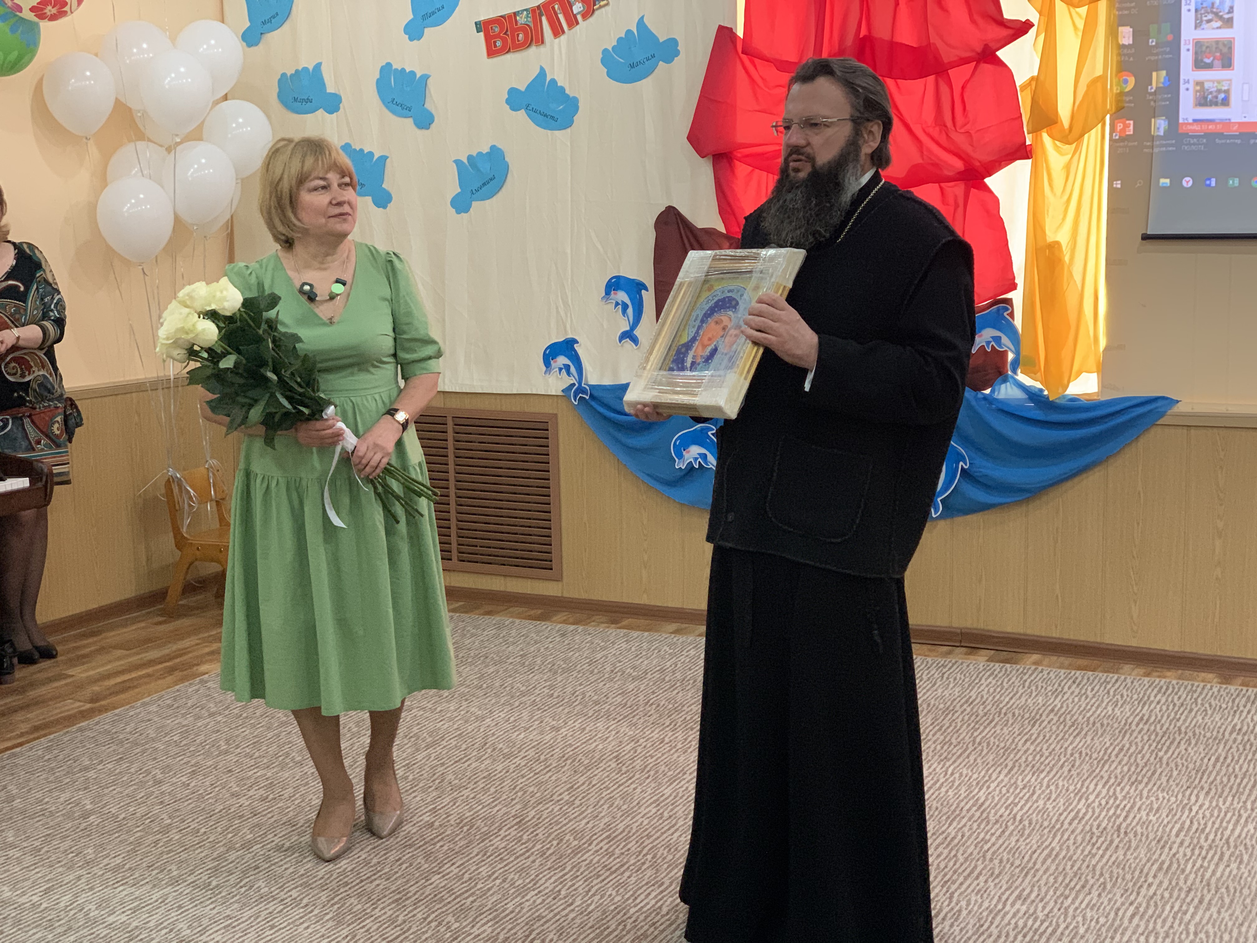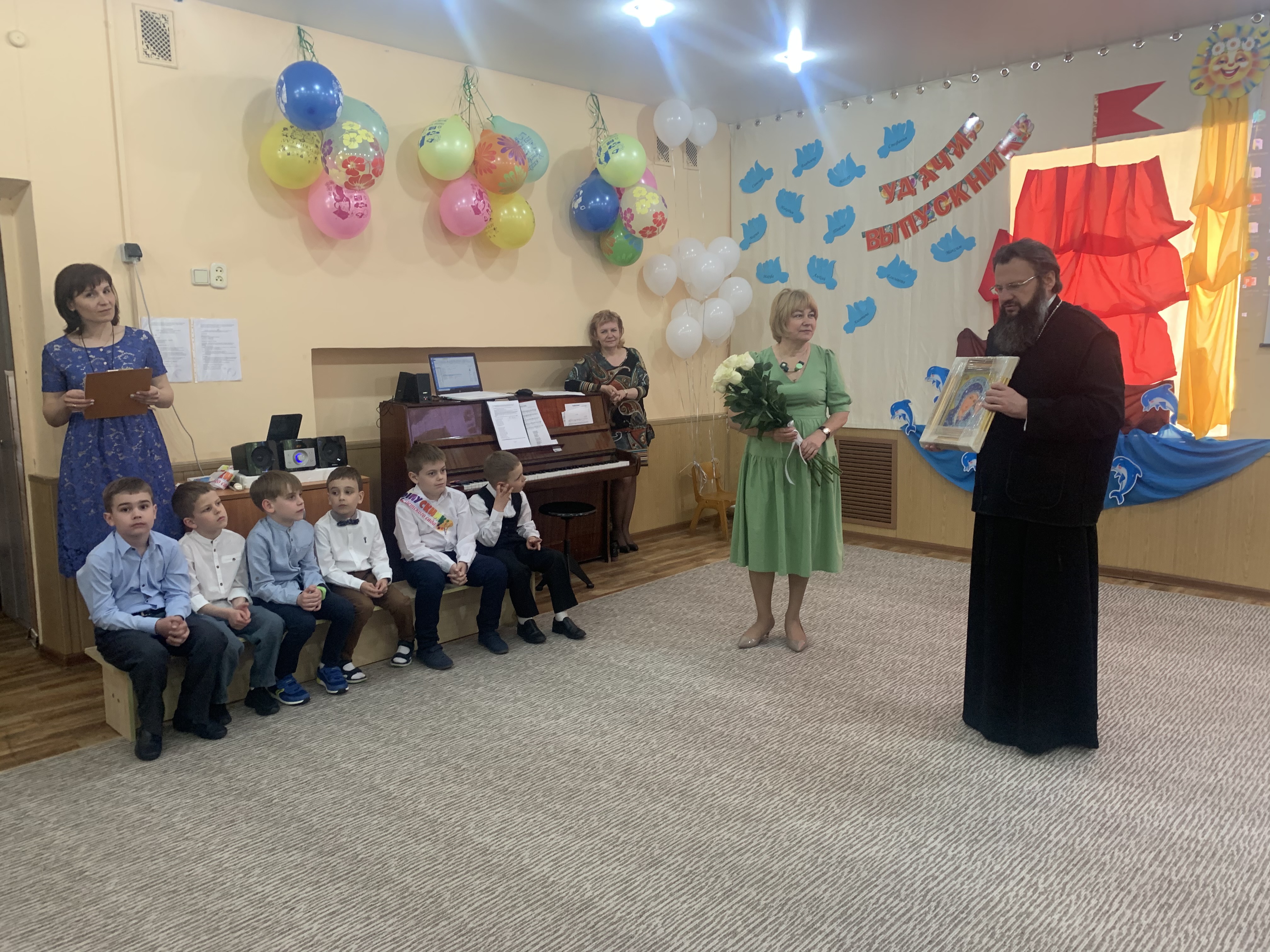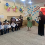 Затем в Православном Детском саду N 1 состоялся выпускной праздник. Выпускников поздравил митрополит Смоленский и Дорогобужский Исидор. Влыдыка преподал архипастырское благословение детям, родителям и передал в дар Православному детскому саду икону Божией Матери, которую расшила бисером заместитель Губернатора Смоленской области Вита Михайловна Хомутова.