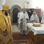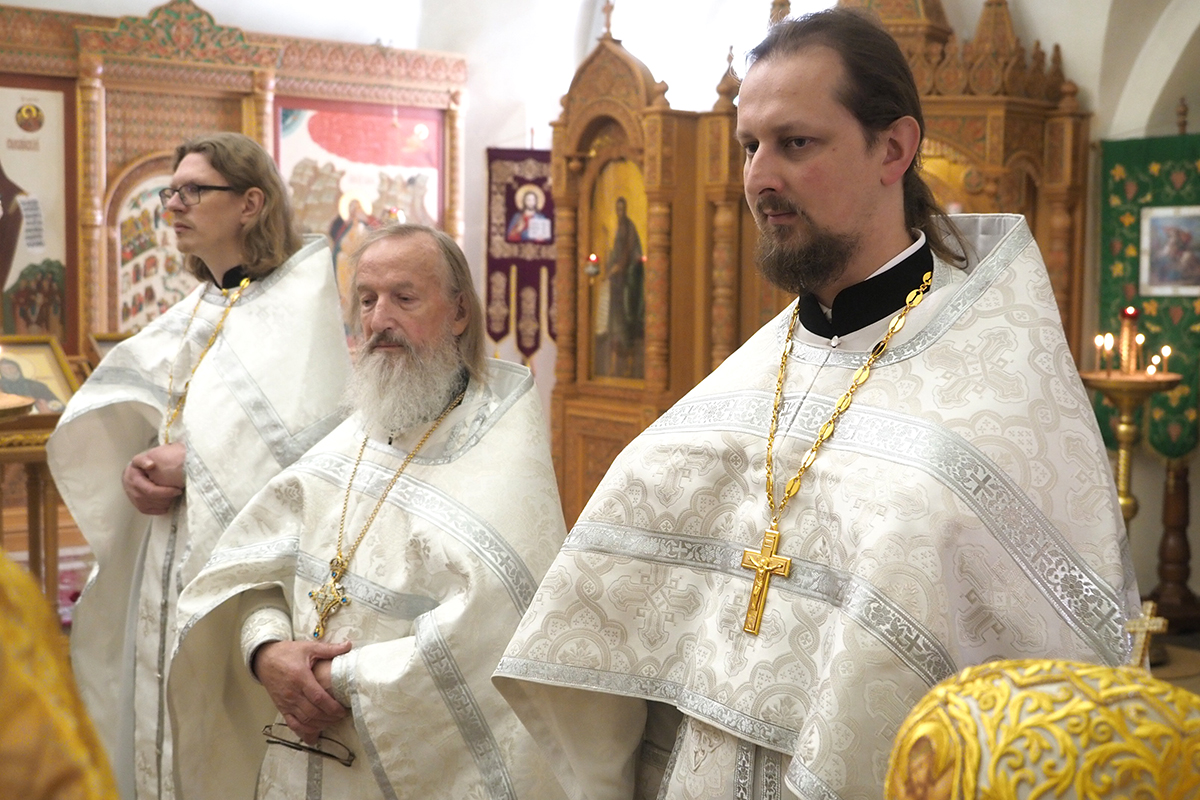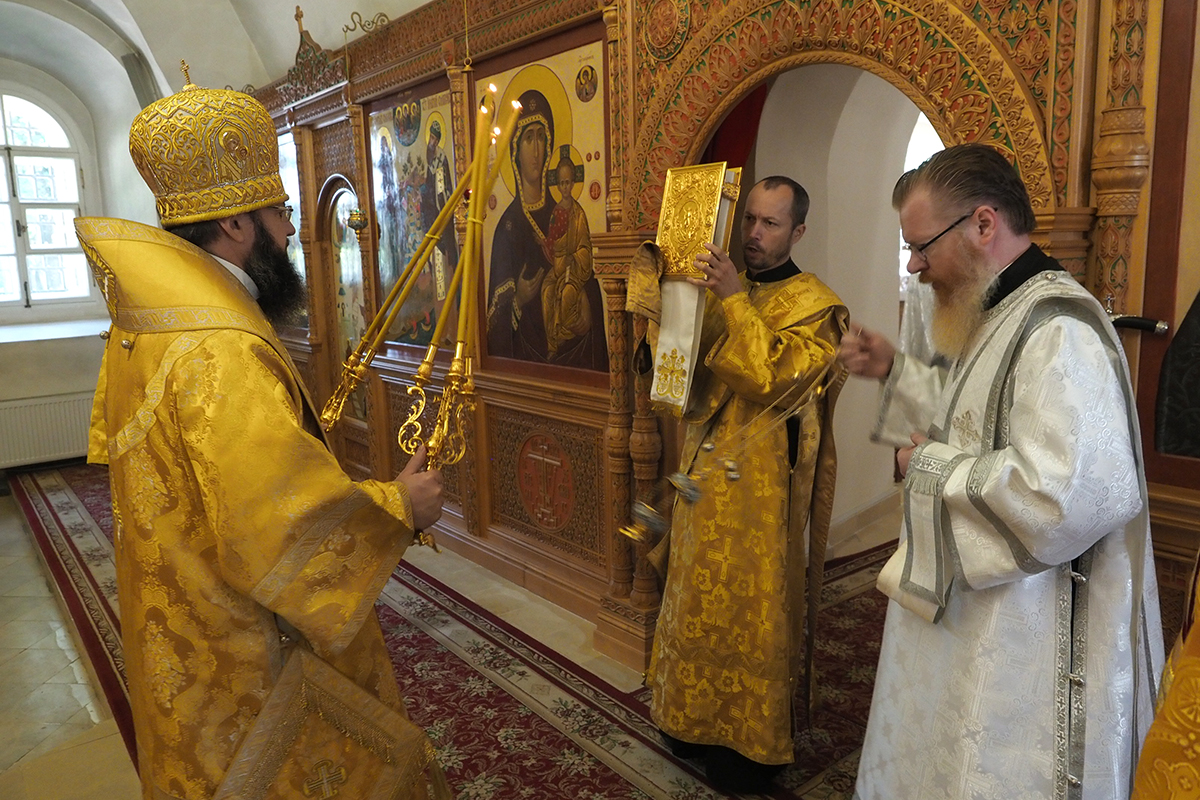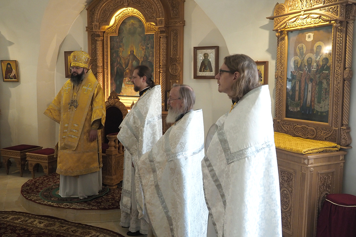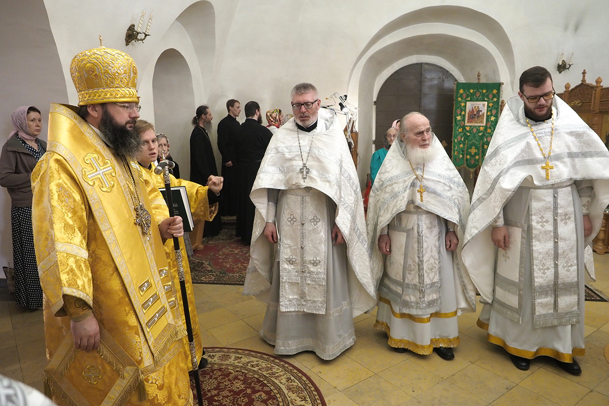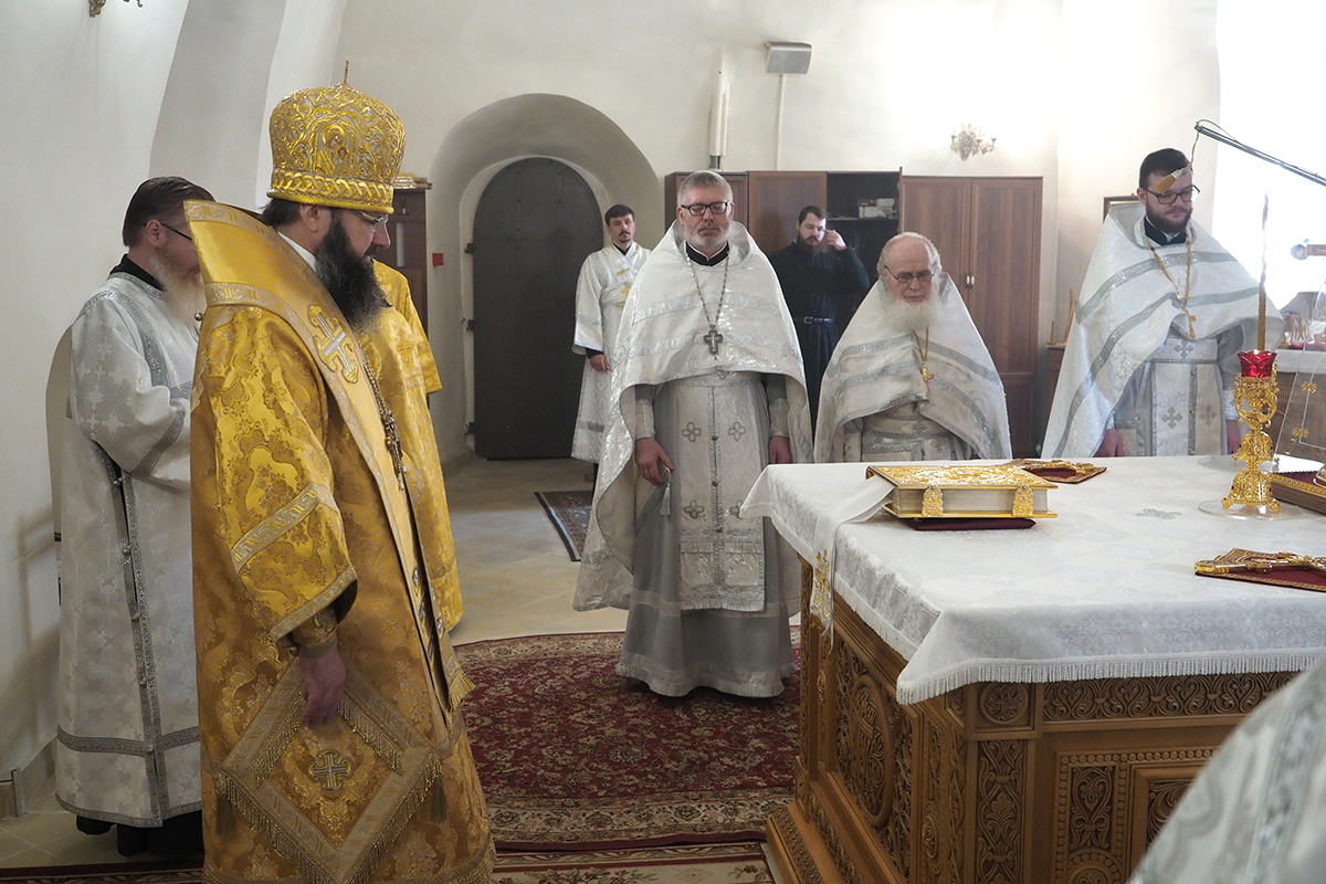 За Божественной литургией Его Высокопреосвященству сослужили наместник святой обители игумен Николай (Золотов), Председатель Церковного суда Смоленской епархии игумен Тарасий (Ланге), заведующий заочным отделением СПДС иеромонах Лука (Лисовский), исполняющий обязанности помощника ректора по воспитательной работе иерей Димитрий Гамиловский, братия и духовенство монастыря.