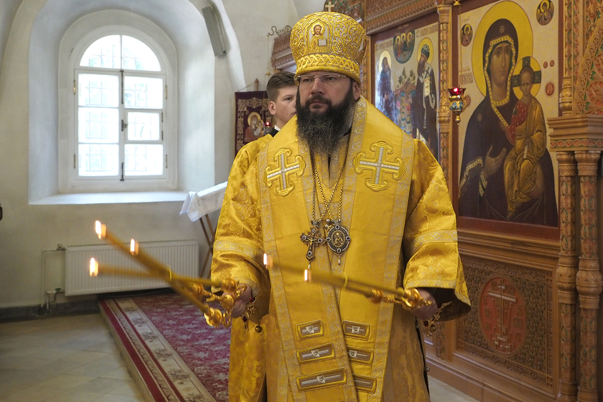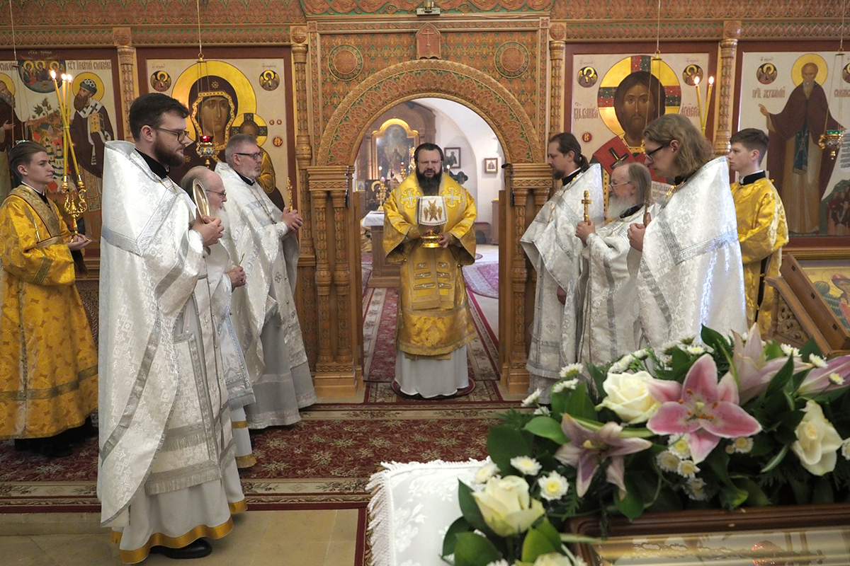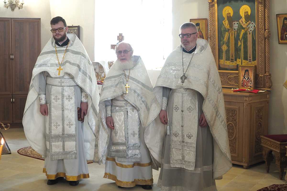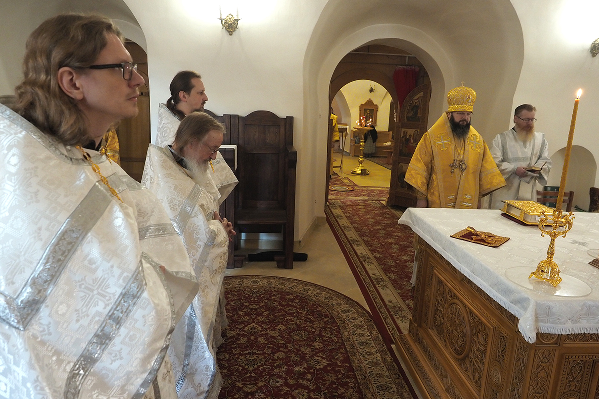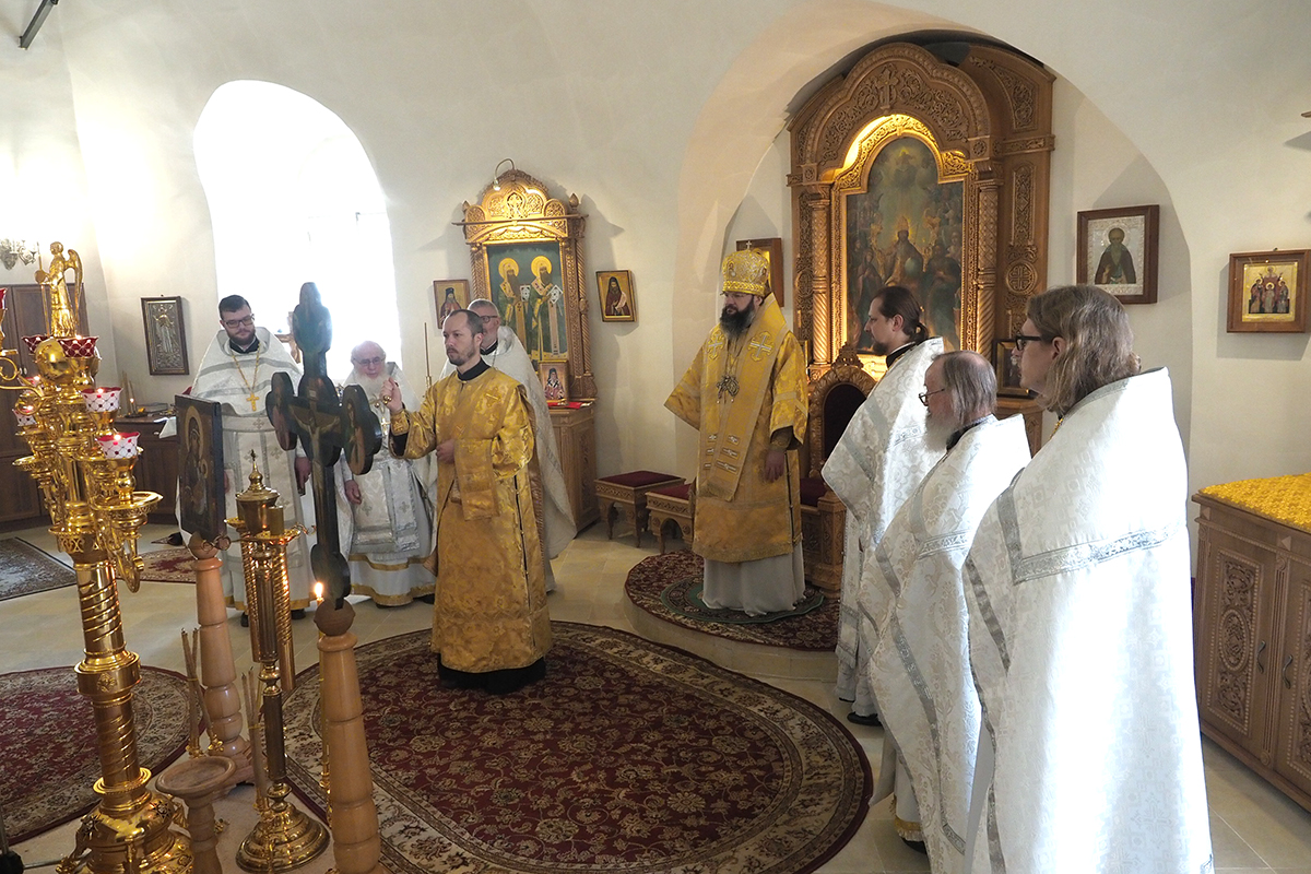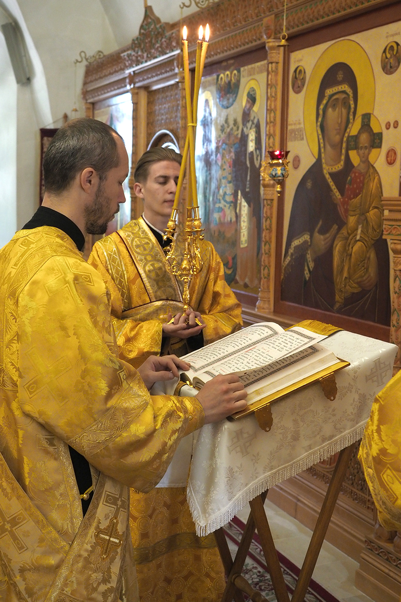За Божественной литургией Его Высокопреосвященству сослужили наместник святой обители игумен Николай (Золотов), Председатель Церковного суда Смоленской епархии игумен Тарасий (Ланге), заведующий заочным отделением СПДС иеромонах Лука (Лисовский), исполняющий обязанности помощника ректора по воспитательной работе иерей Димитрий Гамиловский, братия и духовенство монастыря.