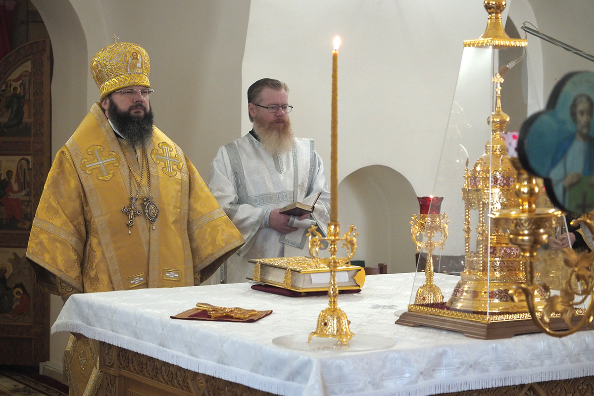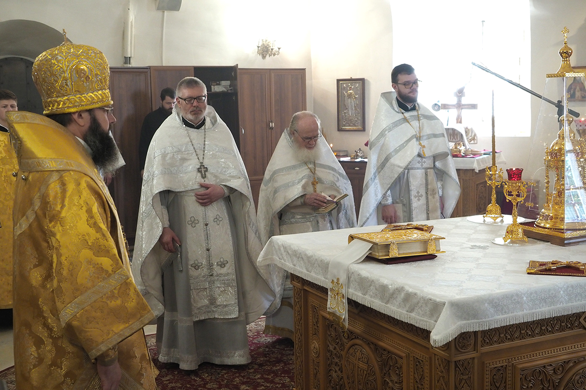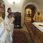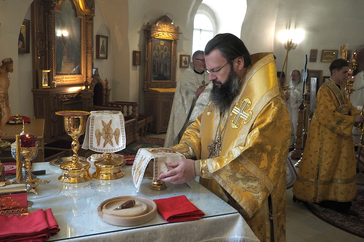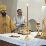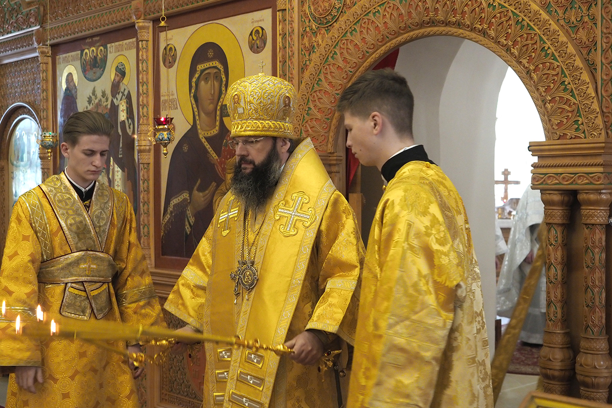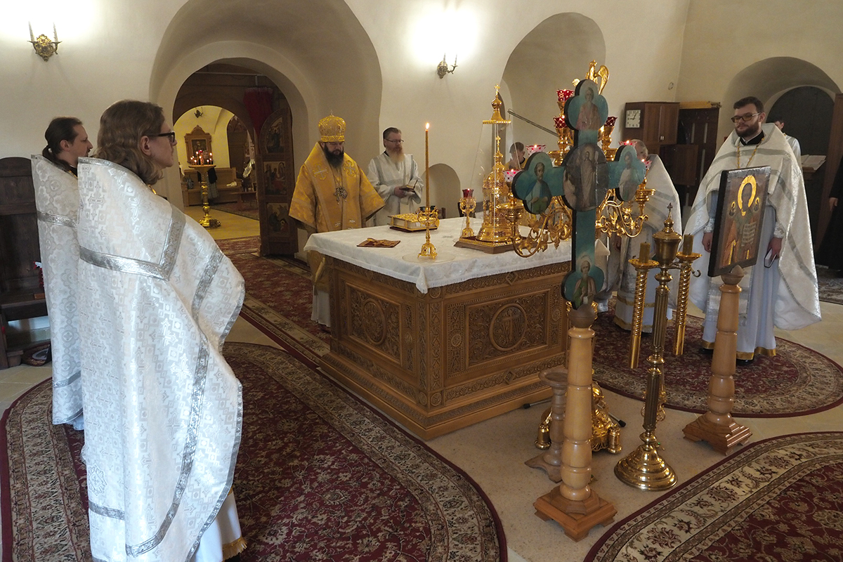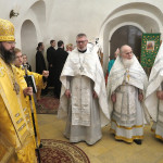 За Божественной литургией Его Высокопреосвященству сослужили наместник святой обители игумен Николай (Золотов), Председатель Церковного суда Смоленской епархии игумен Тарасий (Ланге), заведующий заочным отделением СПДС иеромонах Лука (Лисовский), исполняющий обязанности помощника ректора по воспитательной работе иерей Димитрий Гамиловский, братия и духовенство монастыря.