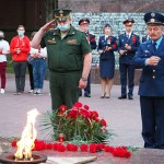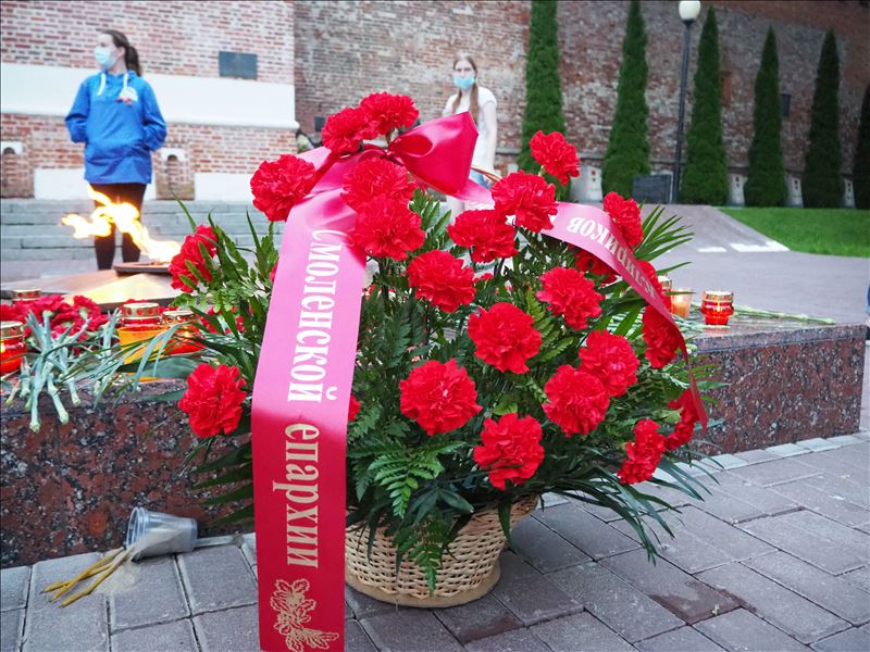 В Сквер Памяти Героев города Смоленска, к Вечному огню, почтить память погибших в годы Великой Отечественной войны пришли митрополит Смоленский и Дорогобужский Исидор, начальник Главного управления Смоленской области по делам молодежи и гражданско-патриотическому воспитанию Олег Вячеславович Иванов, представители администрации города Смоленска, офицеры и военнослужащие Смоленского территориального гарнизона и силовых структур, духовенство Смоленской епархии, представители ветеранских, детских и молодежных общественных организаций и объединений, представители Смоленского казачества, жители города.