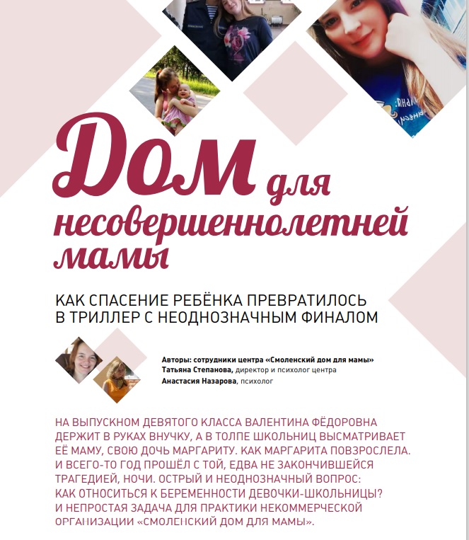 В нашем регионе успешно реализуется именно такой комплексный подход. “Смоленский дом для мамы” ведет свою работу при взаимодействии с Администрацией города и области, с медицинскими учреждениями города Смоленска. Помощь в социализации несовершеннолетних матерей оказывают Департамент Смоленской области по социальному развитию, Департамент Смоленской области по образованию и науке, Уполномоченный по правам ребенка в Смоленской области Михайлова Наталья Александровна, коллеги из СО НКО, занимающихся вопросами защиты материнства и детства. В подготовке медицинских аналитических данных по несовершеннолетним родам в Перинатальном центре г. Смоленска помощь оказала Густоварова Татьяна Алексеевна — д.м.н., профессор, заместитель главного врача по акушерству и гинекологии ОГБУЗ «Клиническая больница №1». Также решение задач медицинского сопровождения несовершеннолетних беременных проводится в сотрудничестве с кафедрой акушерства и гинекологии СмолГМУ, к.м.н. Смирновой Татьяной Ивановной, зав. Обсервационным отделением Перинатального центра Городской клинической больницы №1 , к.м.н. Болвачевой Еленой Владимировной. Для решения правовых вопросов несовершеннолетних беременных и матерей консультативную юридическую помощь оказывает «Расправь крылья» АНО «Центр социальной и правовой помощи детям», руководитель Алексей Владимирович Паневин.