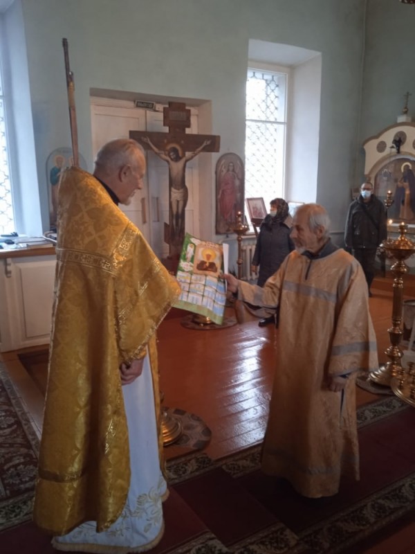 После воскресной проповеди настоятель протоиерей Николай поблагодарил алтарника за 15-летнее послушание и вручил ему календарь.