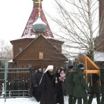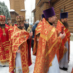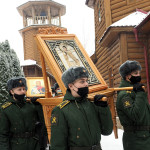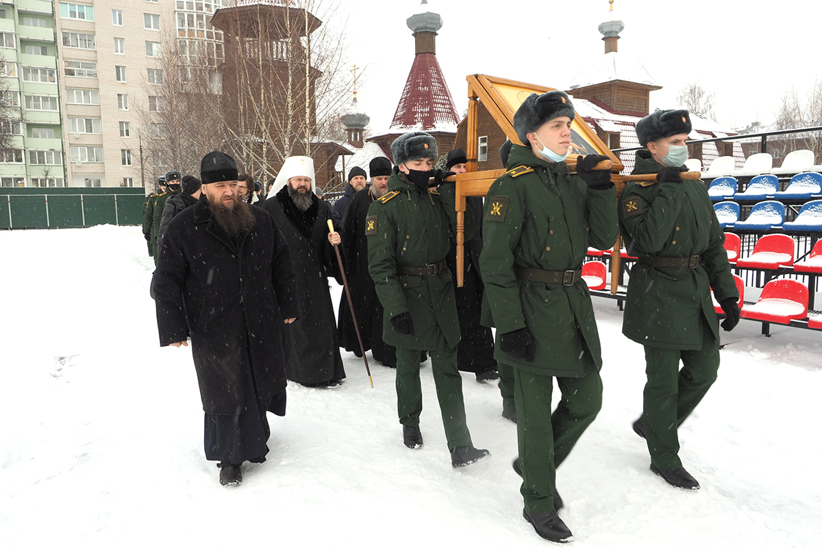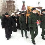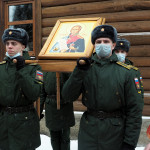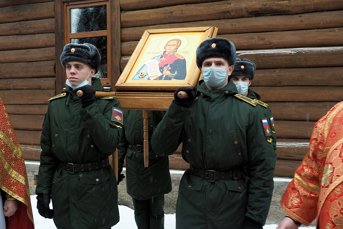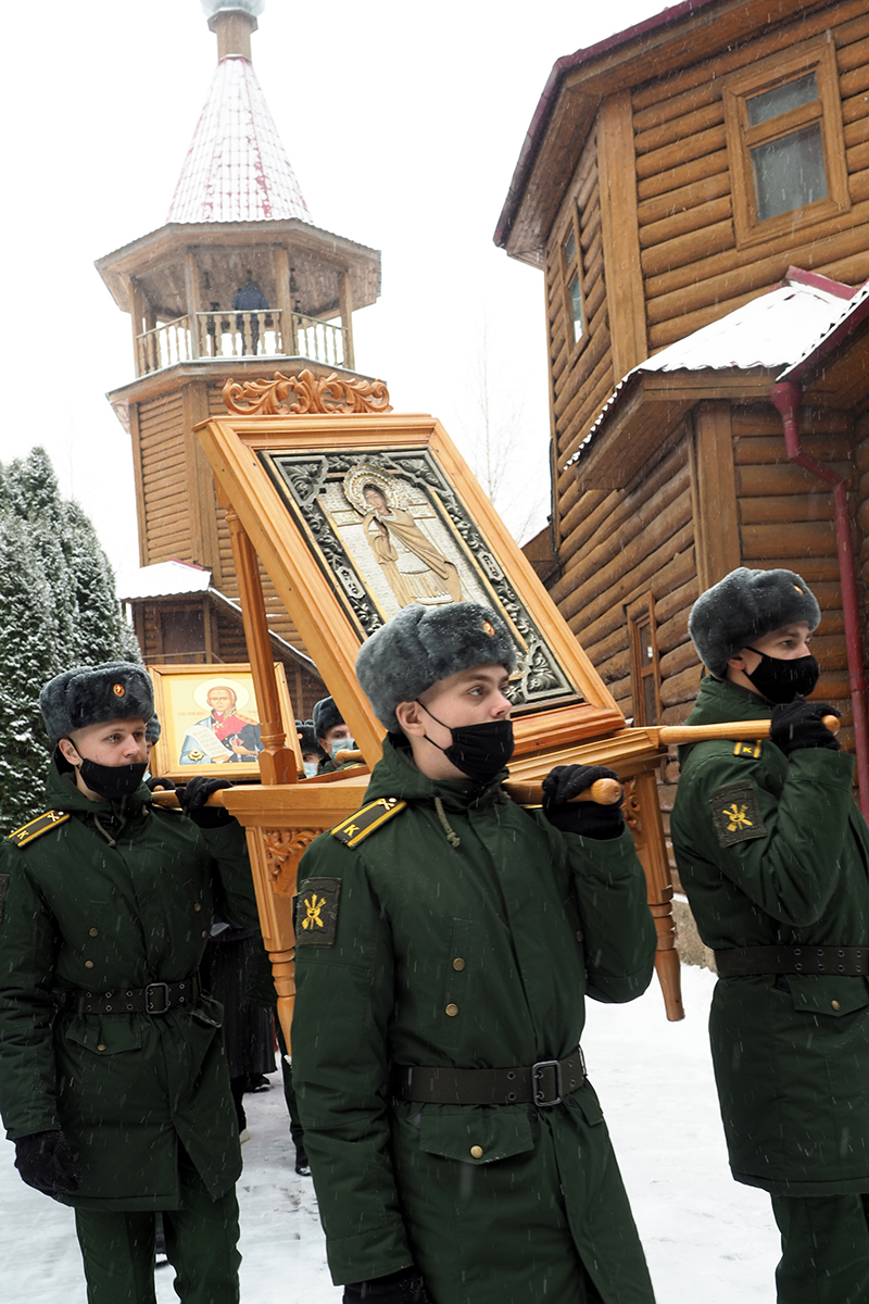 В завершение Литургии духовенство и миряне совершили крестный ход вокруг храма с иконой святого мученика Меркурия Смоленского и иконой святого праведного воина Феодора Ушакова.