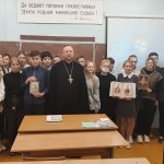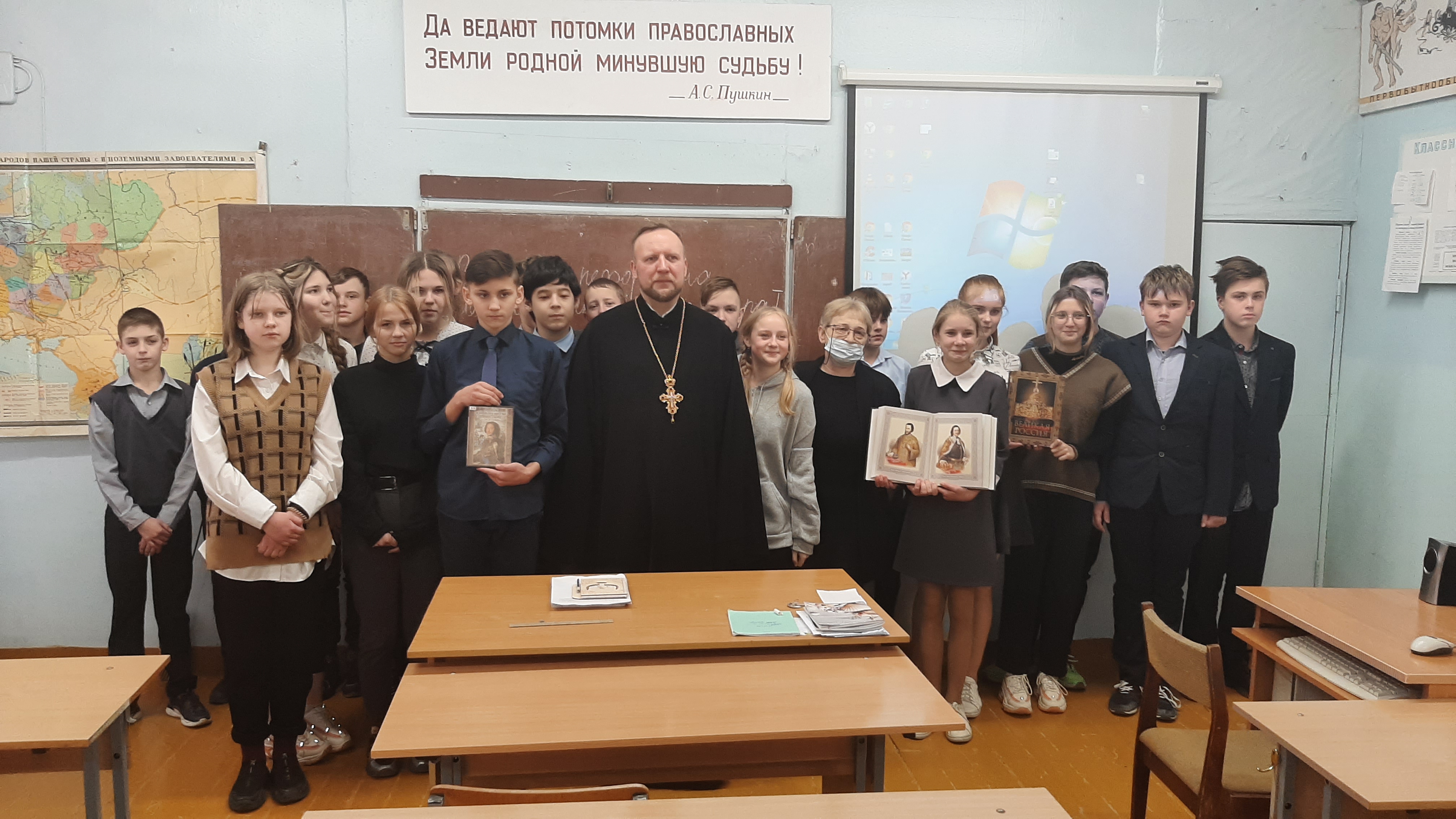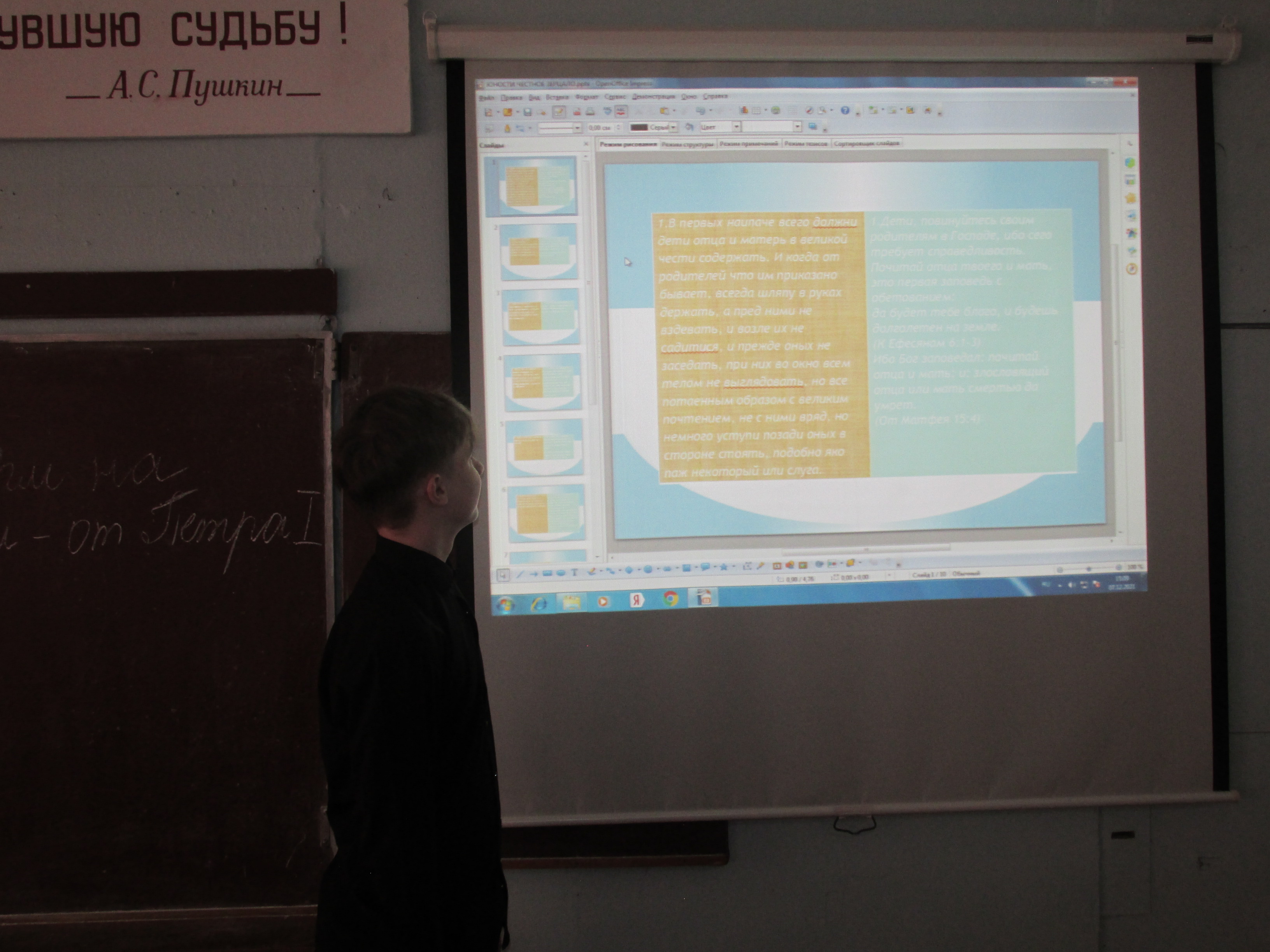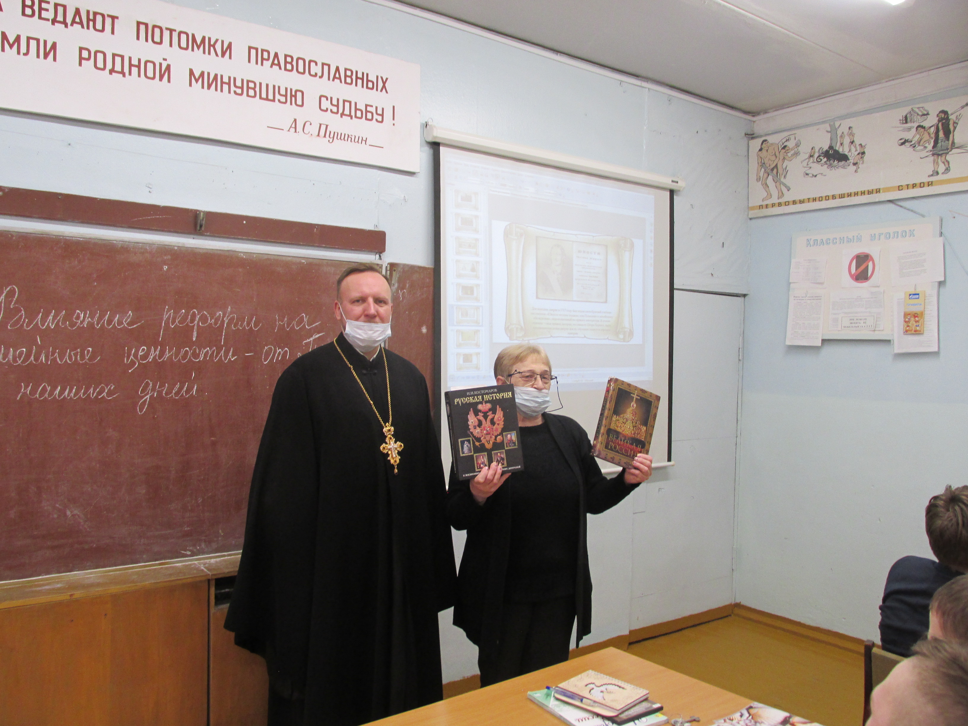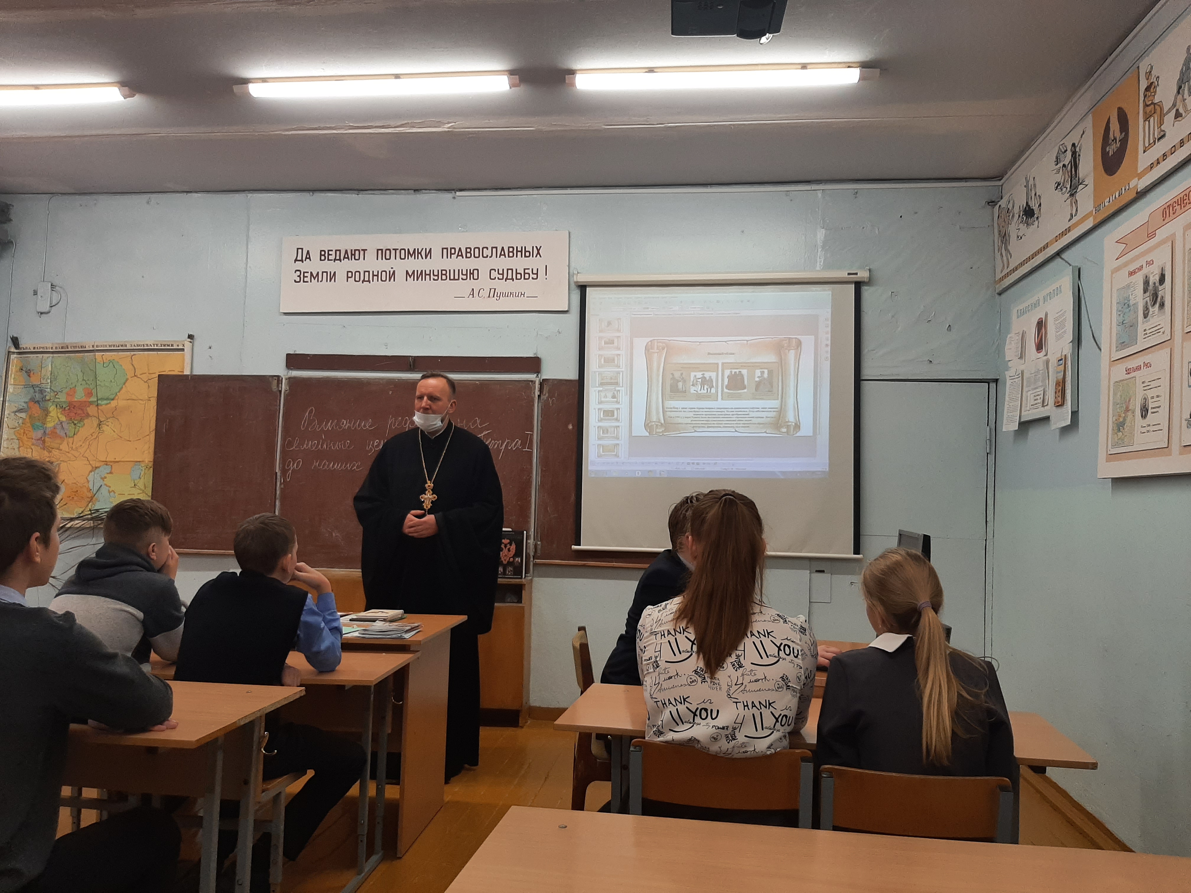 Учащиеся познакомились с правилами поведения молодых людей дома и особенно в гостях «Юности честное зерцало« и сравнили основные пункты правил с Библией. На уроке присутствовал благочинный Демидовского церковного округа протоиерей Александр Миронов, который остановился на делах веры императора строительстве Александро-Невской Лавры и перенесении туда мощей святого Александра Невского.
