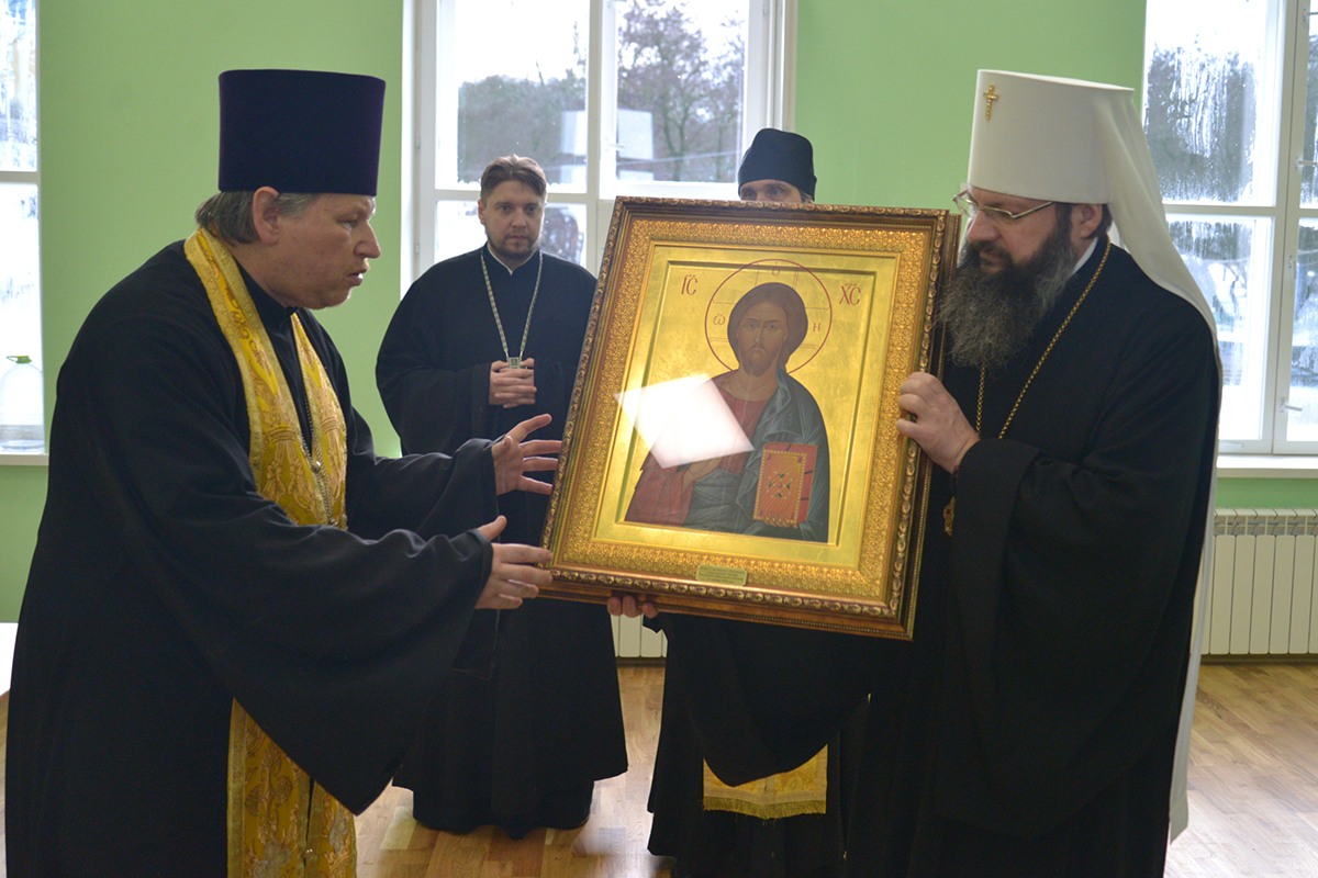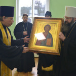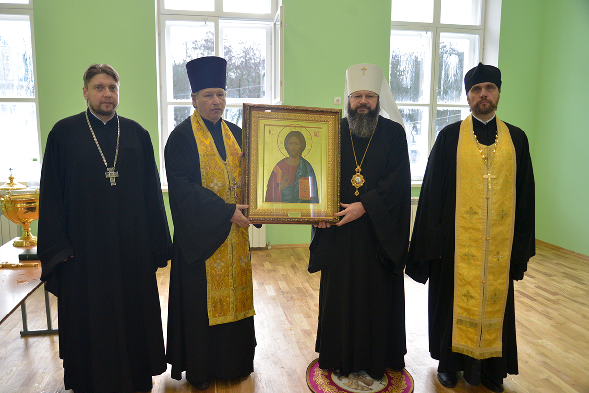 После освящения митрополит Исидор поздравил протоиерея Святослава Худовекова и педагогов с долгожданным событием – освящением корпуса начальных классов Православной гимназии после реставрации надвратной Одигитриевской церкви и передал в дар гимназии образ Христа Спасителя.