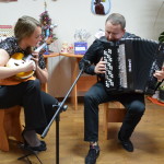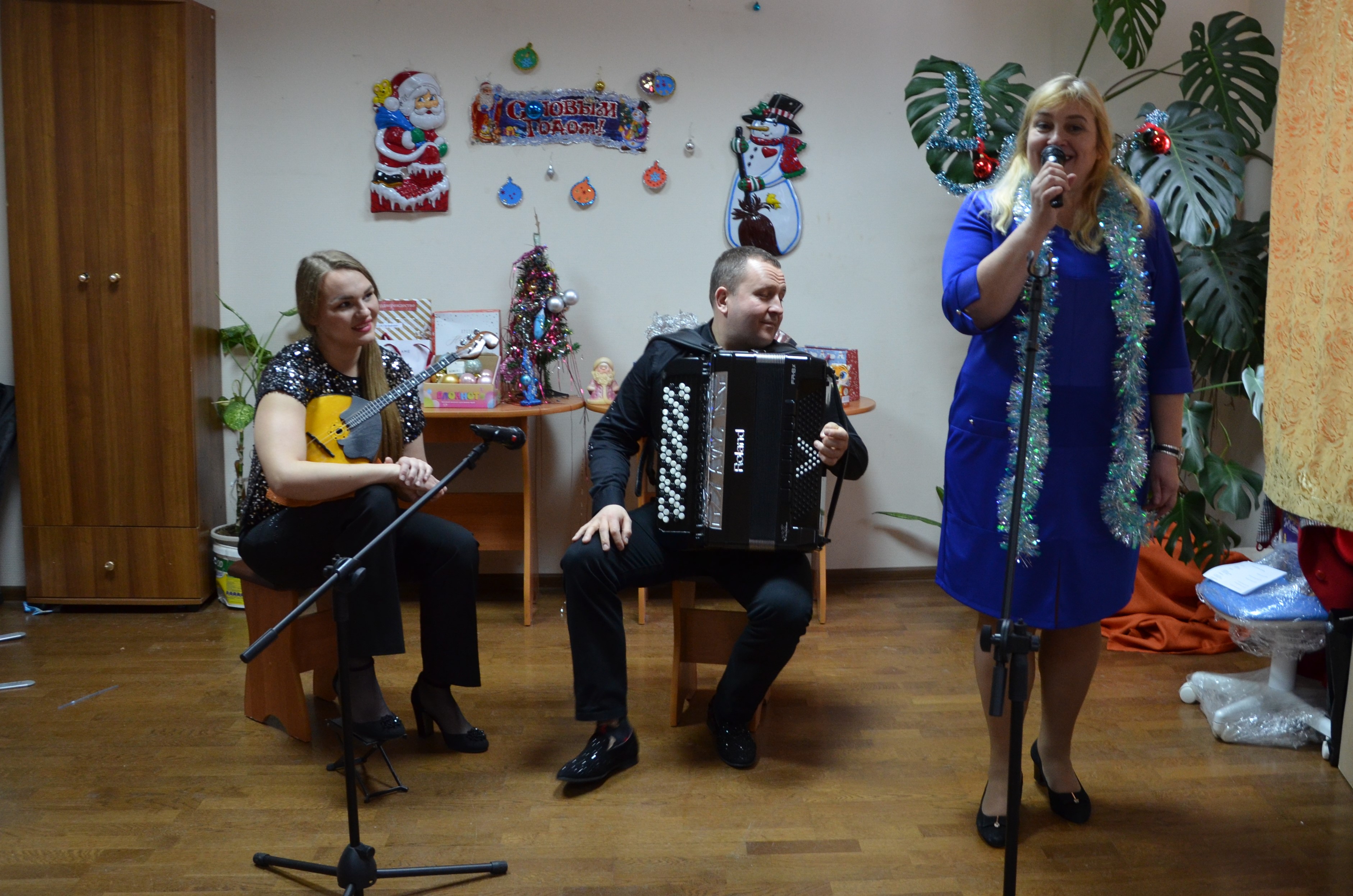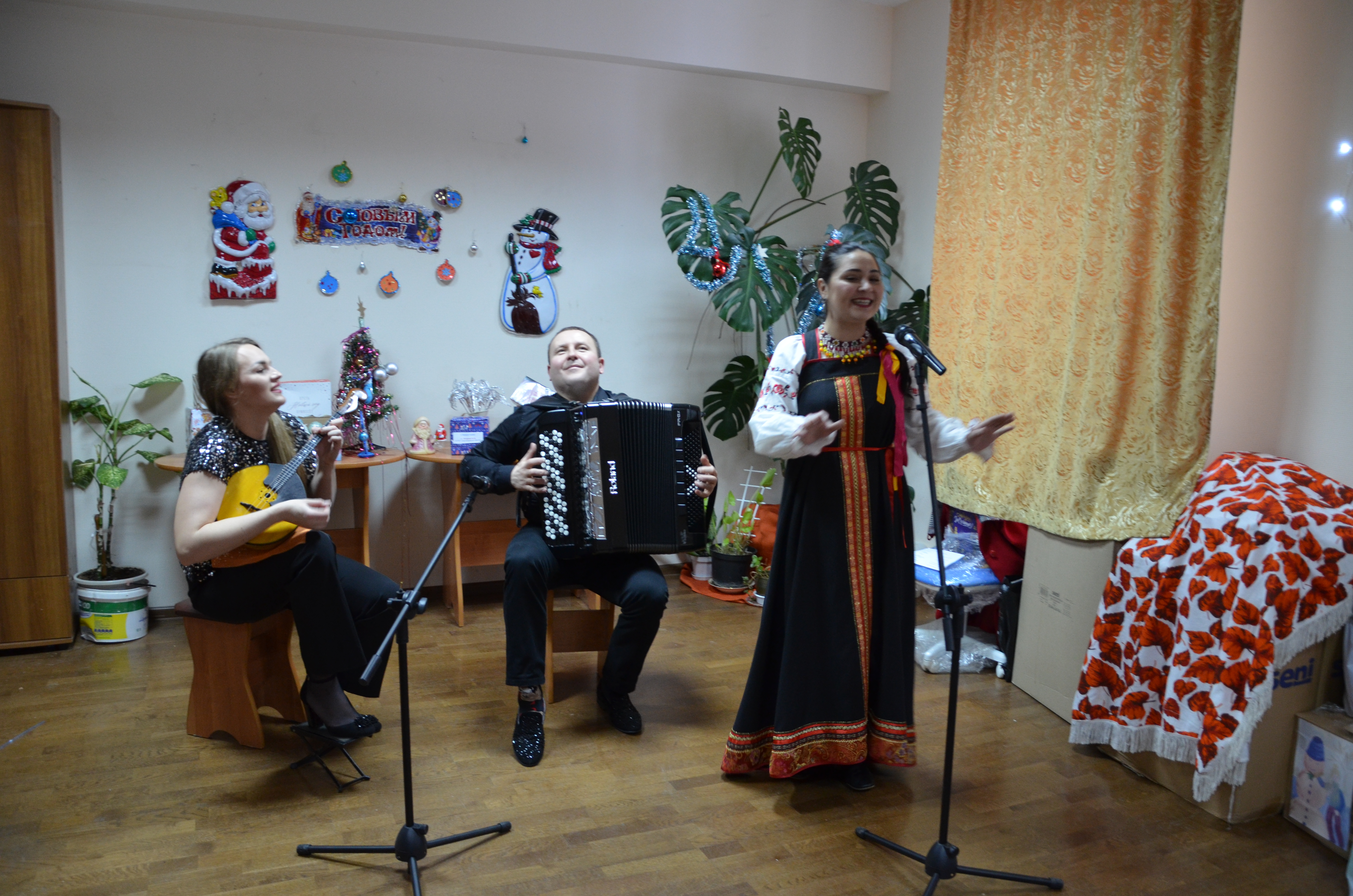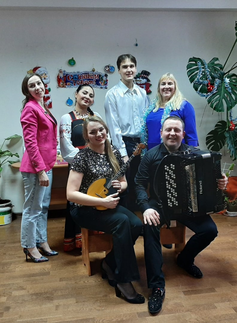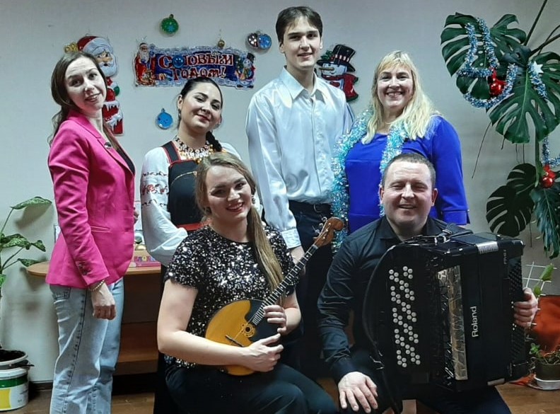 На заключительной предновогодней встрече выступили музыканты ансамбля «Алатырь» Смоленского областного центра народного творчества. Молодой творческий коллектив образован в сентябре 2017 года. С 2020 года руководит ансамблем Сергей Сойменов — виртуозный баянист, лауреат Всероссийских и международных конкурсов. В составе коллектива талантливые артисты: Анастасия Ступак (домра) и яркая солистка, обладающие уникальными по глубине звучания голосом Елизавета Михненкова.
