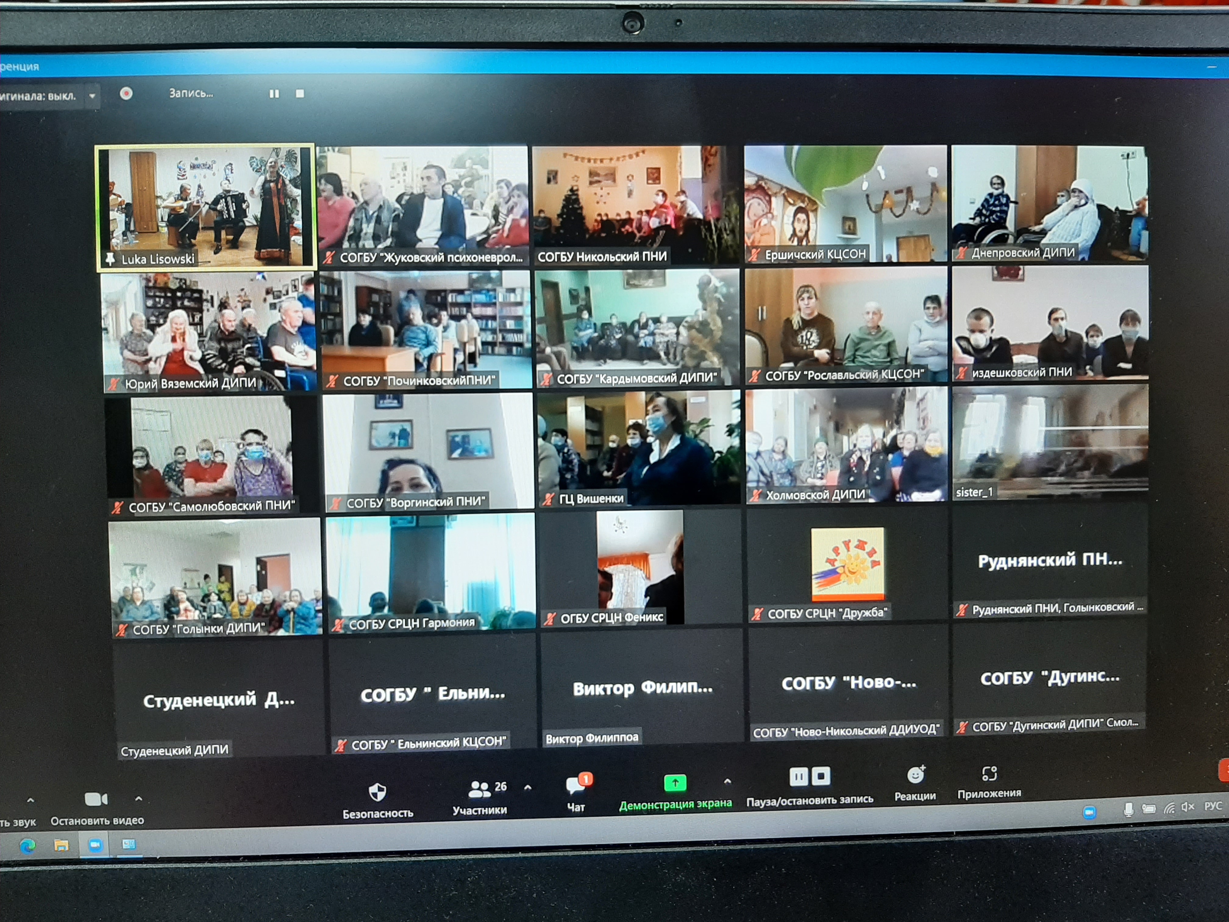К эфиру присоединились 115 подопечных из 24 учреждений, среди которых: дома престарелых и инвалидов Днепровский, Голынковский, Дугинский, Кардымовский, Холмовской, Вяземский, Всходский, Студенецкий, геронтологический центр «Вишенки»; комплексные центры социального обслуживания населения Дорогобужского, Ершичского, Ельнинского, Рославльского районов, психо-неврологические интернаты Издешковский, Руднянский, Воргинский, Жуковский, Починковский, Самолюбовский; социально-реабилитационные центры для несовершеннолетних «Феникс», г. Смоленск, «Дружба» г. Сычевка, «Гармония» г. Вязьма, а также Ново-Никольский детский дом-интернат.