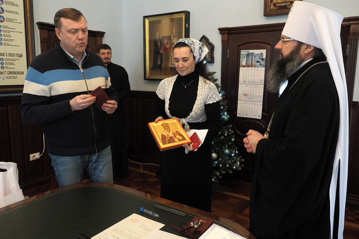 В церемонии приняли участие меценат, Генеральный директор Консорциума «Русэкспорт» Дмитрий Венарьевич Исаенко и православная жительница города Токио Майя (Мария) Смирнова. Дмитрий Венарьевич вручил Высокопреосвященнейшему митрополиту Смоленскому и Дорогобужскому произведения искусства, которые изготовлены мастерами Консорциума «Русэкспорт». Из 2000-летнего морёного дуба для создаваемого музея Смоленской епархии была передана резная икона святителя Николая, Архиепископа Мир Ликийских, Чудотворца.