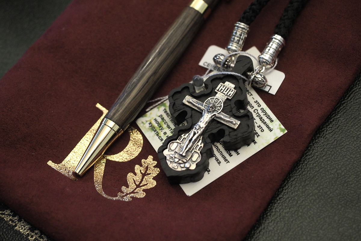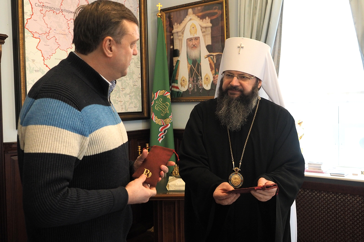 Также смоленскому архипастырю был передан уникальный серебряный крест в оправе из морёного дуба.