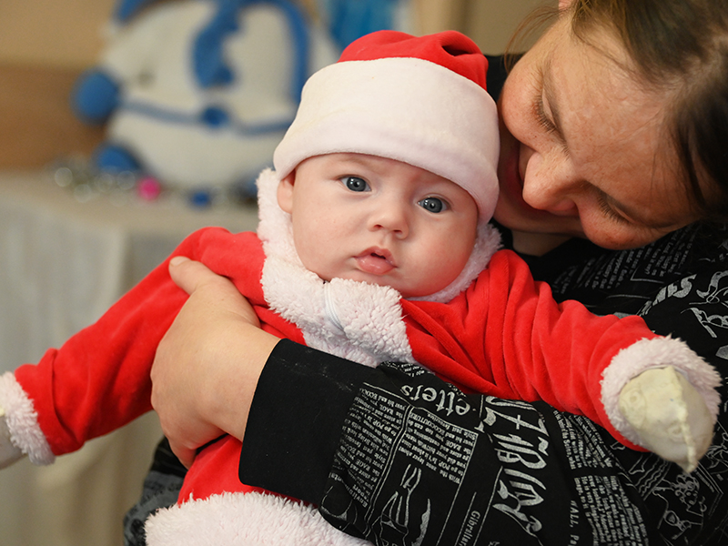 Самому младшему малышу Алеше, проживающему вместе с мамой в Центре, всего два месяца. Перед новогодними праздниками младенцу подарили костюм Деда Мороза.