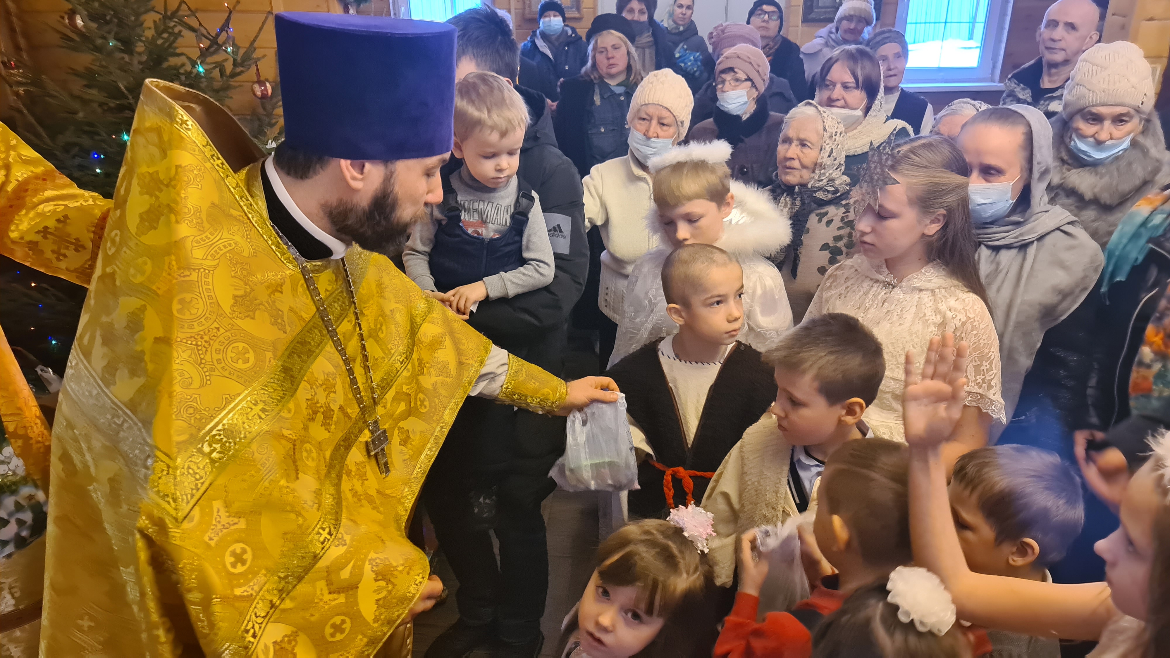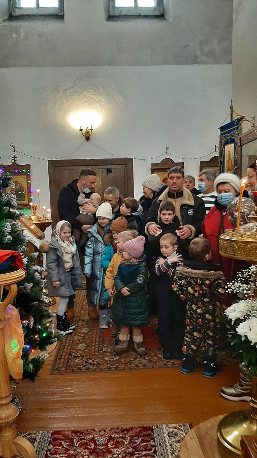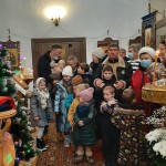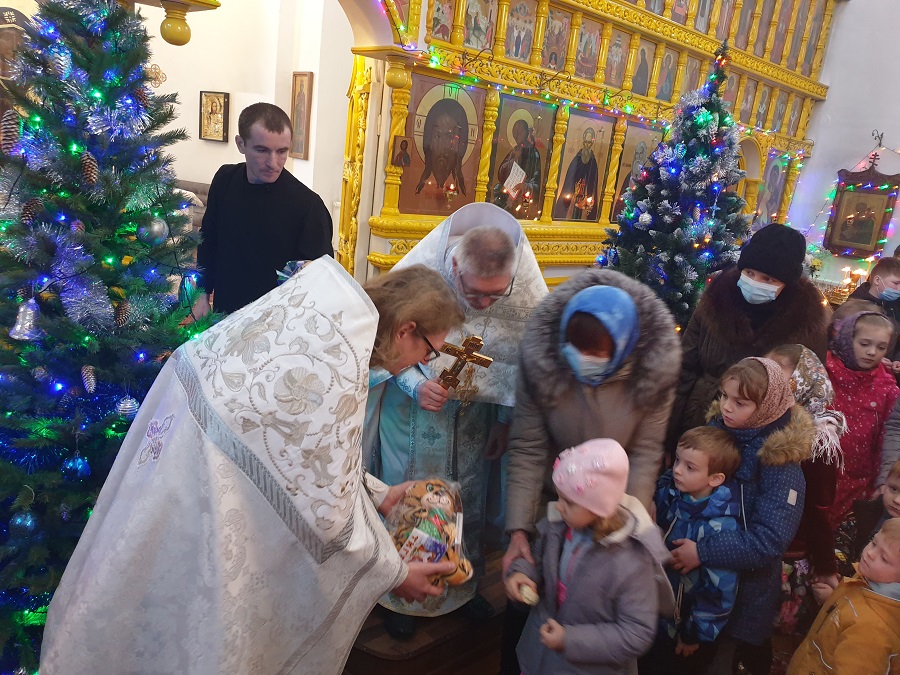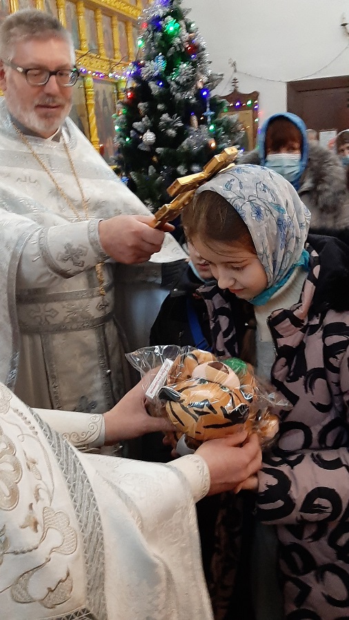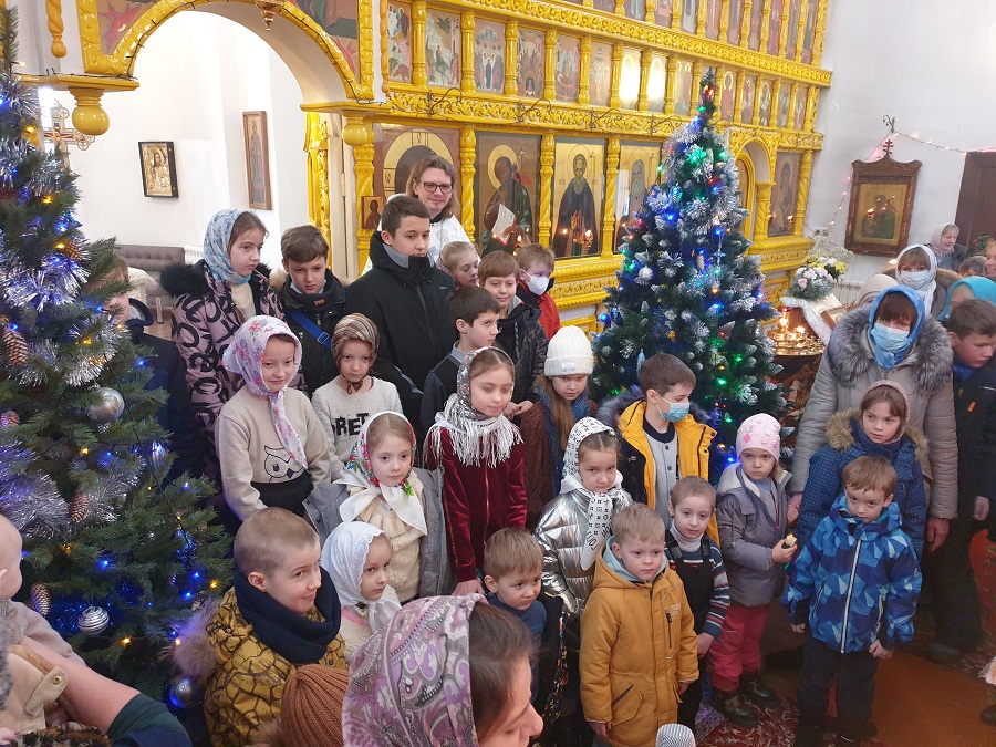 7 января 2022 г. были совершены две праздничные Божественные Литургии — ночная и утренняя. После утреннейЛитургии с праздником Рождества всех присутствующих поздравили воспитанники воскресной школы прихода. Всем детям были вручены сладкие подарки и организован стол с угощениями.