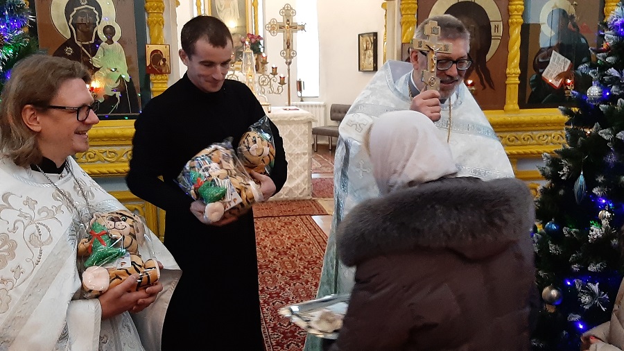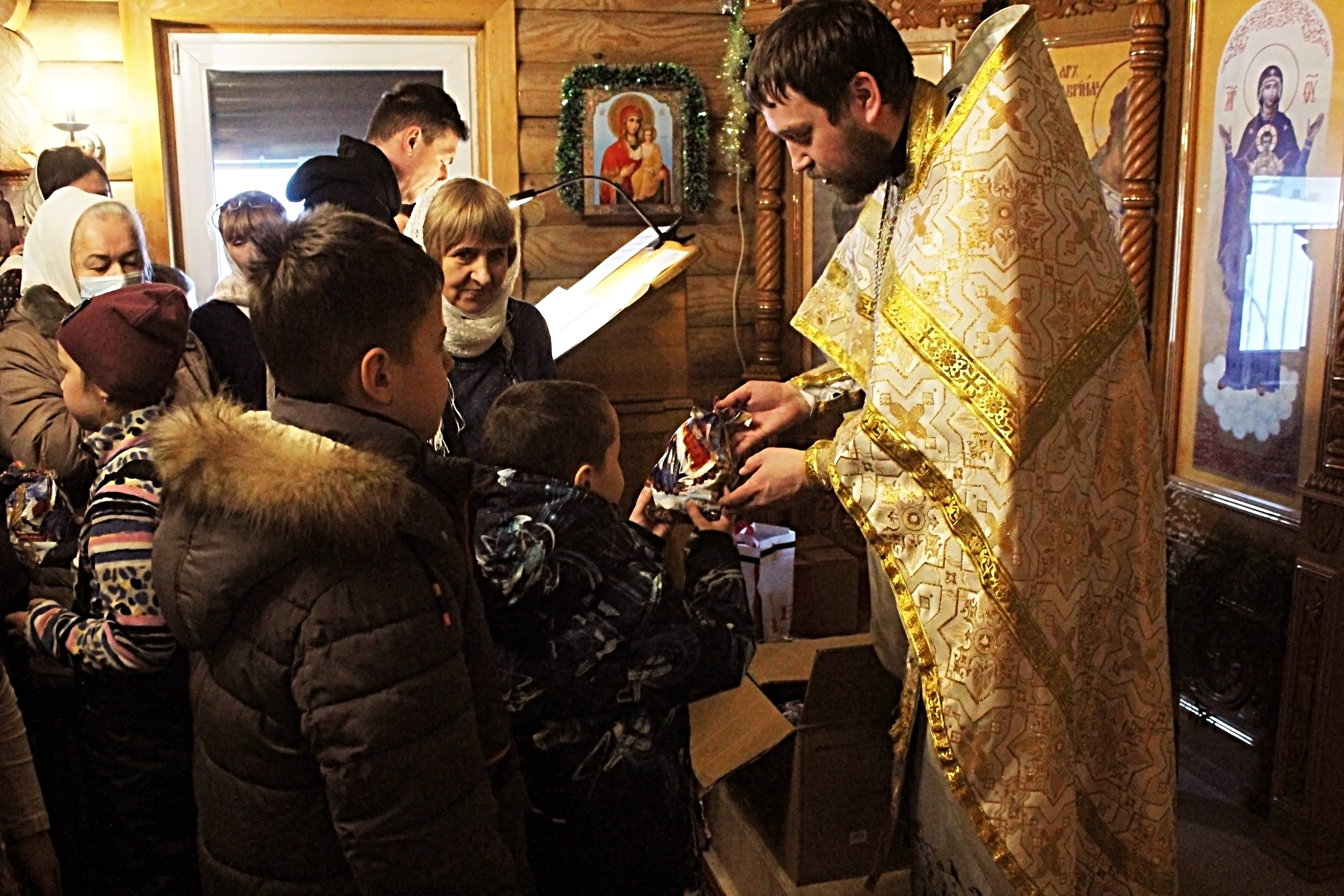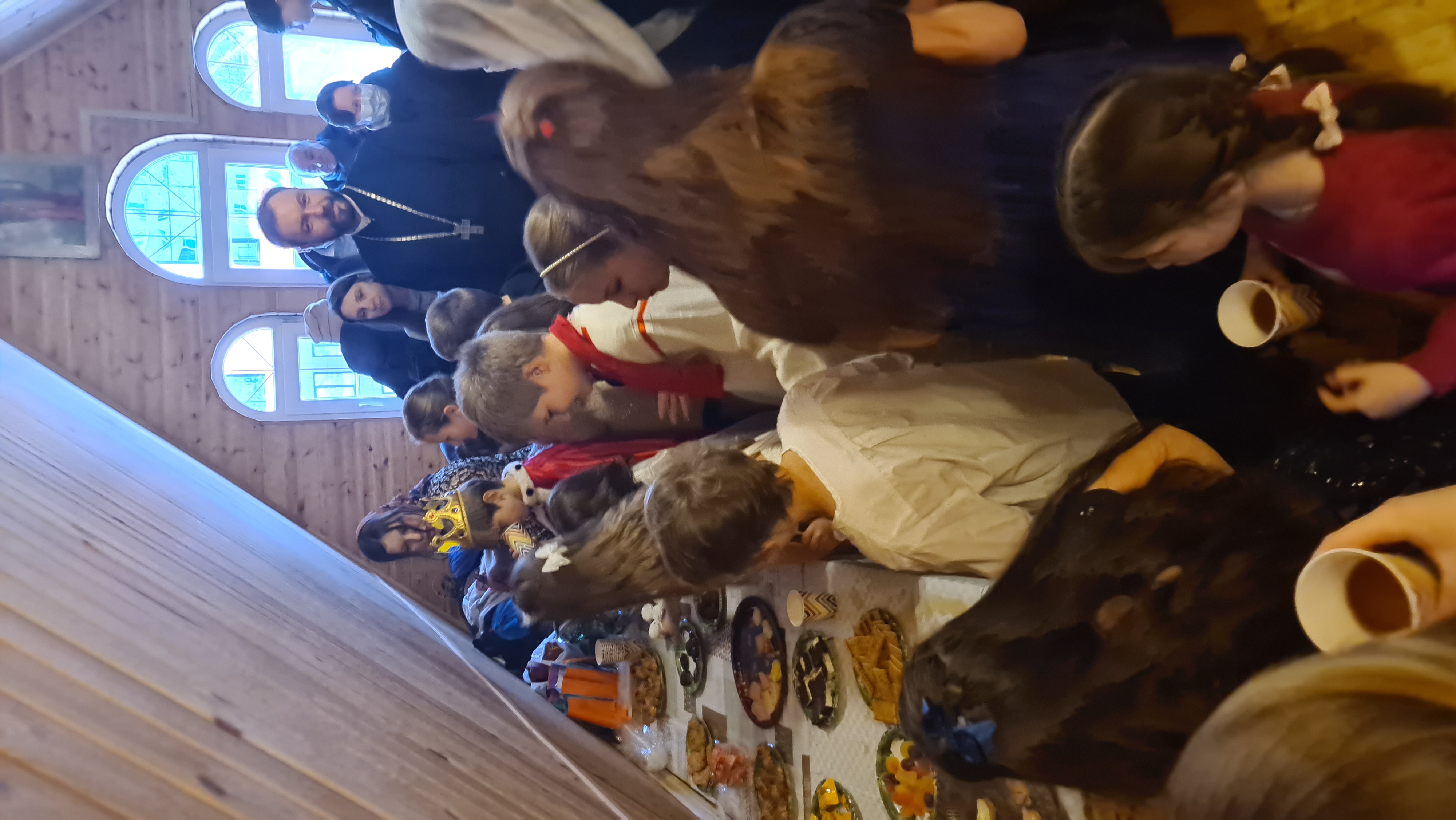 7 января 2022 г. были совершены две праздничные Божественные Литургии — ночная и утренняя. После утреннейЛитургии с праздником Рождества всех присутствующих поздравили воспитанники воскресной школы прихода. Всем детям были вручены сладкие подарки и организован стол с угощениями.
