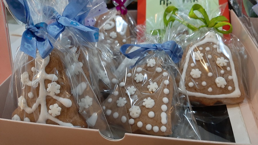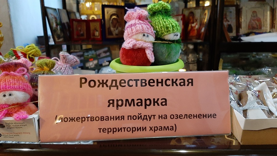 По благословению настоятеля в храме проходит Рождественская ярмарка. Прихожане сшили мягкие игрушки – веселых снеговиков – и испекли имбирное печенье. Все вырученные средства пойдут на благоустройство территории вокруг церкви.