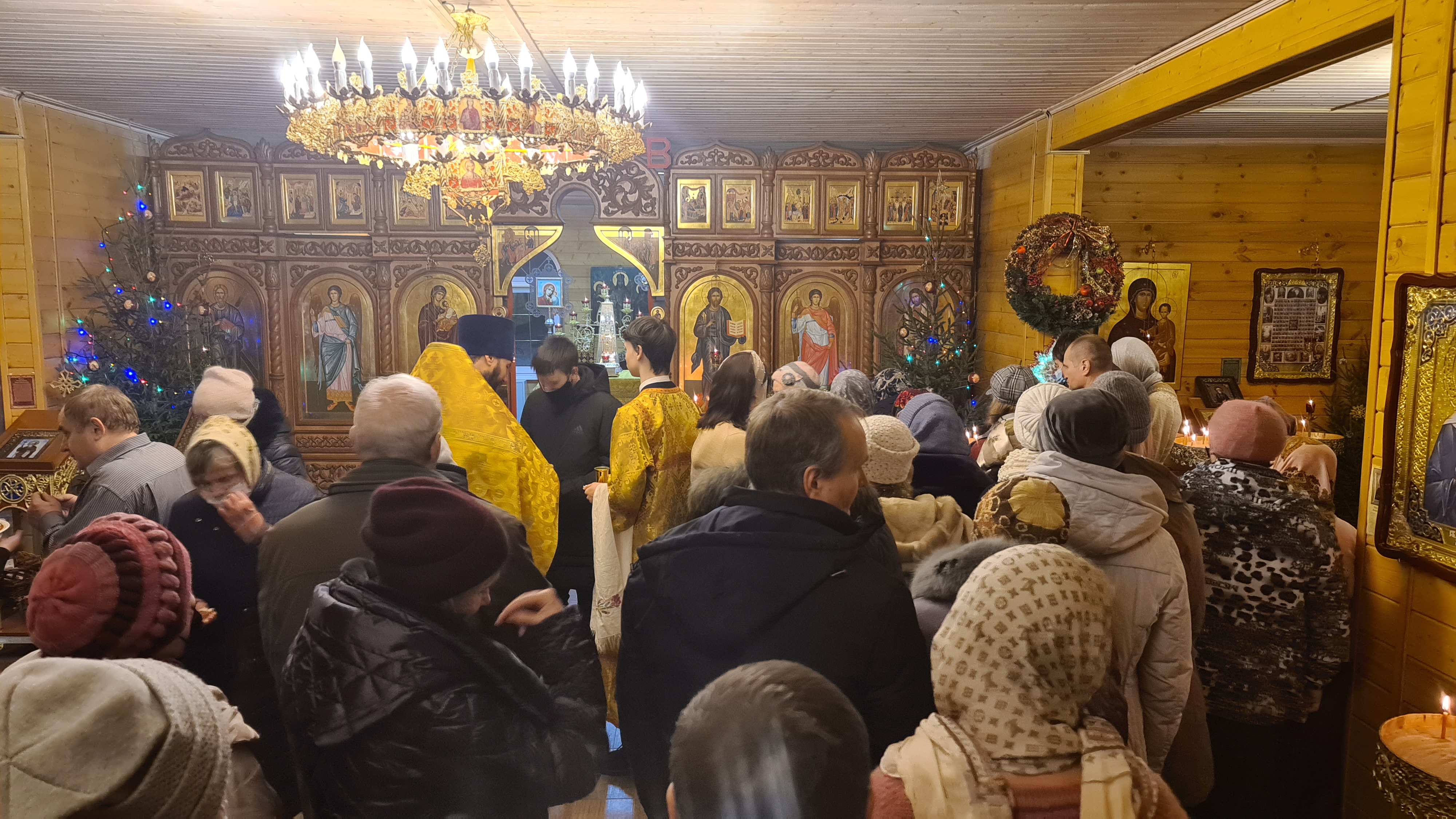 На Рождественской праздничной службе прихожане собрались, чтобы разделить радость совместной молитвы и поклониться Родившемуся Христу. Божественную литургию совершили настоятель храма иерей Андрей Волков и клирик прихода иерей Василий Зверев.