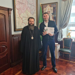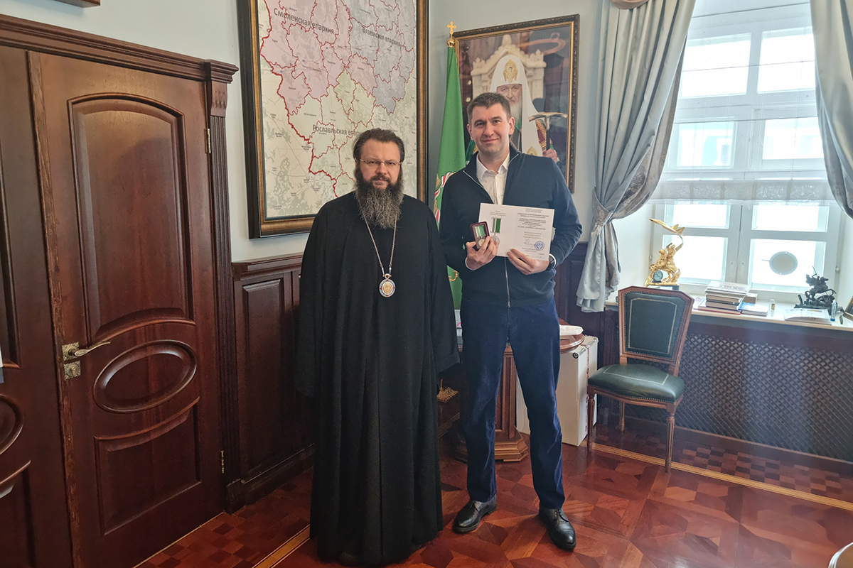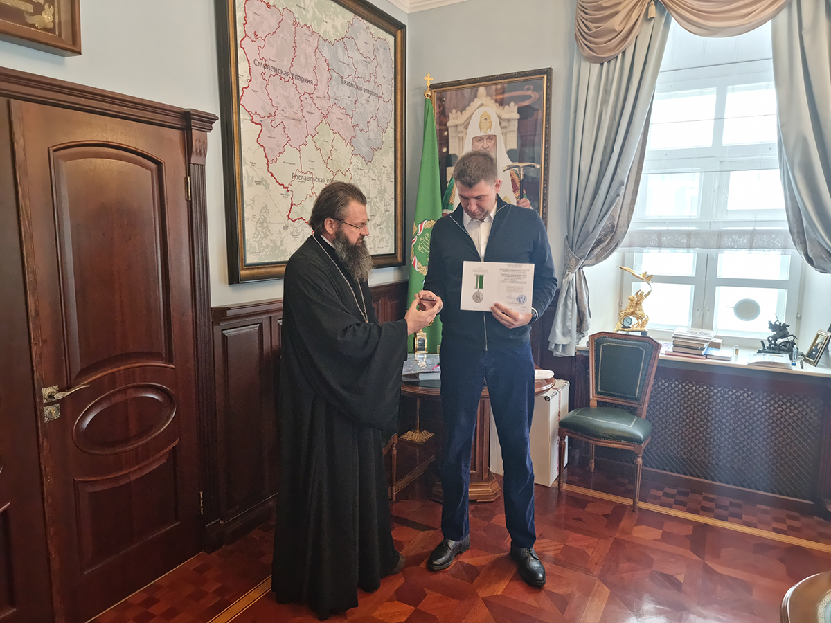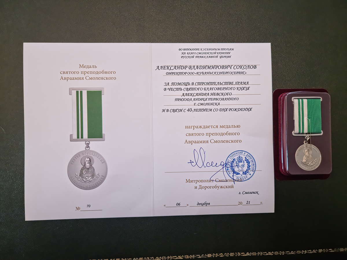 По окончании совещания Высокопреосвященнейший Владыка Исидор наградил Александра Владимировича Соколова медалью святого преподобного Авраамия Смоленского во внимание за помощь в строительстве храма в честь святого благоверного князя Александра Невского.