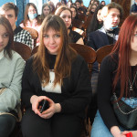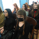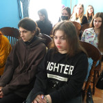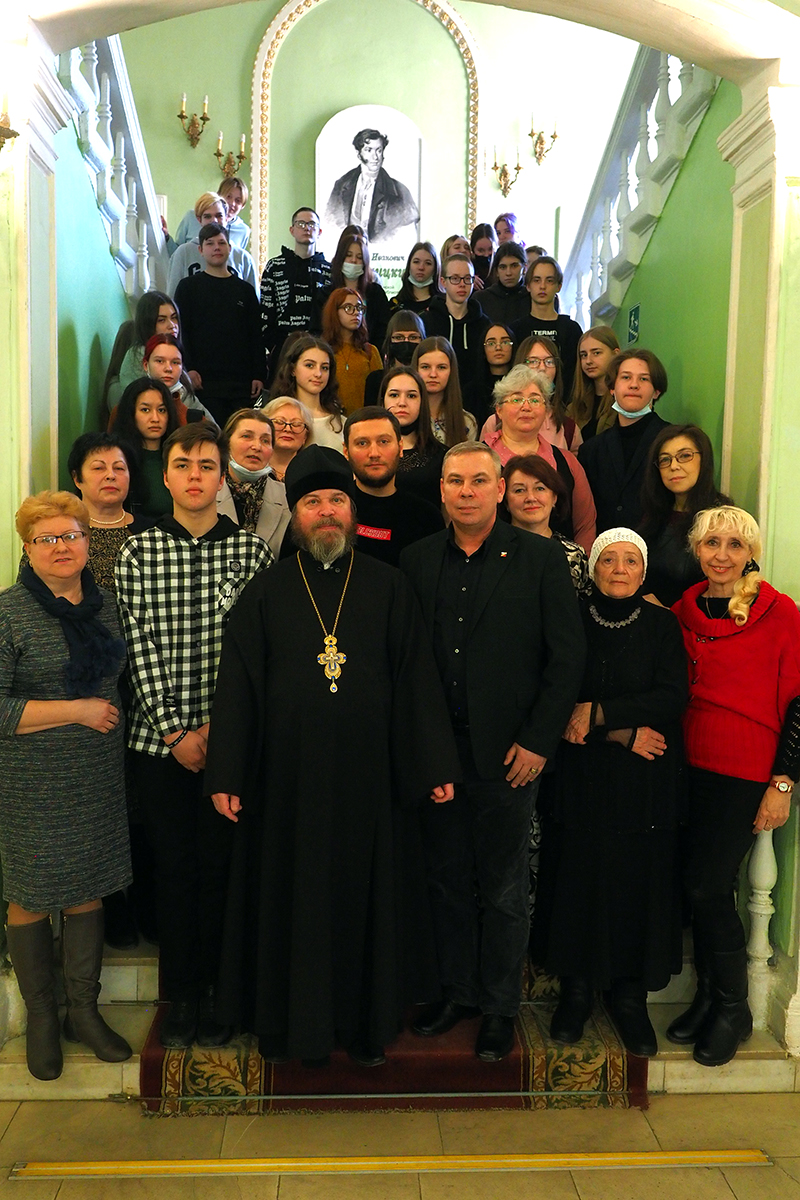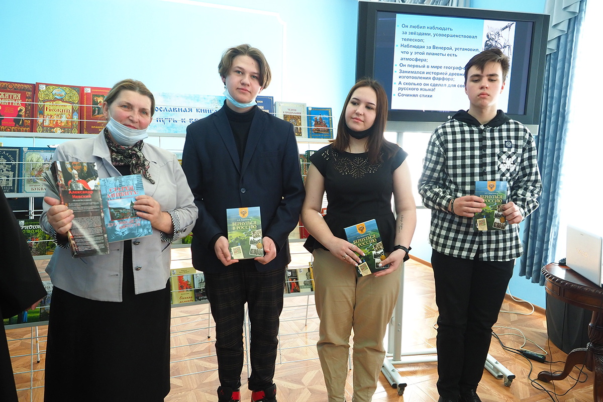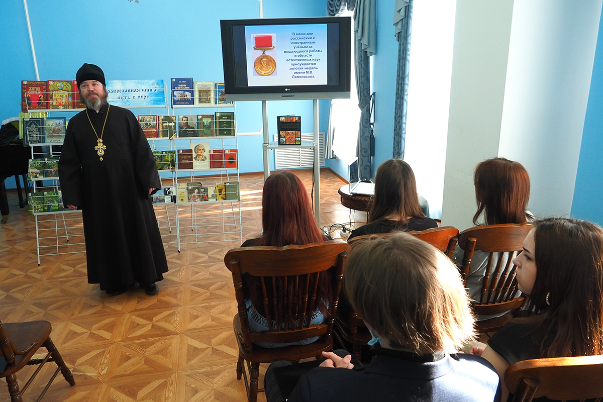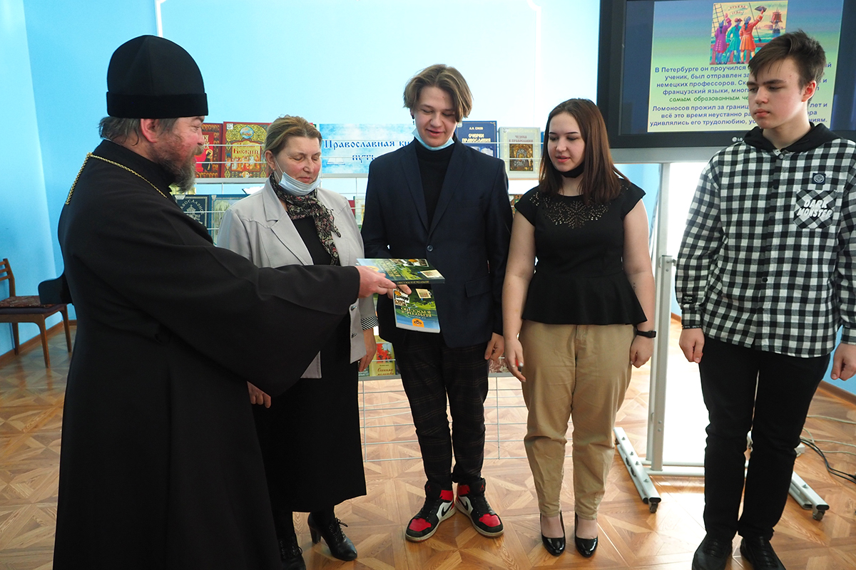Эта тема была продолжена студентами Смоленского филиала РЭУ им. Г.В. Плеханова. Они зачитали стихотворения Михаила Ломоносова. Каждому из выступающих о. Михаил вручил православную литературу.