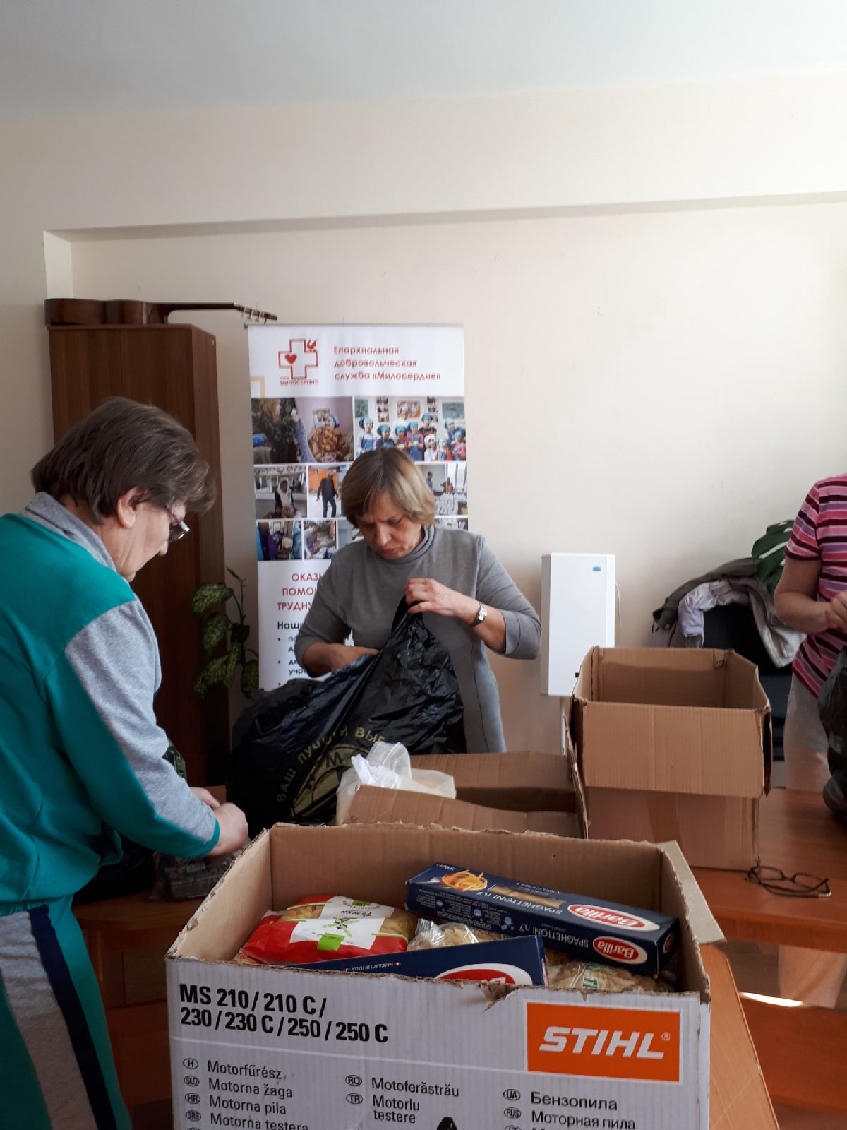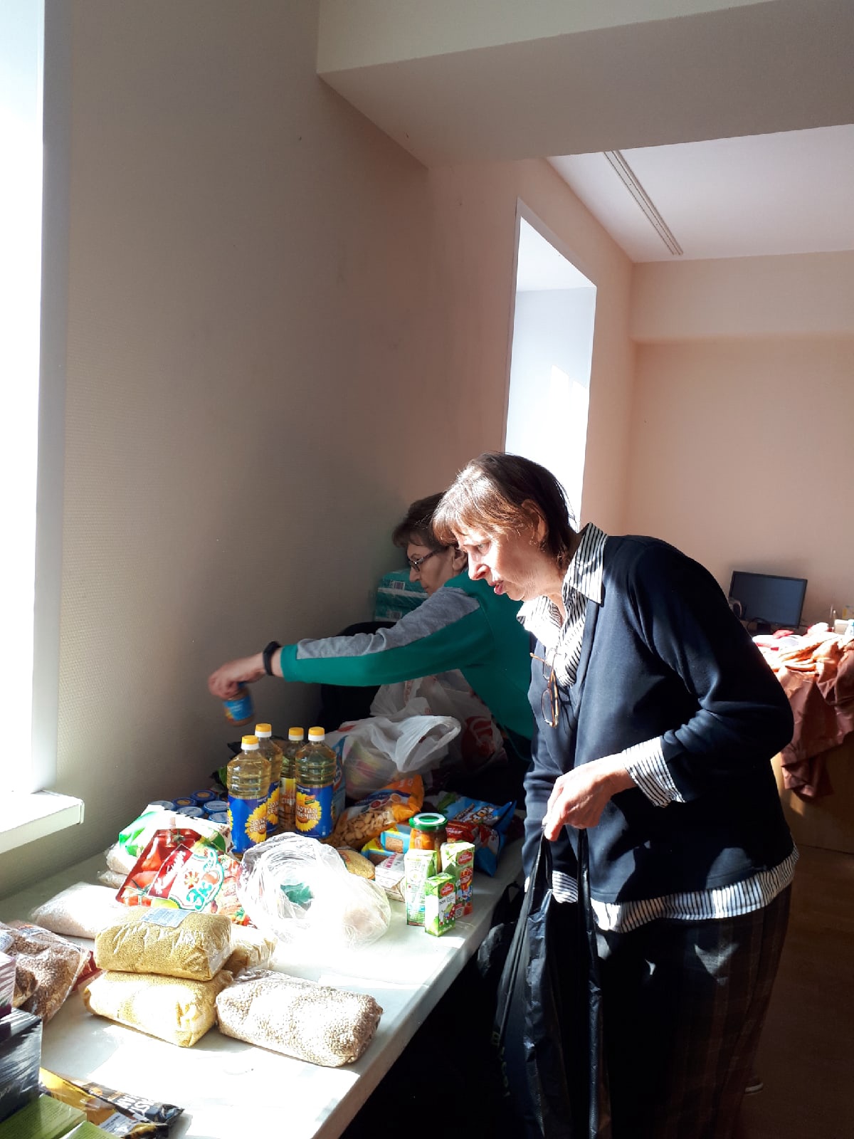 16 марта 2022 года «Серебряные волонтеры» вместе с координатором Надеждой Петрусевой смогли рассортировать крупы, макароны и другие продукты длительного срока хранения для последующей отправки вынужденным переселенцам с территории Донецкой и Луганской народных республик.