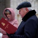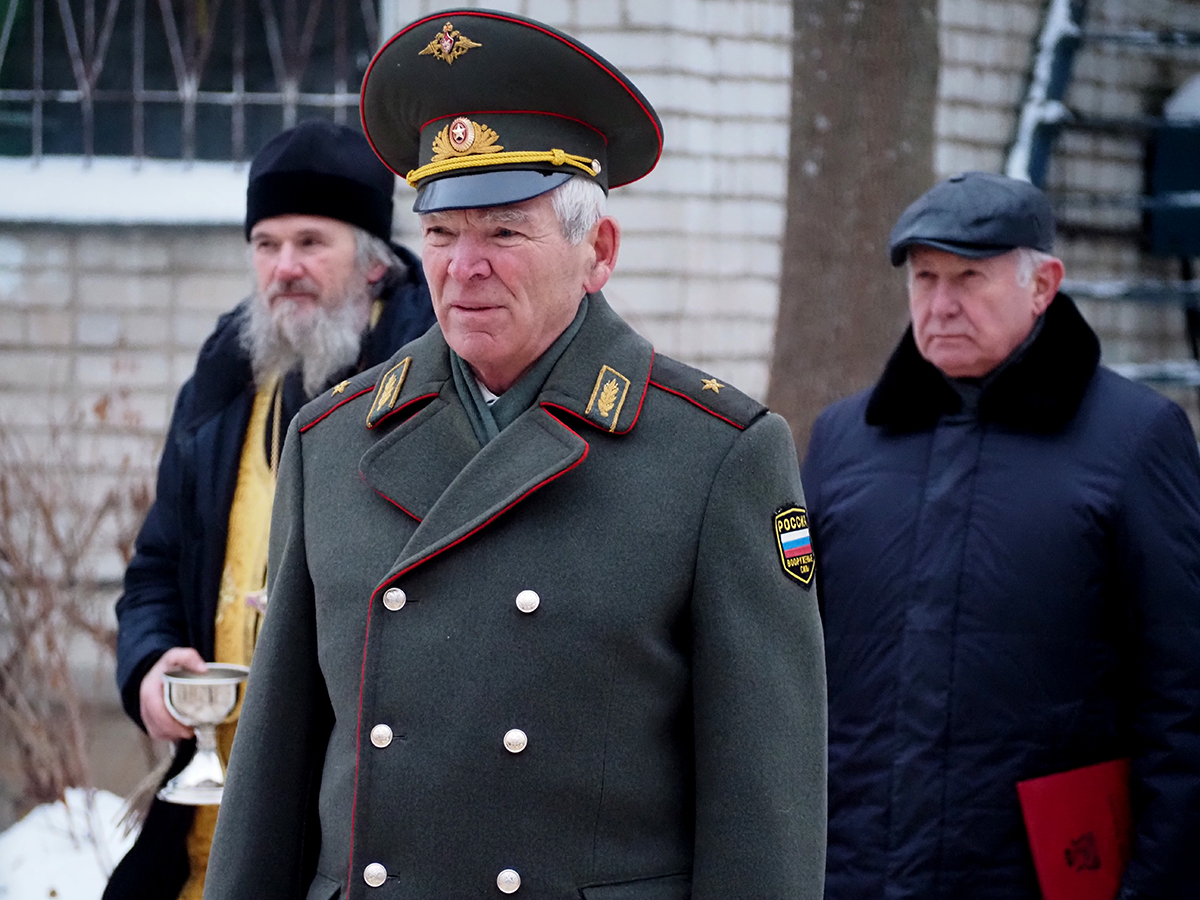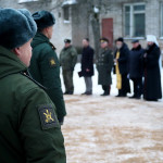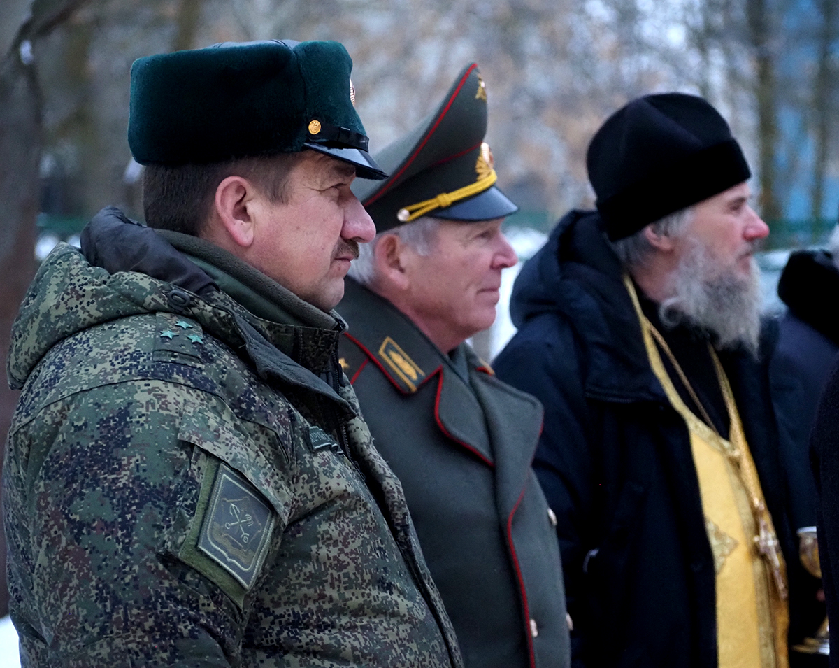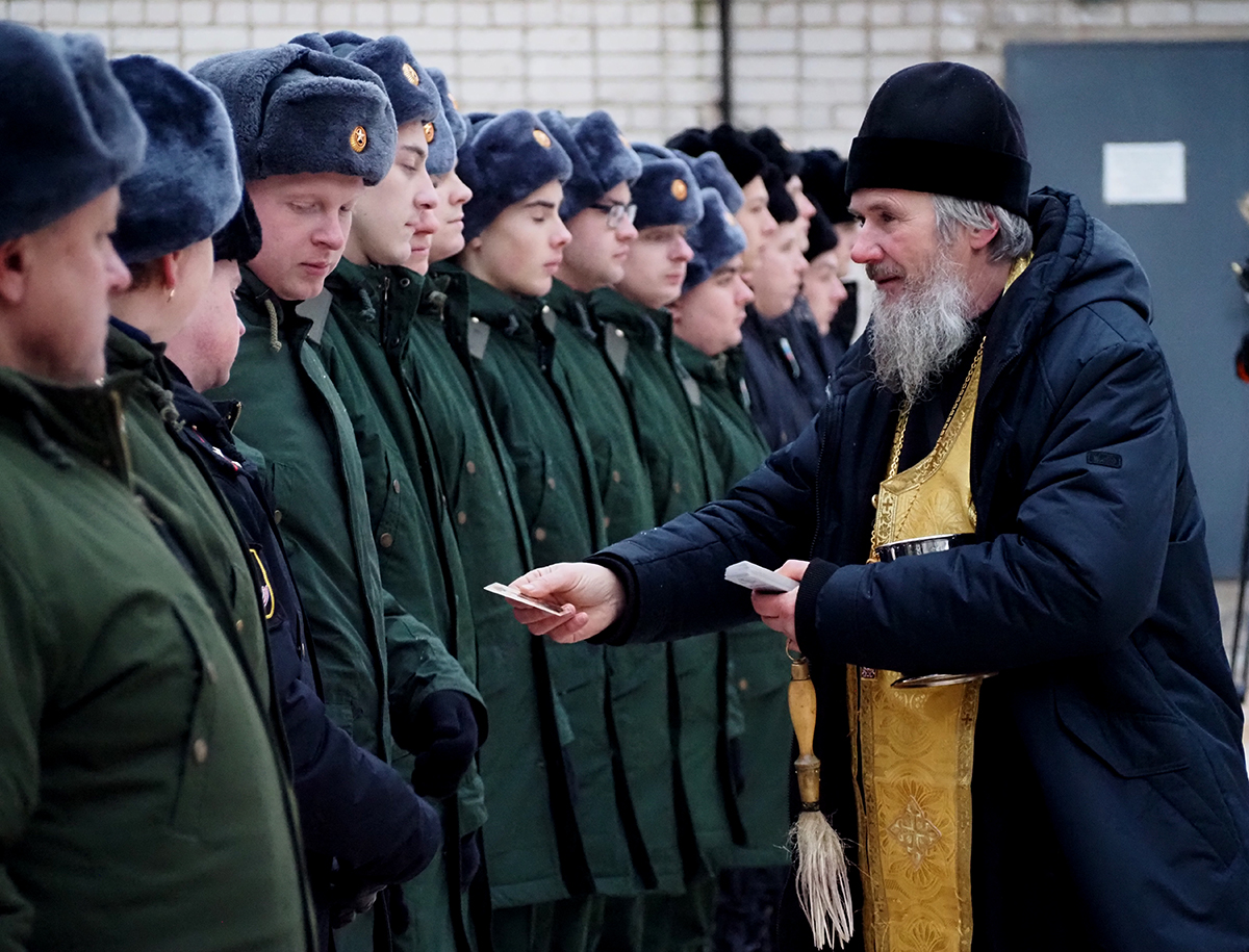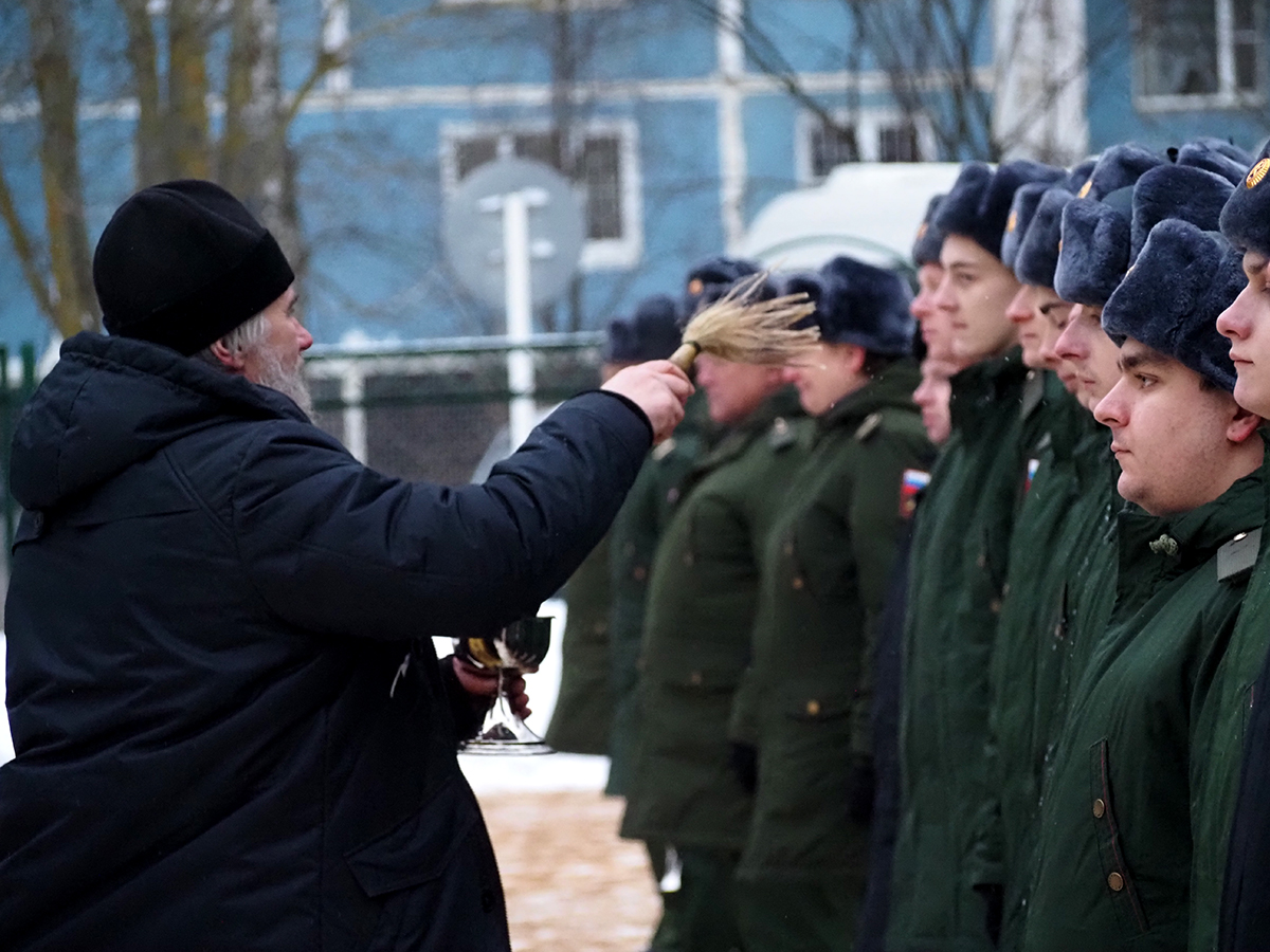 Протоиерей Владимир Дмитриев окропил рядовых святой водой и вручил карманные иконы Смоленской иконы Божией Матери «Одигитрия».