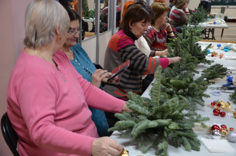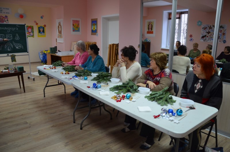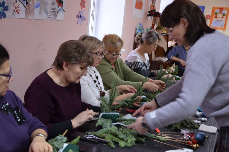 Пенсионеры учились создавать шедевры из ароматной пихты «Нобилис» и блестящих новогодних шаров.