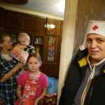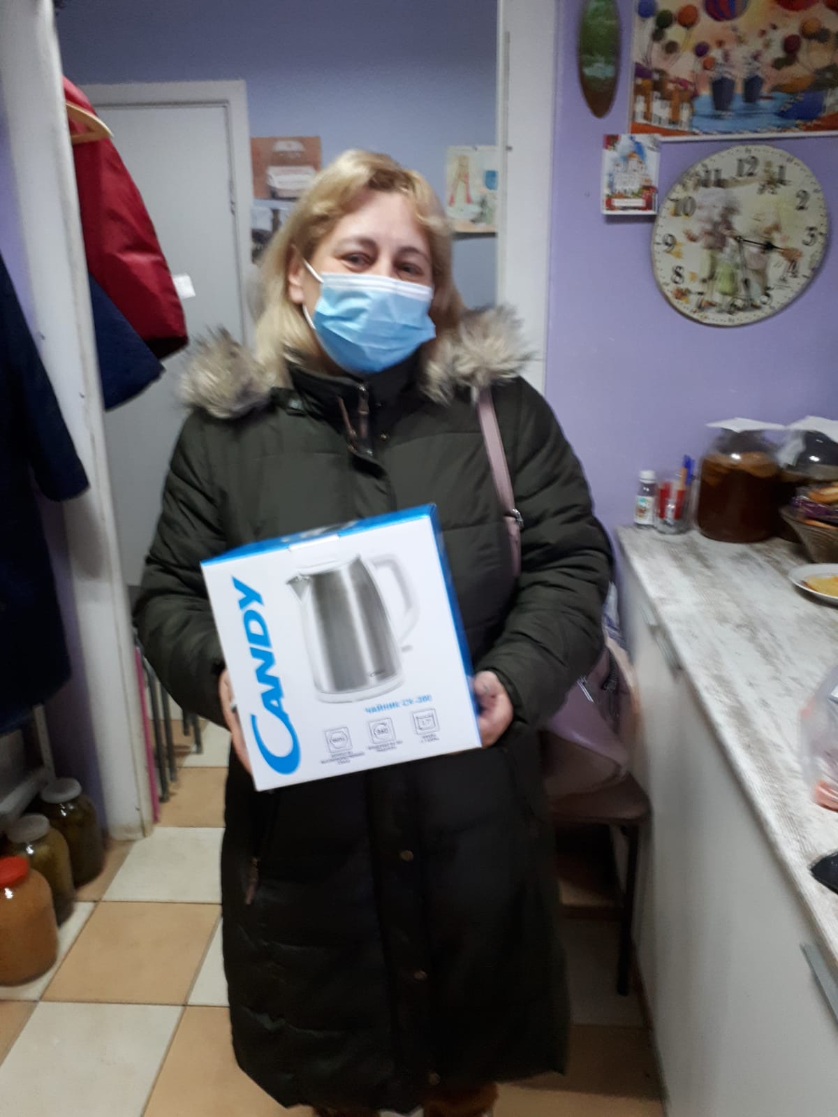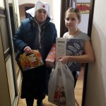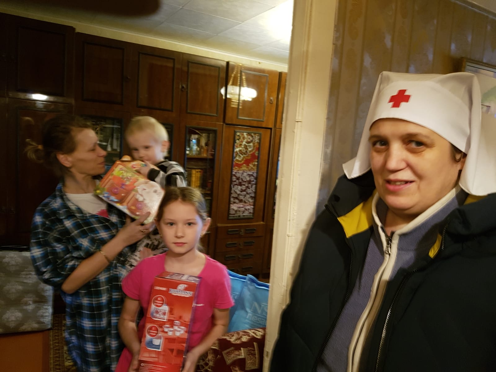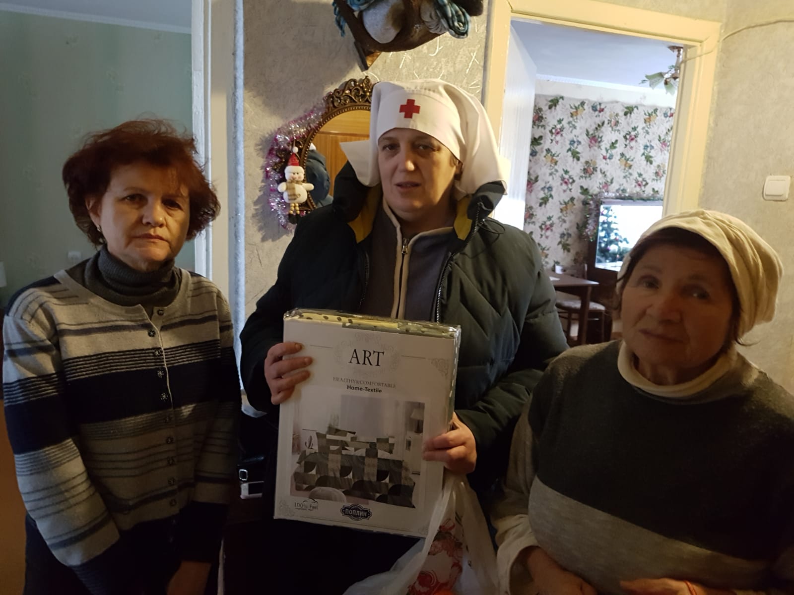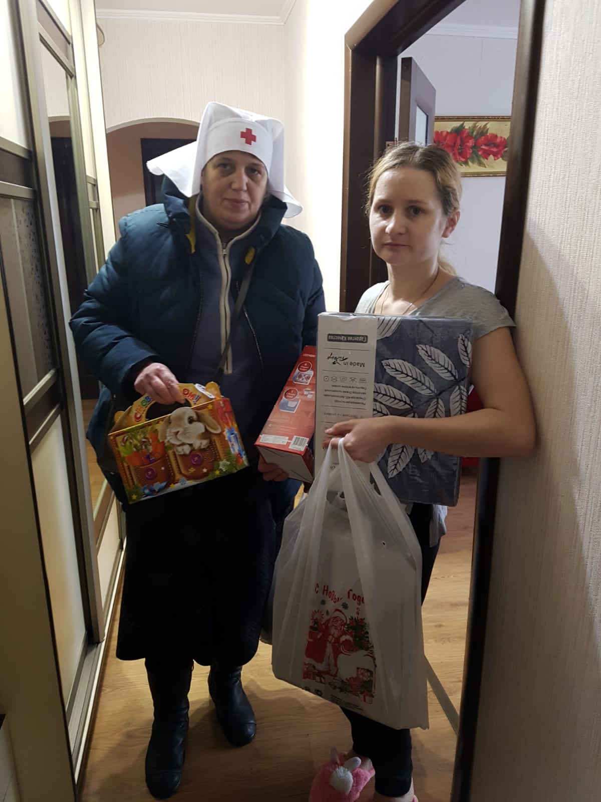 Сестра милосердия Наталья Демкина вместе с добровольцем службы Еленой Яковлевной отправились адресно поздравить нуждающихся. Подарки сугубо бытовые – посуда, постельное белье, памперсы для взрослых.
