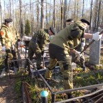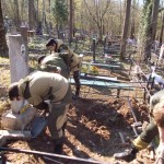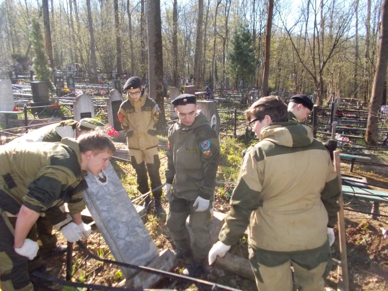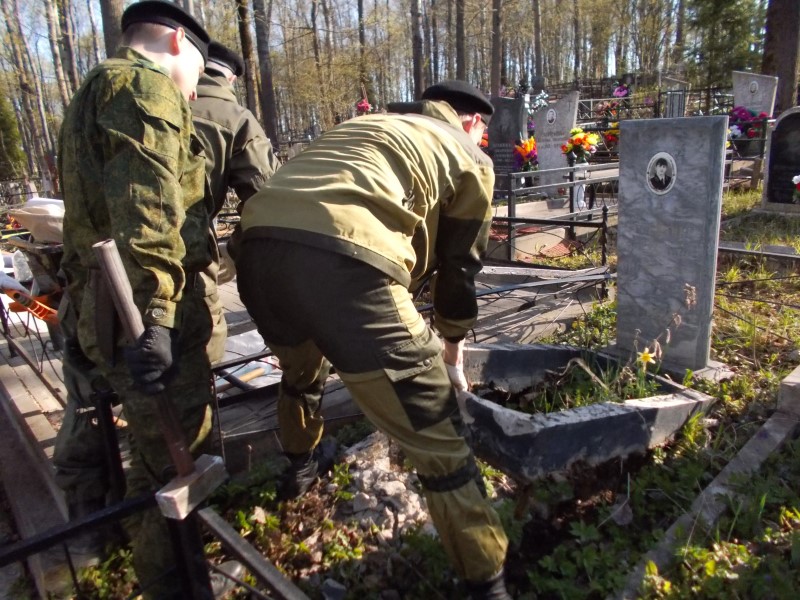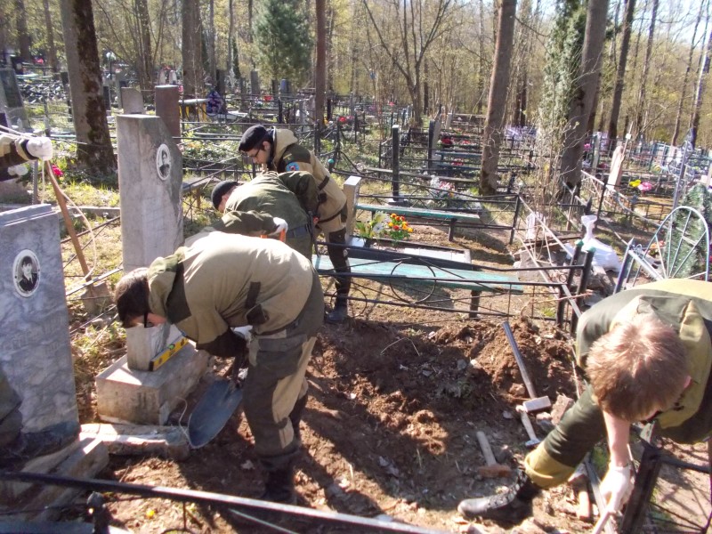 В результате за один день успели многое. Были сняты пришедшие в негодность отдельные цветочницы, памятники передвинуты на ровный уровень, установлено новое общее надгробие, которое засыпали песком. Также сняты смятые участки ограды, приварены новые. Произведена окраска ограждения в целом. По окончанию всех работ на могилу возложены привезенные цветы.