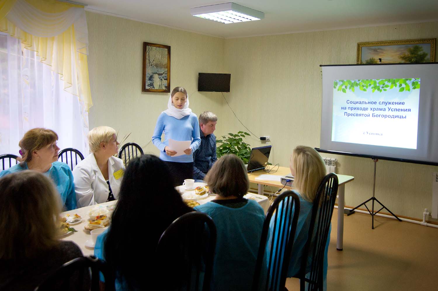 Директор АУ ТО КЦСОН Тюменского района Мостовщиков Дмитрий Владимирович провел экскурсию по Отделению, после чего руководитель Социальной службы храма Лысенок Л.Н. выступила с докладом, в котором осветила краткую историю развития Церковного Социального служения в России. Гости узнали о том, как развивается Социальное служение на сельском приходе и как на практике осуществляется церковный Социальный проект «К пожилым - с заботой», реализуемый в рамках совместного сотрудничества Прихода нашего храма и Отделения Милосердия.