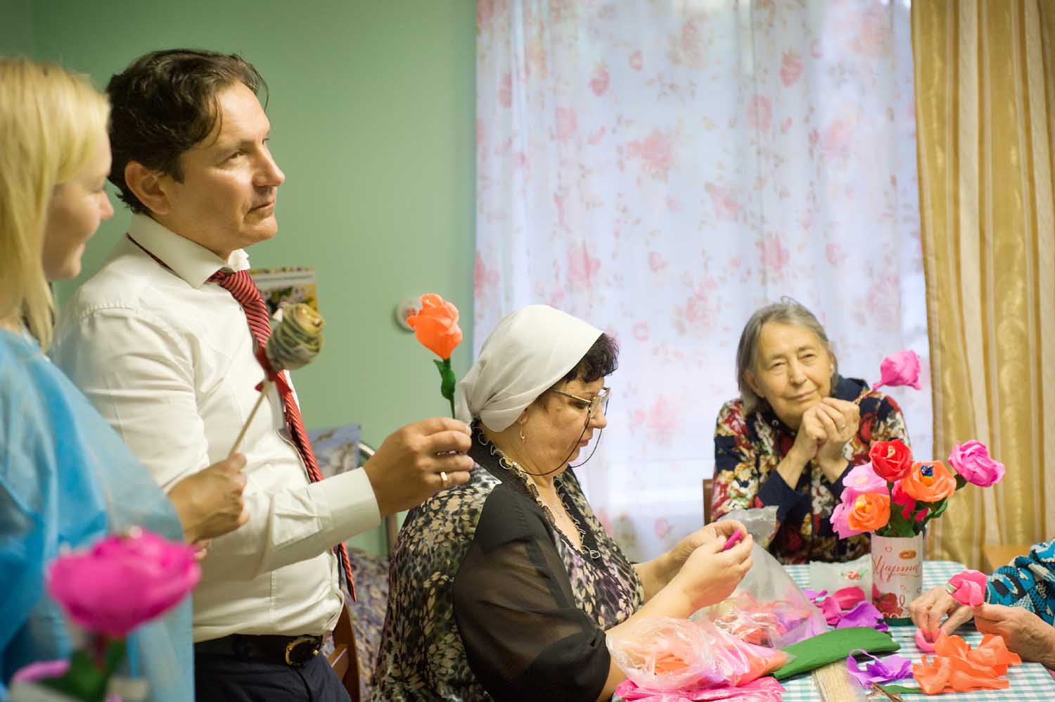 Добровольцы Социальной службы нашего храма вместе с пожилыми, проживающими в учреждении, показали гостям мастер-класс по изготовлению бумажных цветочков.