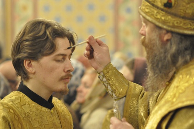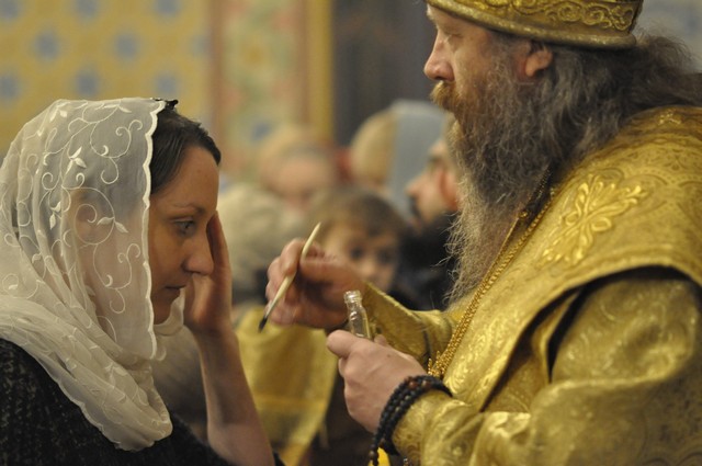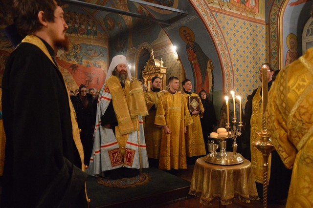 Во время чтения канона архипастырь помазал всех присутствующих святым миром от мощей святителя Николая из города Бари.
