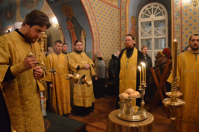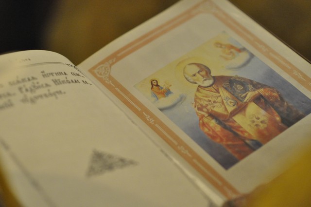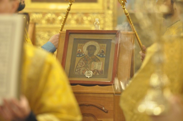 После пения тропарей на «Бог Господь» был прочитан акафист перед старинной иконой святителя Николая Чудотворца с частицей его мощей.