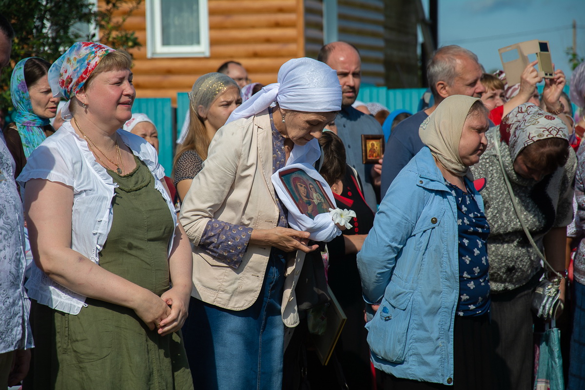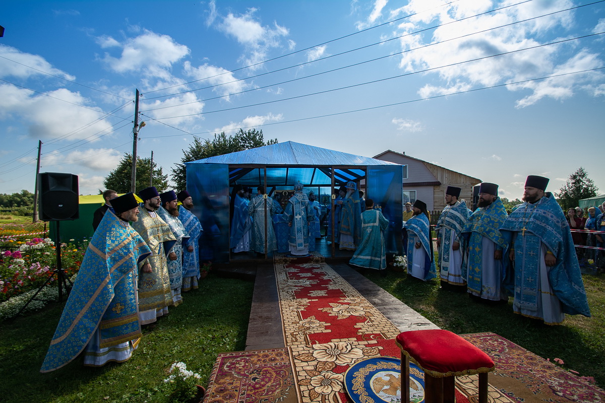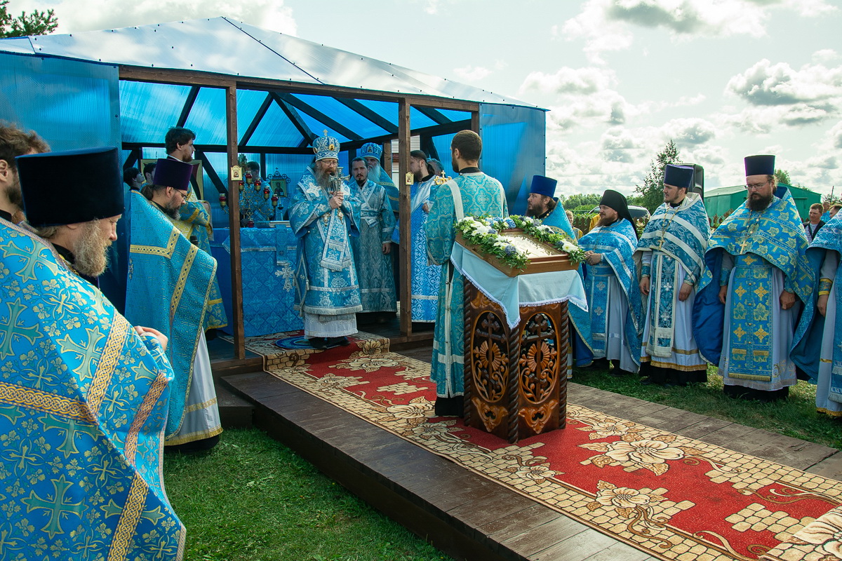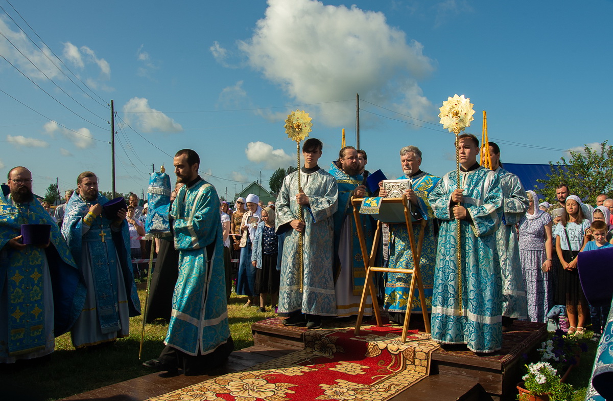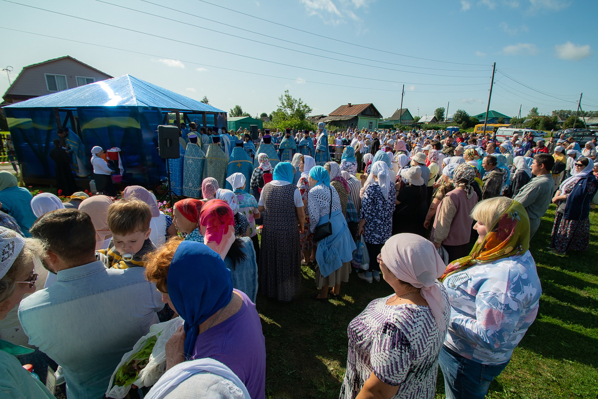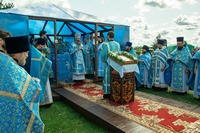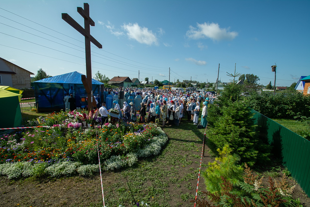 Почти незаметно преодолев пять километров пути, верующие собрались на святом месте, где был сооружён временный храм. Здесь митрополит Томский и Асиновский Ростислав возглавил под открытым небом праздничную Божественную литургию.