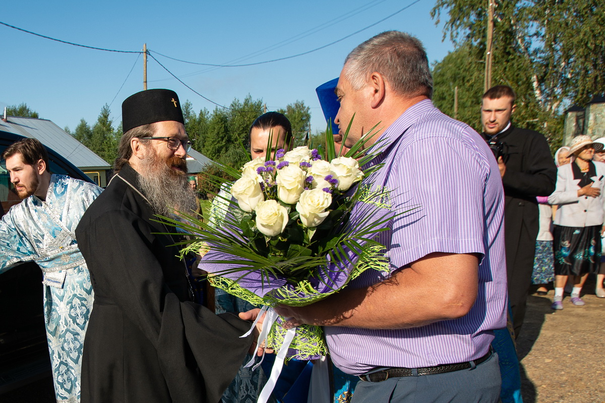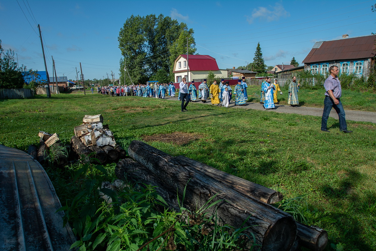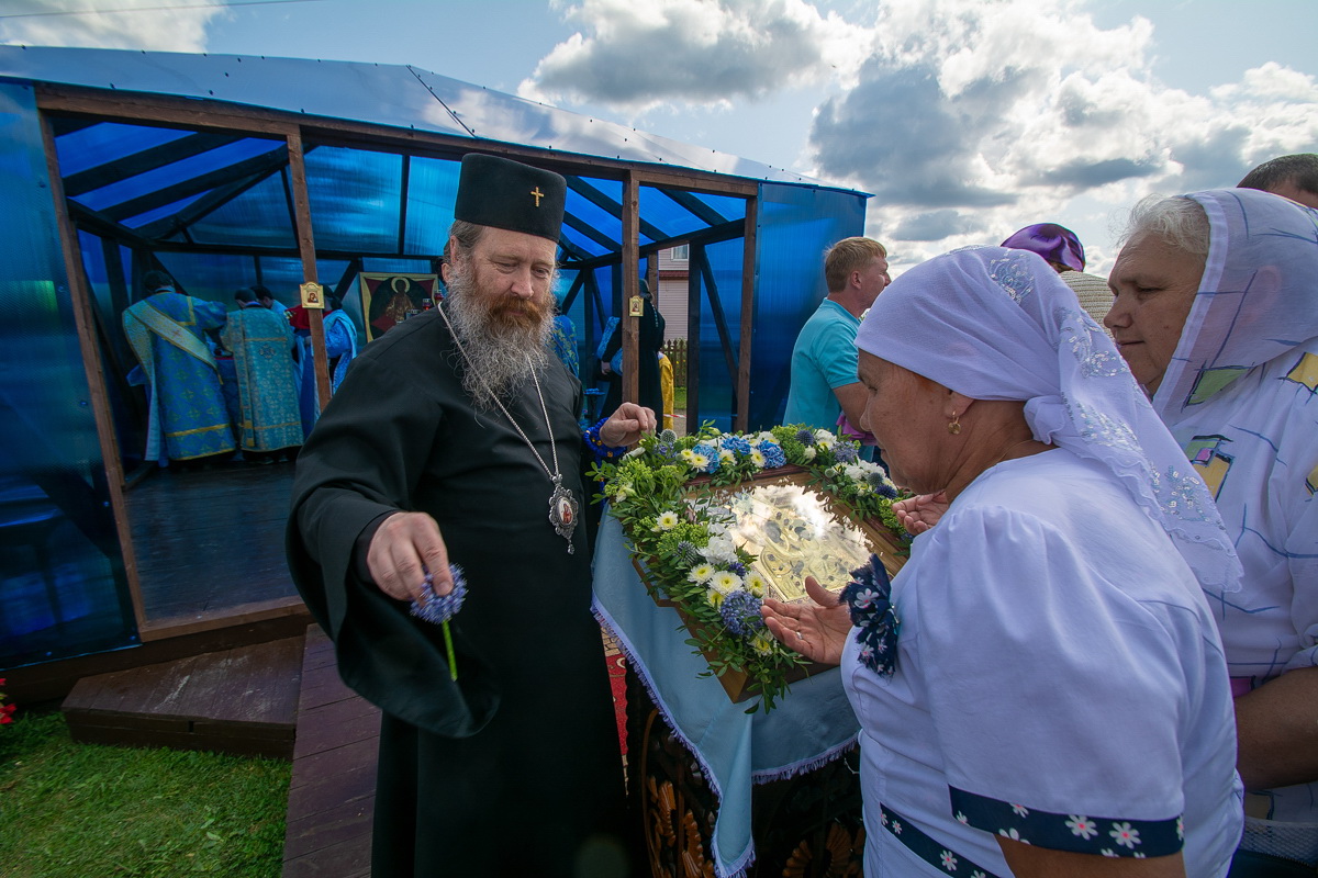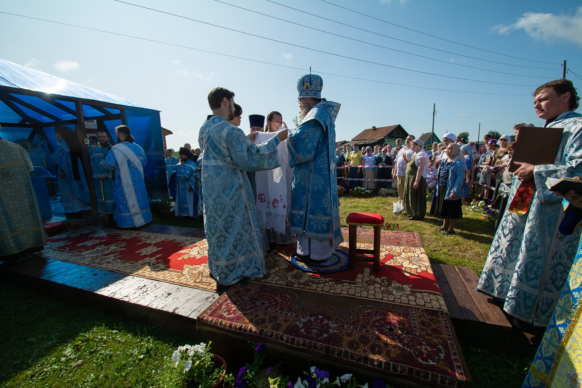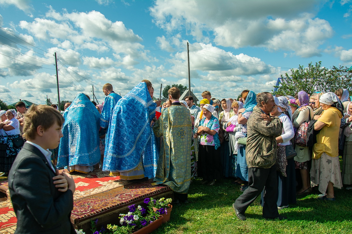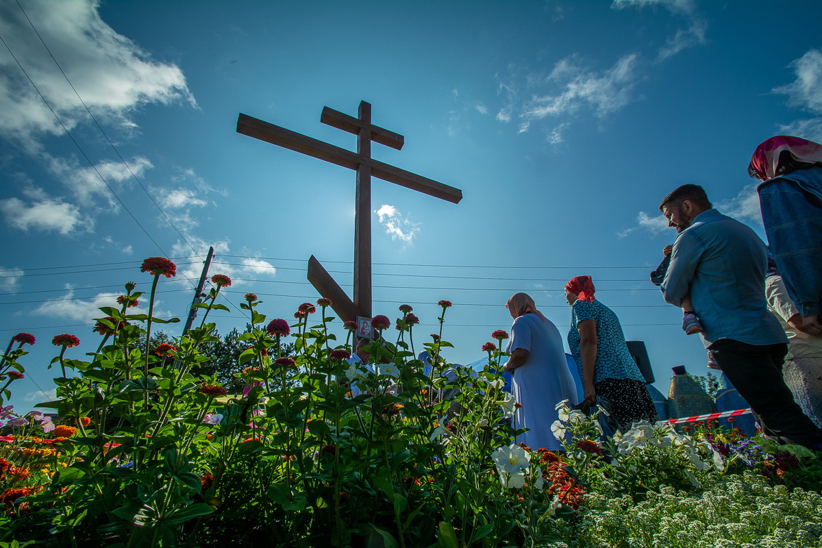 Почти незаметно преодолев пять километров пути, верующие собрались на святом месте, где был сооружён временный храм. Здесь митрополит Томский и Асиновский Ростислав возглавил под открытым небом праздничную Божественную литургию.