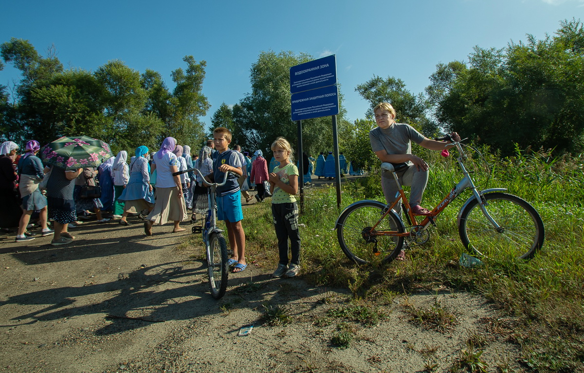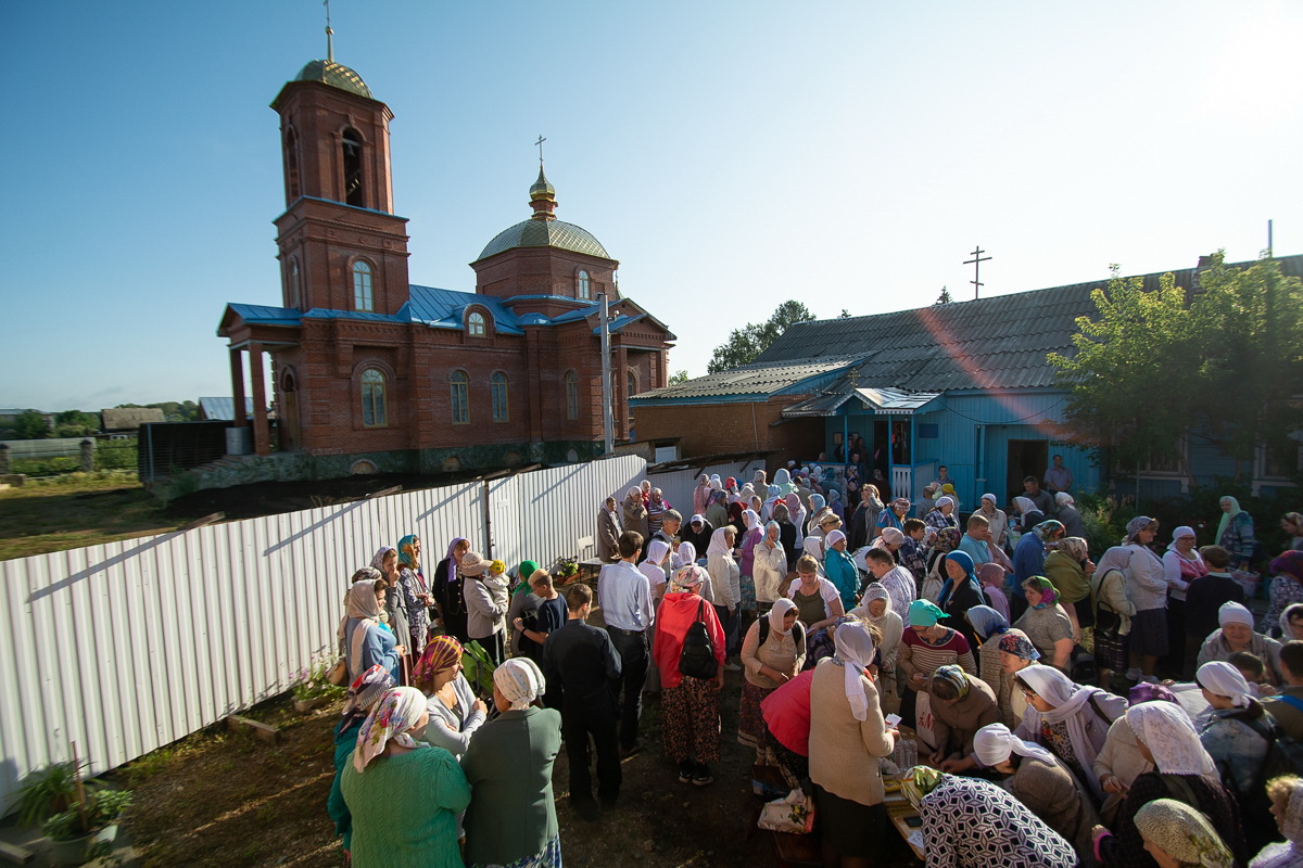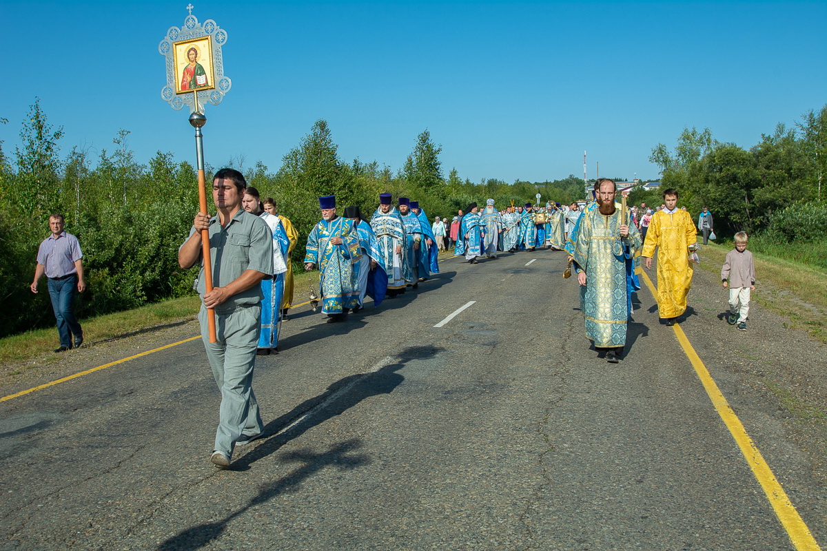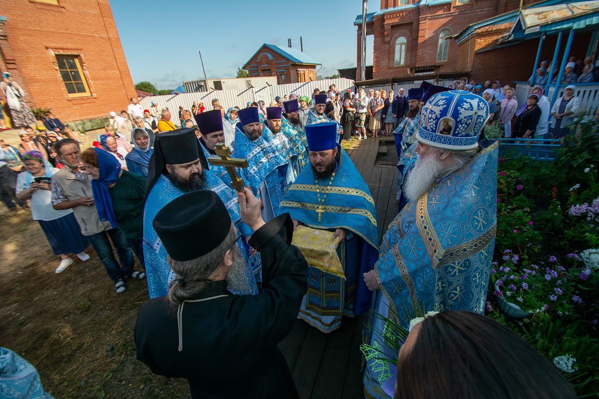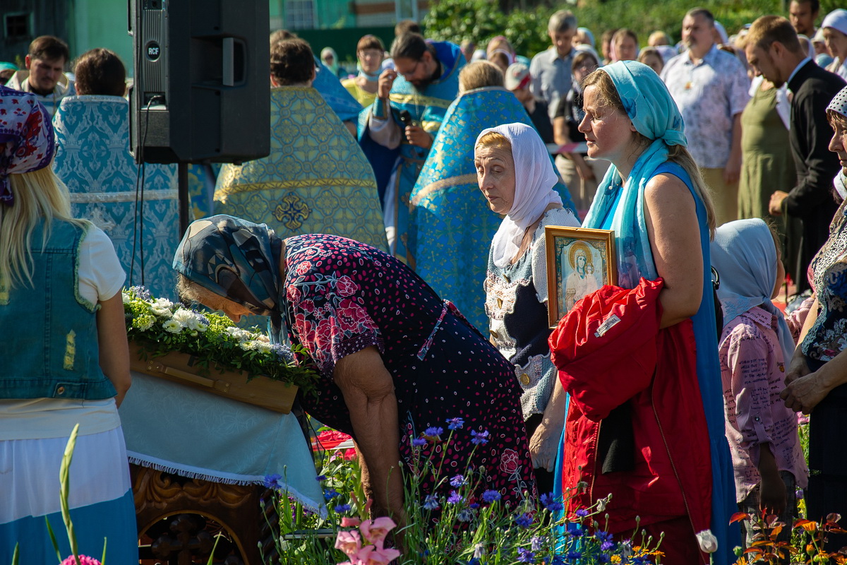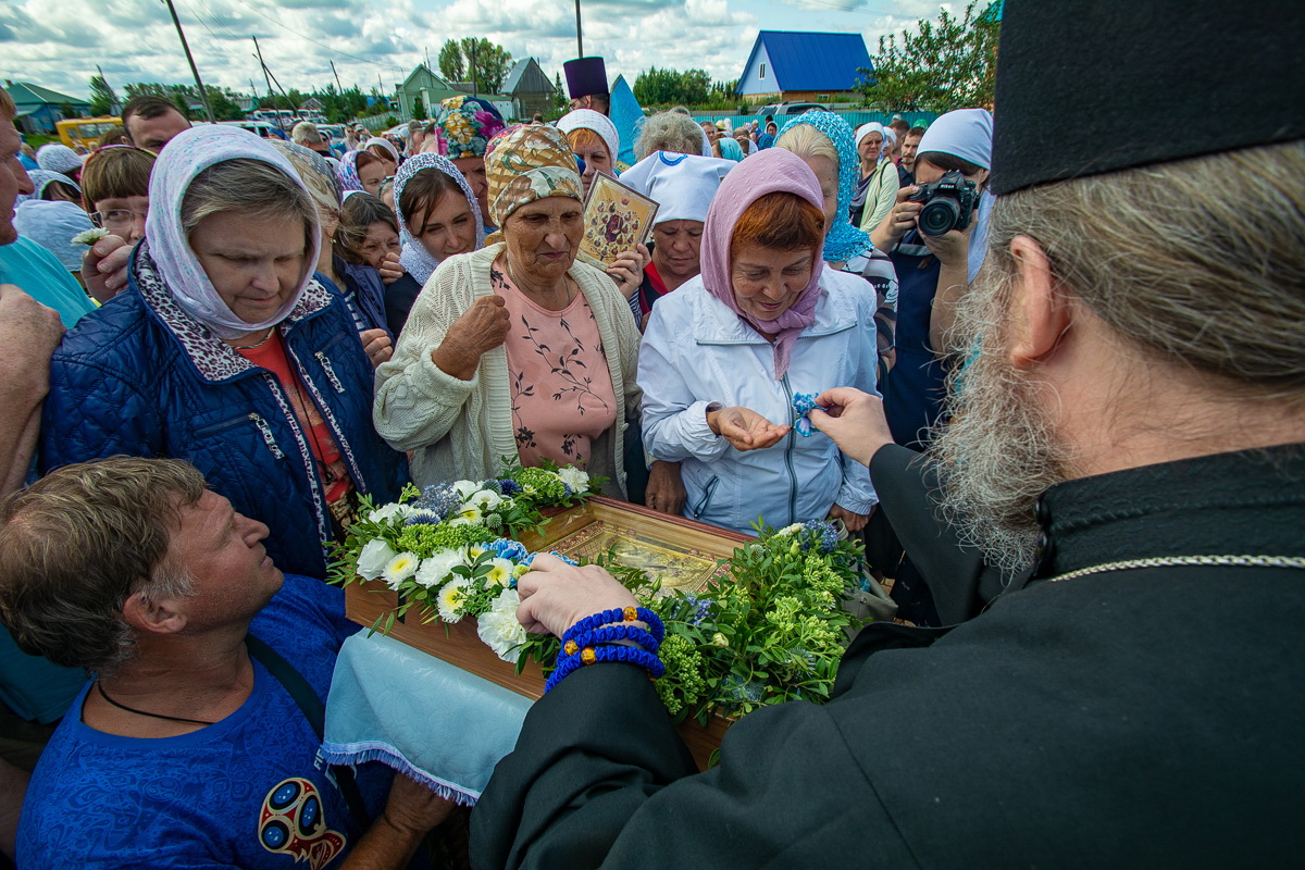 Почти незаметно преодолев пять километров пути, верующие собрались на святом месте, где был сооружён временный храм. Здесь митрополит Томский и Асиновский Ростислав возглавил под открытым небом праздничную Божественную литургию.