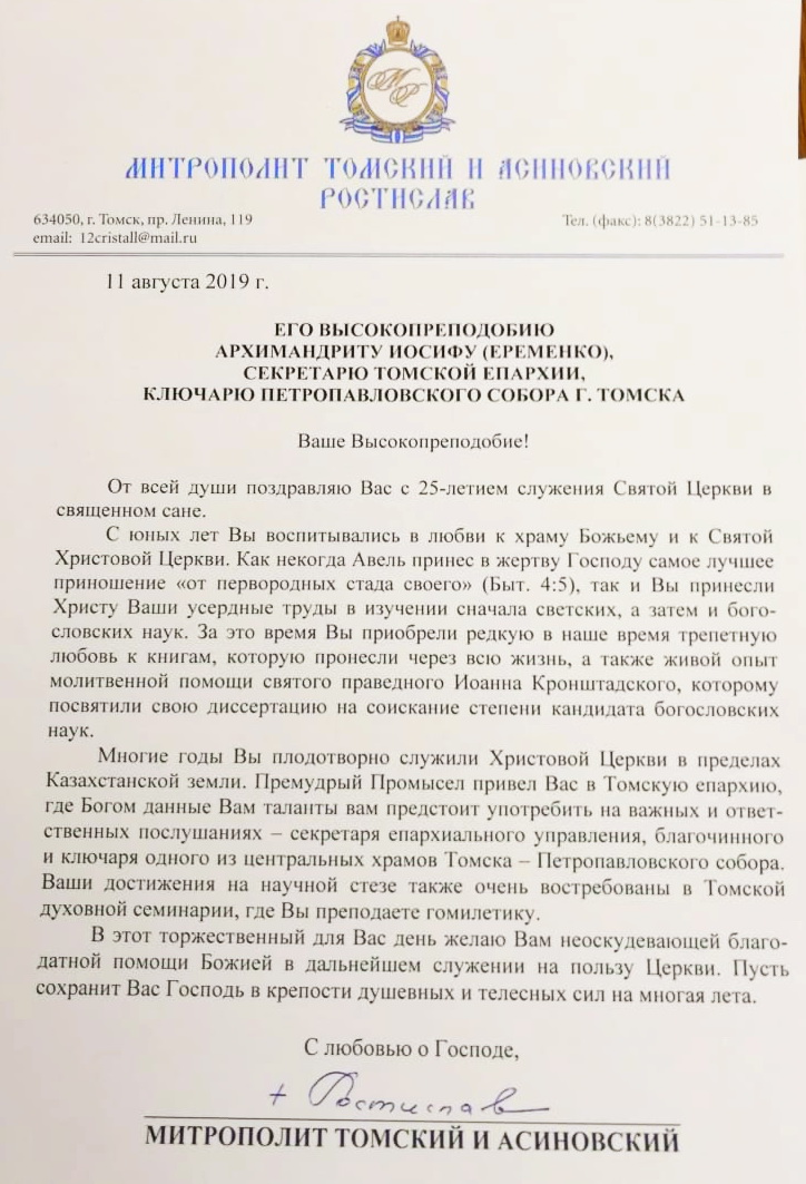 11 августа, в Неделю 8-ю по Пятидесятнице, память преподобномучеников Серафима и Феогноста Алма-Атинских, исполнилось 25 лет служения в священном сане секретаря Томской епархии архимандрита Иосифа (Еременко). По окончании Божественной Литургии в Богоявленском кафедральном соборе г. Томска митрополит Томский и Асиновский Ростислав поздравил архимандрита Иосифа с этой знаменательной датой и пожелал неоскудевающей помощи Божией в дальнейшем служении на пользу Церкви Христовой.