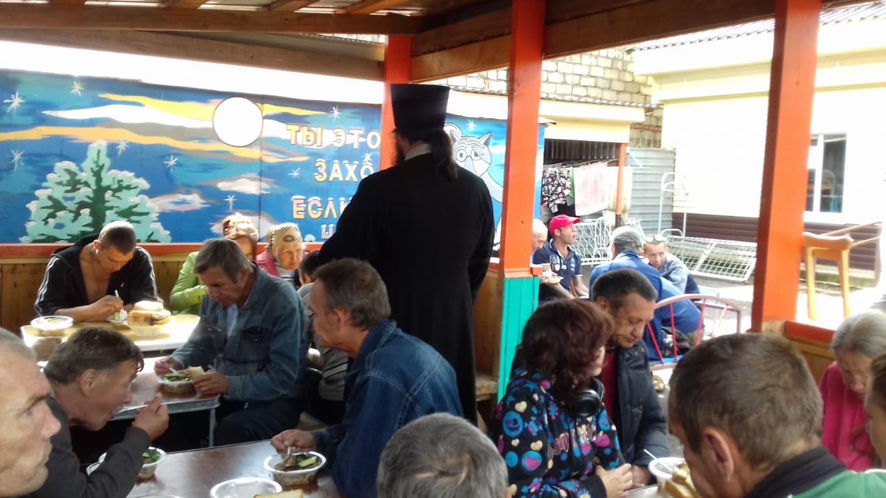 Всем пришедшим была предложена трапеза из двух свежих горячих блюд: супа, гречневой каши с котлетой, а также компота. Кроме того, всех угостили яблоками и виноградом, освященными в честь праздника Преображения Господня.