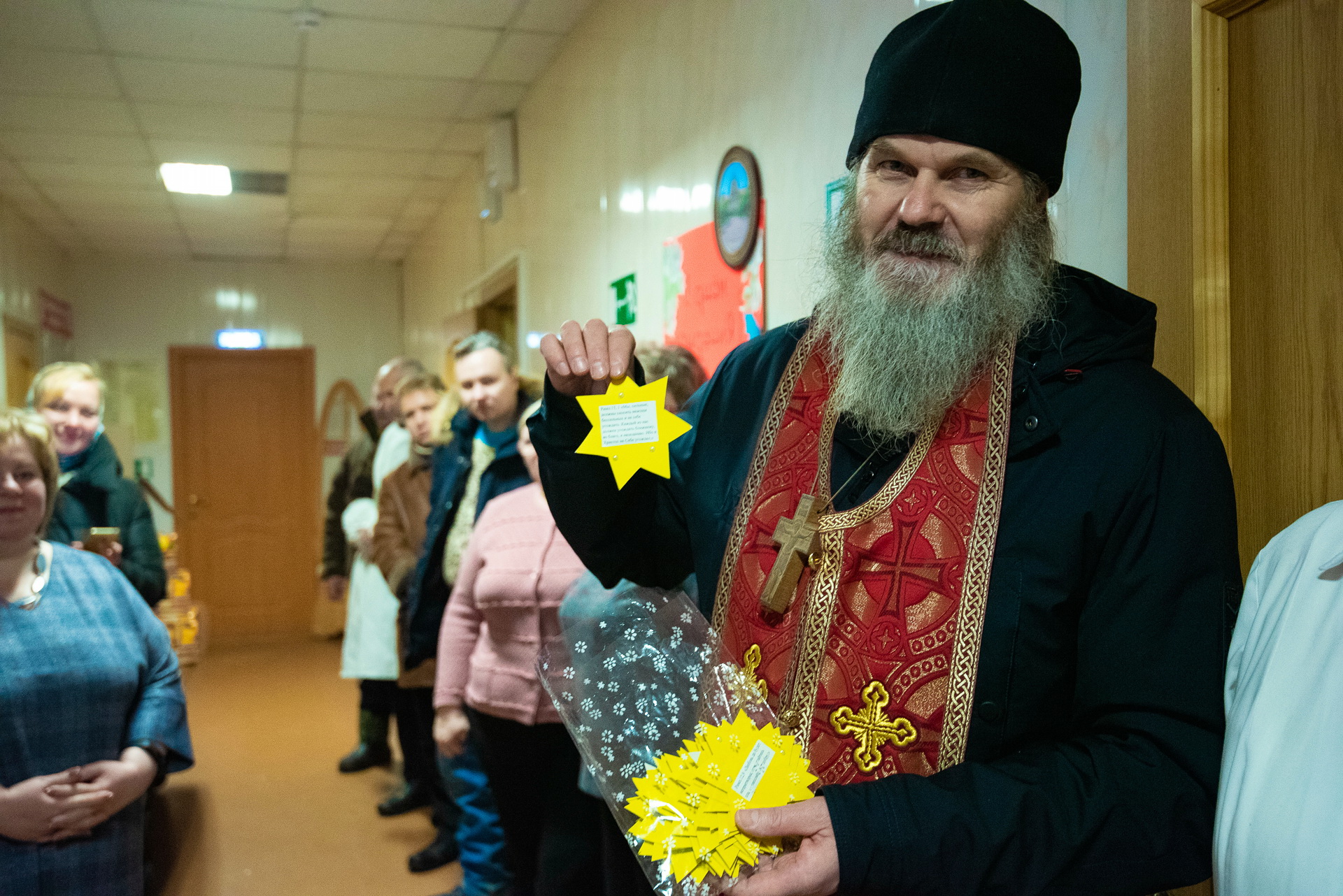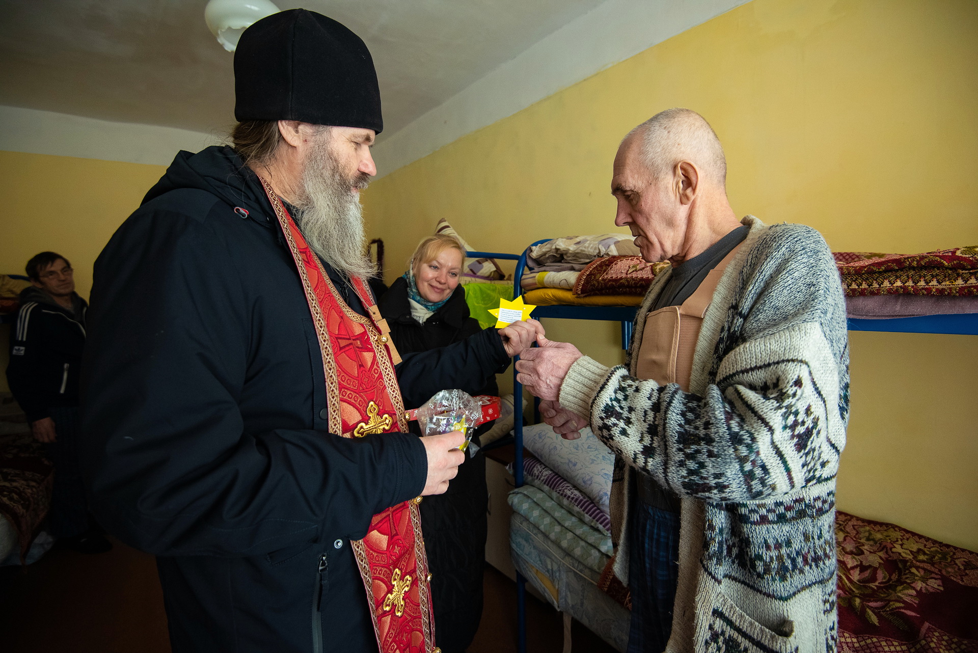 В завершении трапезы по доброй традиции пришедшим людям подарили рождественскую звёздочку с цитатой из Священного Писания и сладкий подарок, переданный благотворителем.
