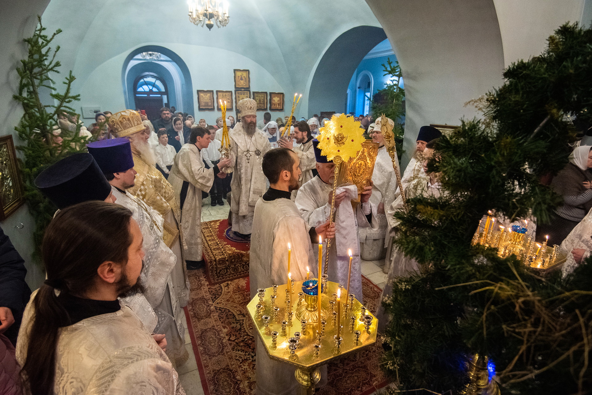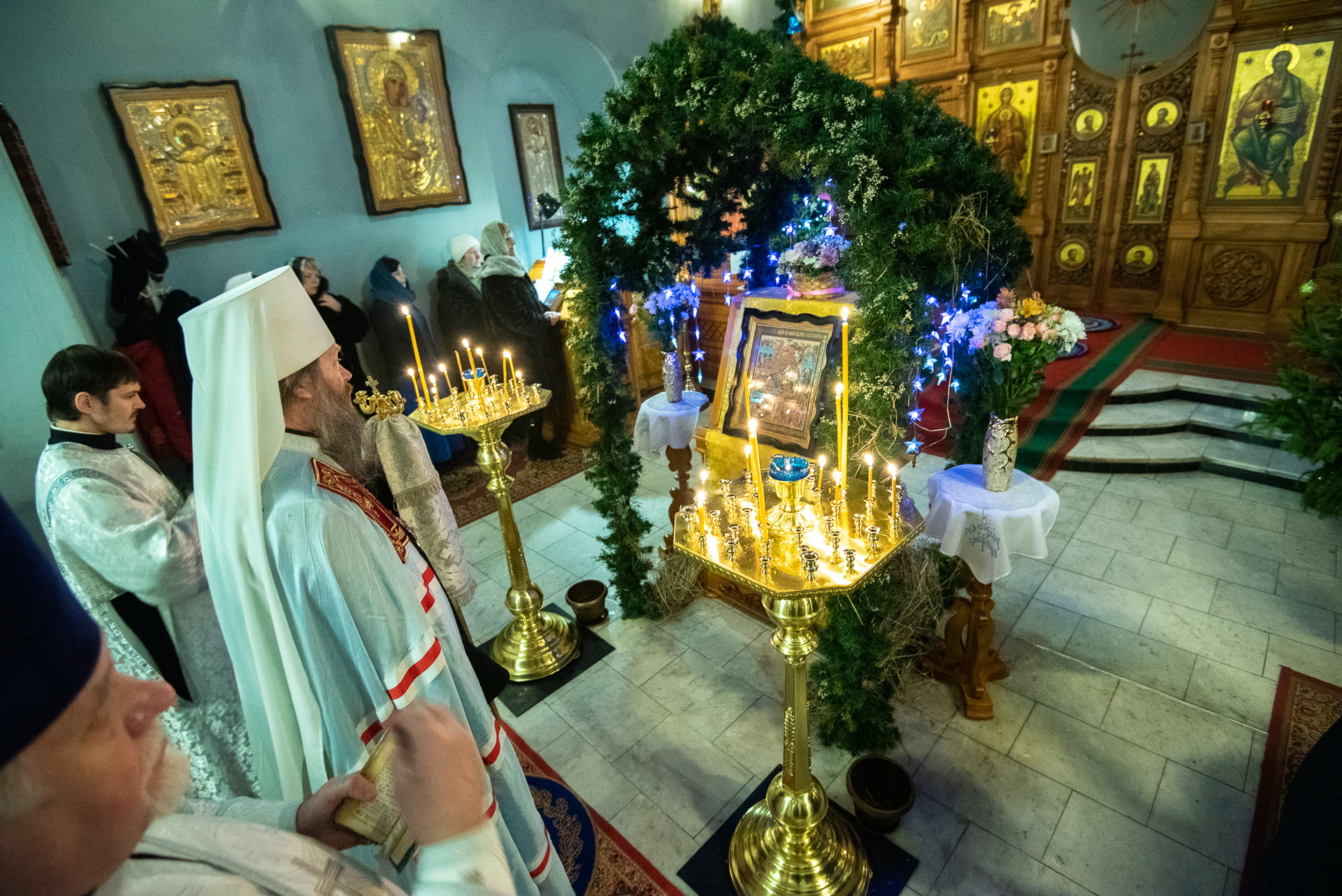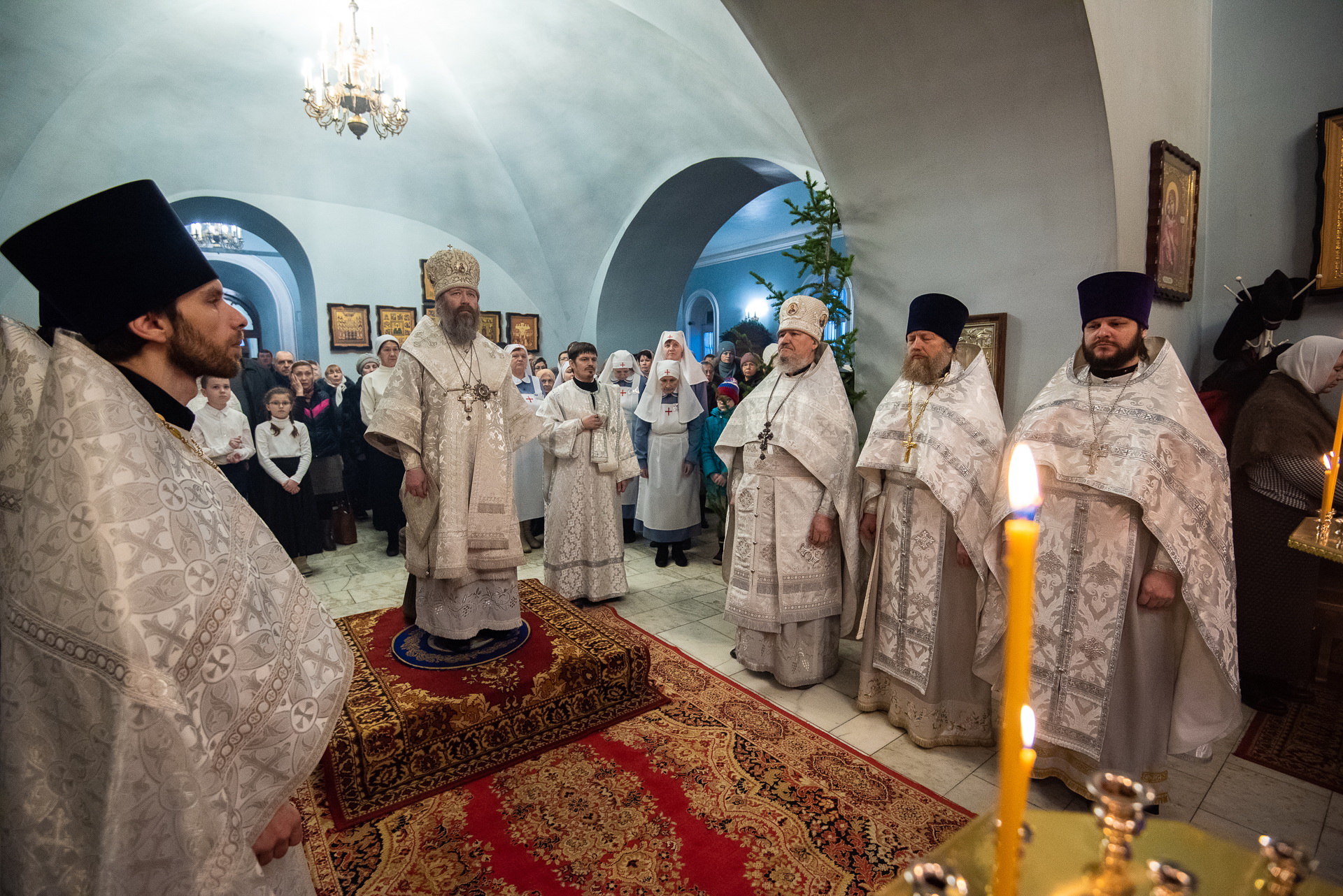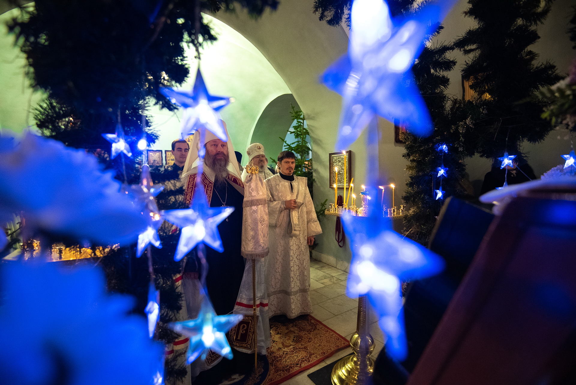 Каждый год Знаменский приход очень красиво украшает храм к празднику Рождества Христова. И сегодня, в день архиерейской литургии, храм смотрелся особенно торжественно. Он весь утопал в рождественских ёлочках и новогодних шарах, а вертеп в главном приделе светился, украшенный синей гирляндой. Уже в самом конце богослужения, словно стараясь усилить всеобщее ликование, солнечный свет залил весь храм.
