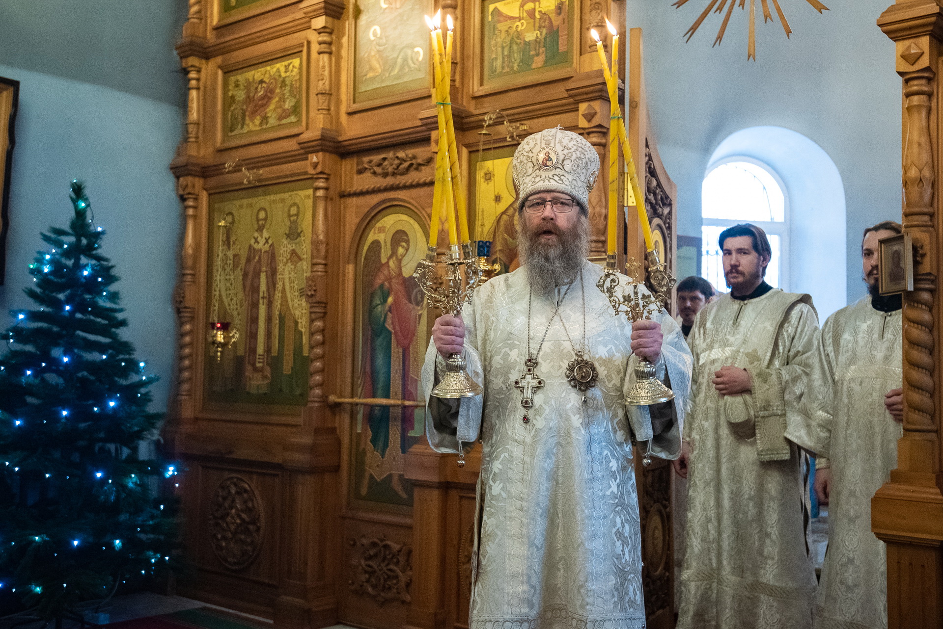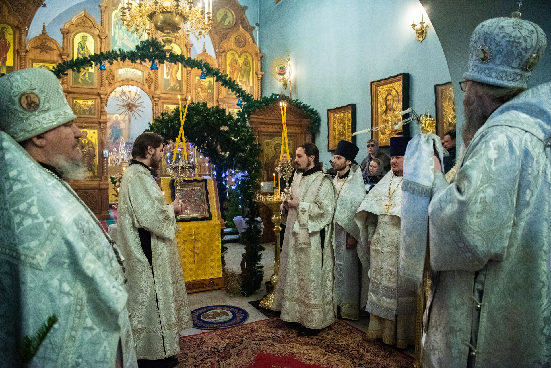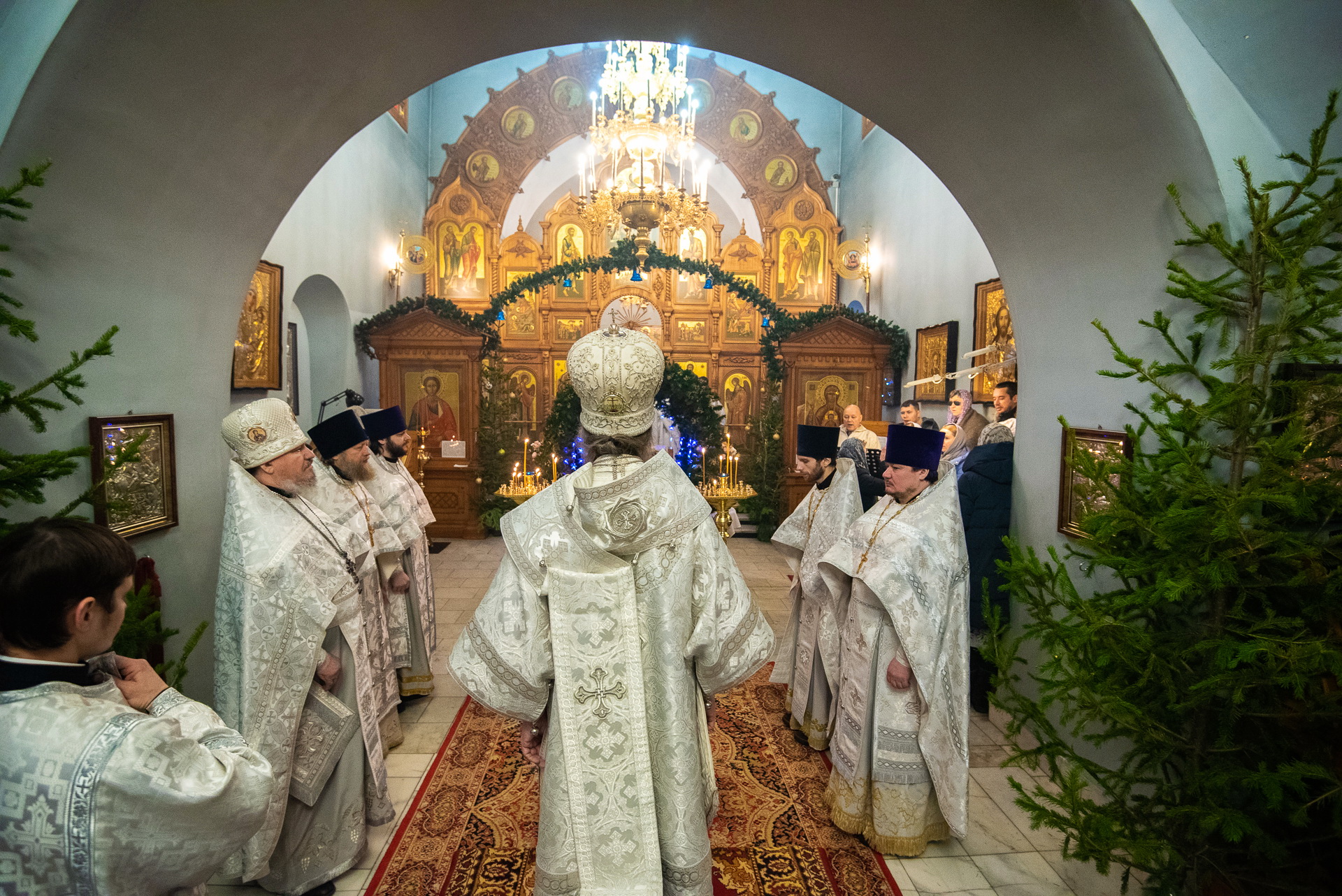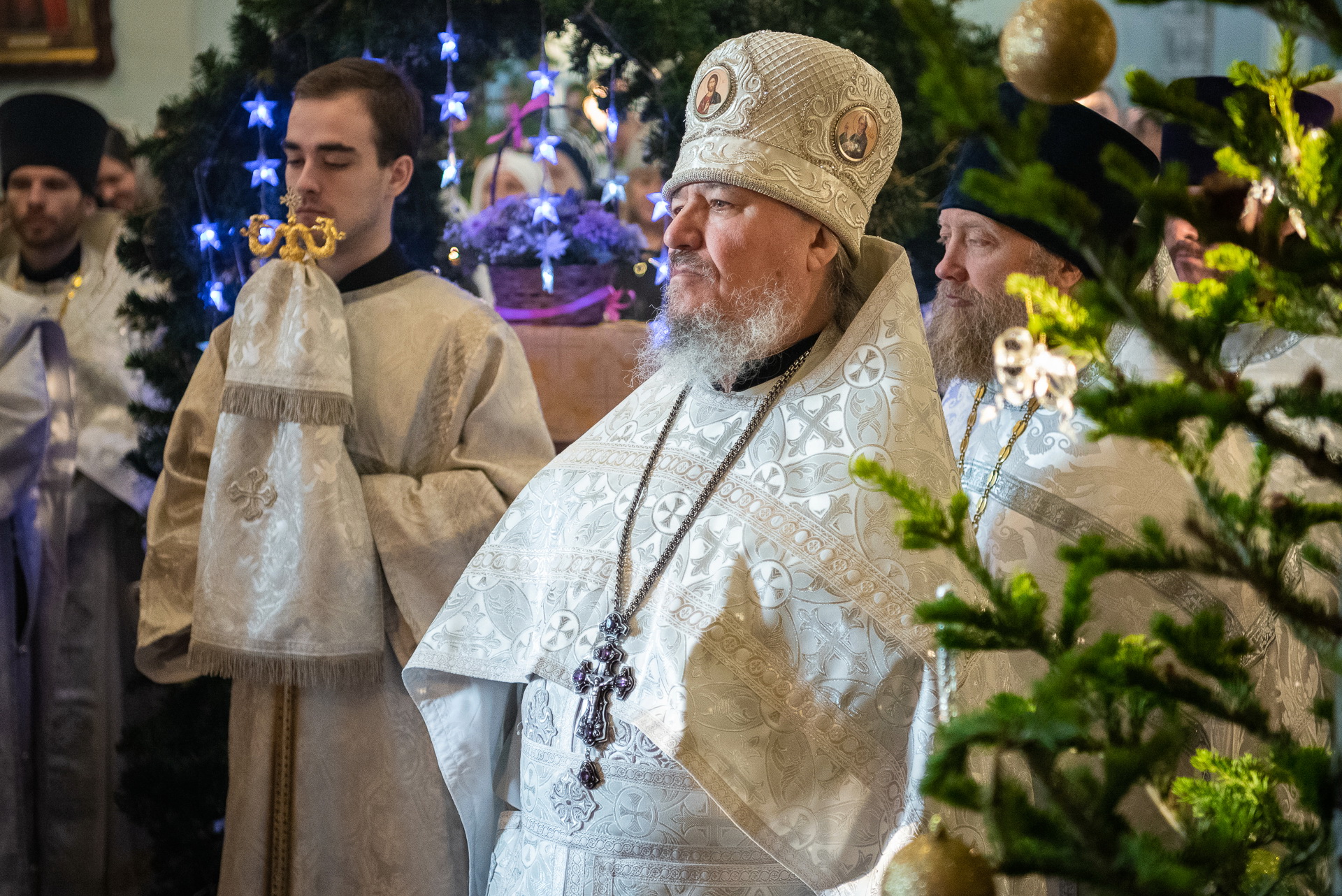 Каждый год Знаменский приход очень красиво украшает храм к празднику Рождества Христова. И сегодня, в день архиерейской литургии, храм смотрелся особенно торжественно. Он весь утопал в рождественских ёлочках и новогодних шарах, а вертеп в главном приделе светился, украшенный синей гирляндой. Уже в самом конце богослужения, словно стараясь усилить всеобщее ликование, солнечный свет залил весь храм.