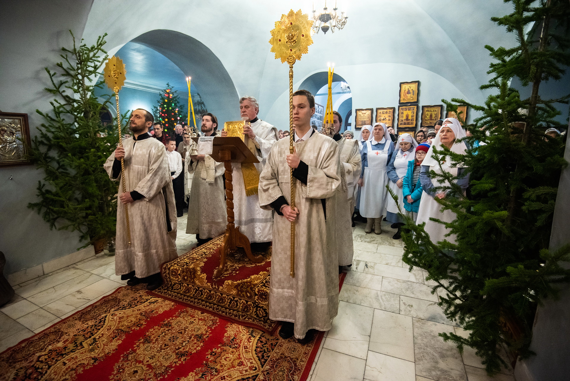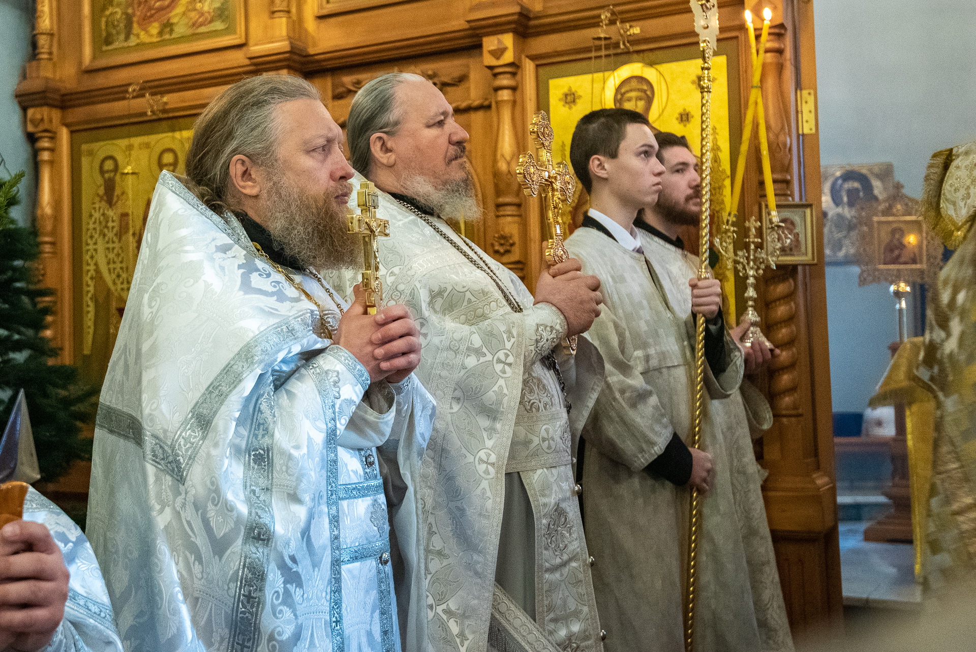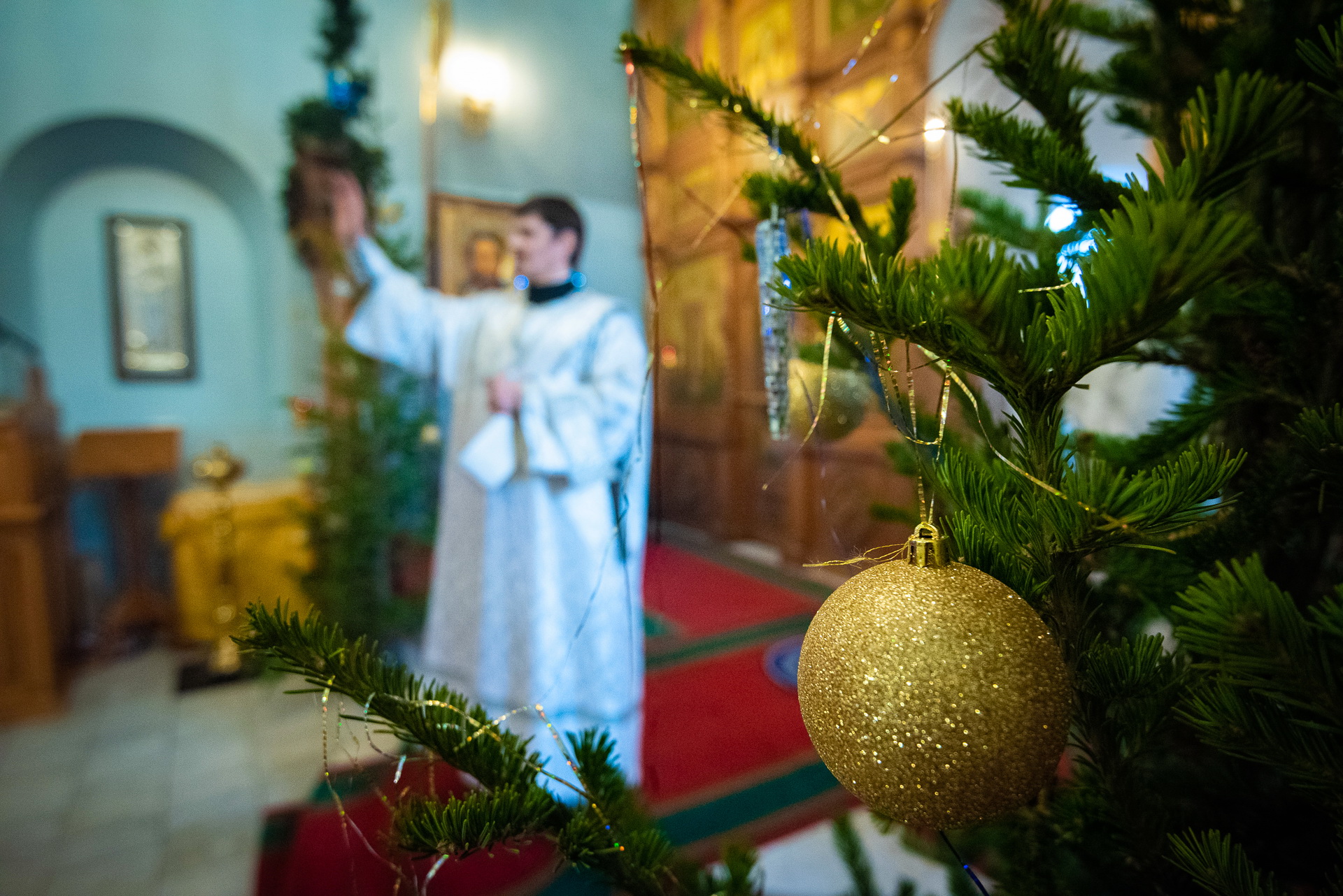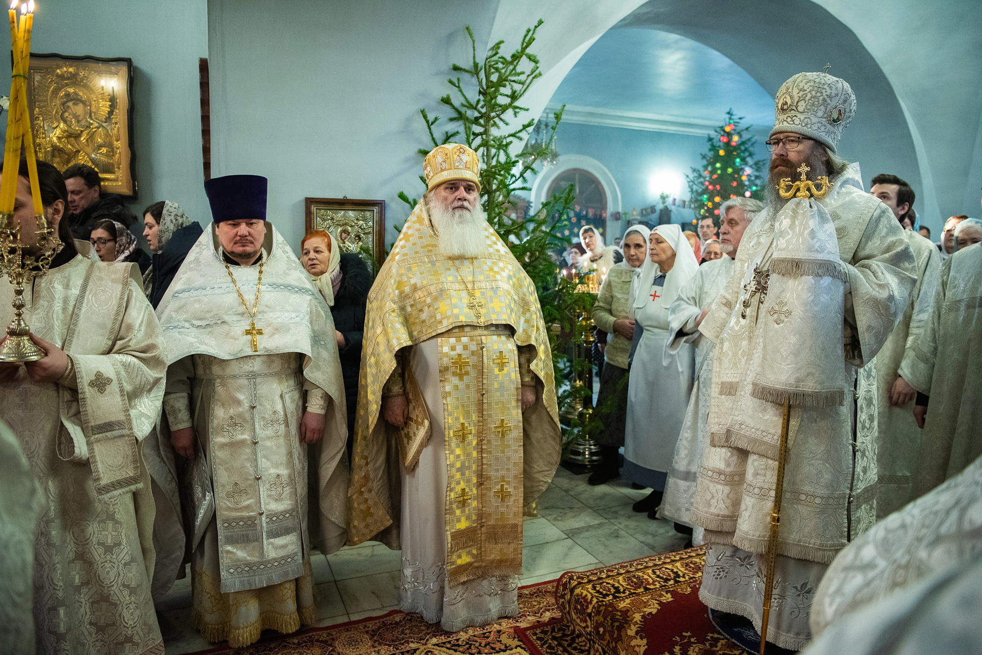 Каждый год Знаменский приход очень красиво украшает храм к празднику Рождества Христова. И сегодня, в день архиерейской литургии, храм смотрелся особенно торжественно. Он весь утопал в рождественских ёлочках и новогодних шарах, а вертеп в главном приделе светился, украшенный синей гирляндой. Уже в самом конце богослужения, словно стараясь усилить всеобщее ликование, солнечный свет залил весь храм.
