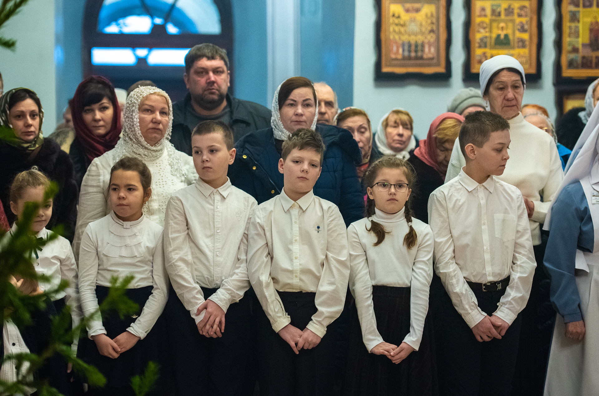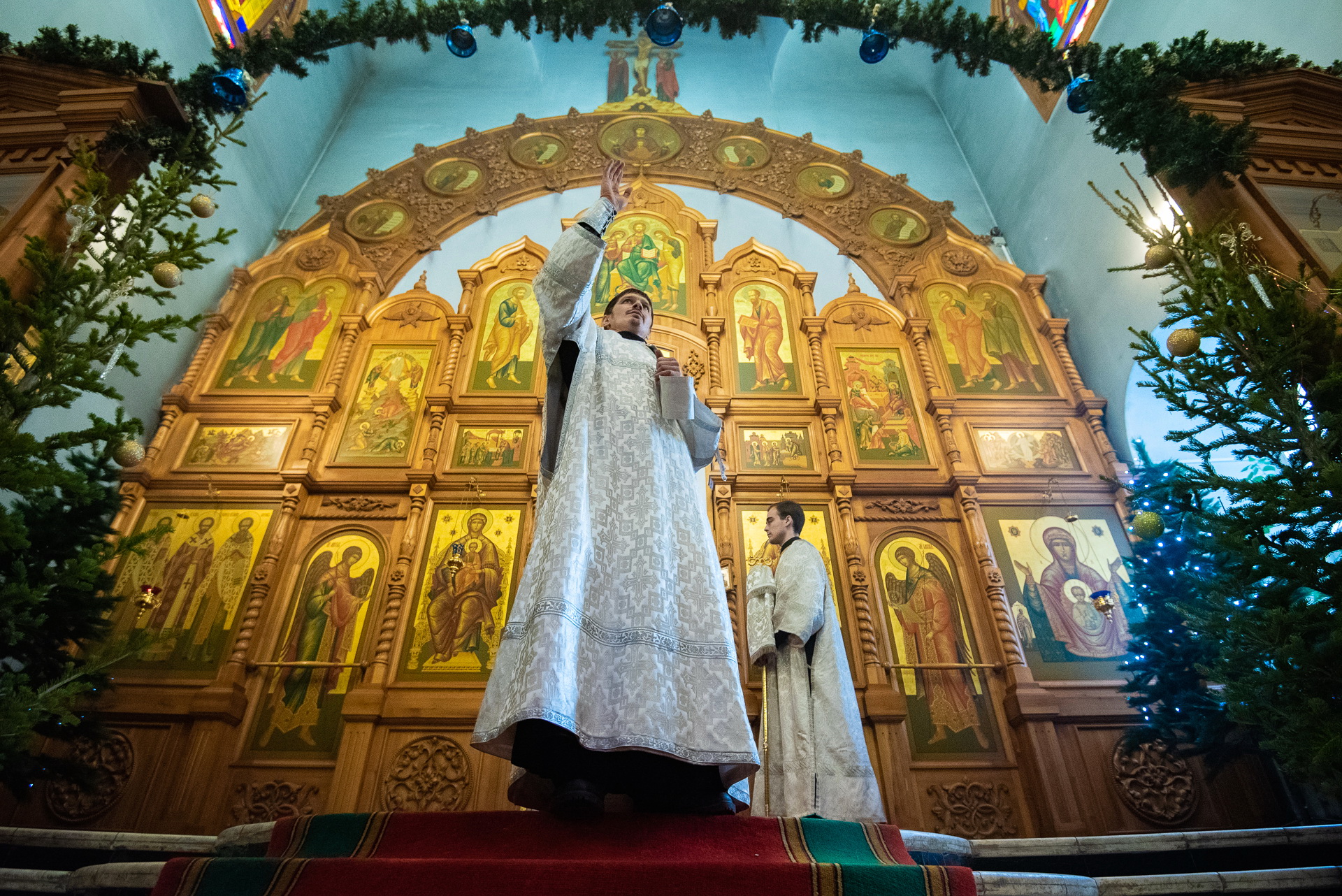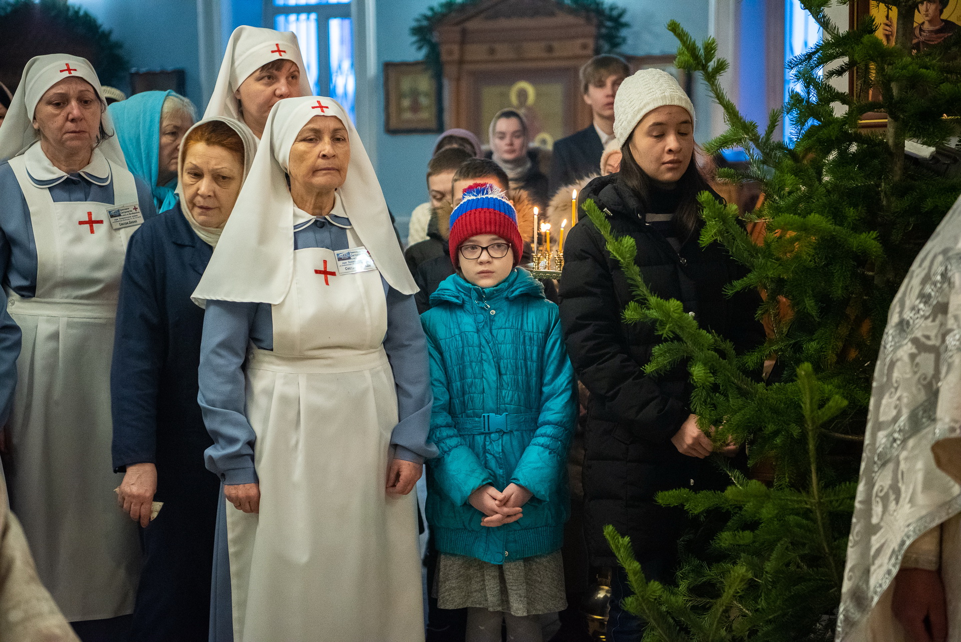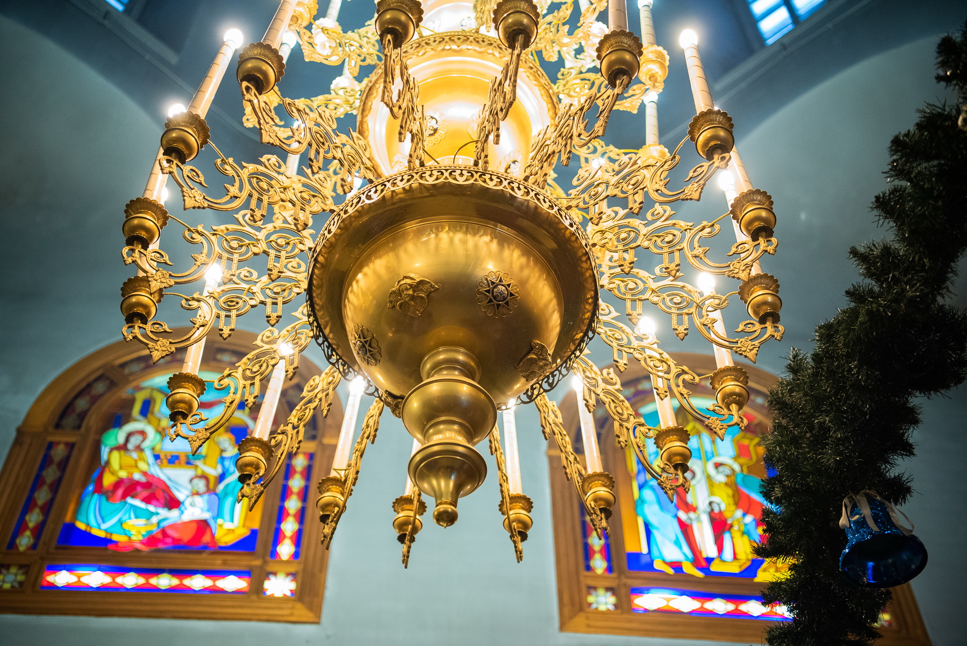 Каждый год Знаменский приход очень красиво украшает храм к празднику Рождества Христова. И сегодня, в день архиерейской литургии, храм смотрелся особенно торжественно. Он весь утопал в рождественских ёлочках и новогодних шарах, а вертеп в главном приделе светился, украшенный синей гирляндой. Уже в самом конце богослужения, словно стараясь усилить всеобщее ликование, солнечный свет залил весь храм.
